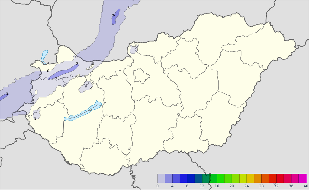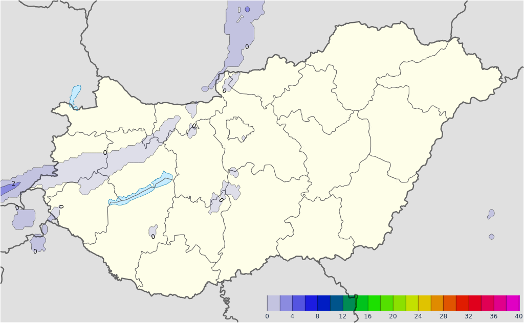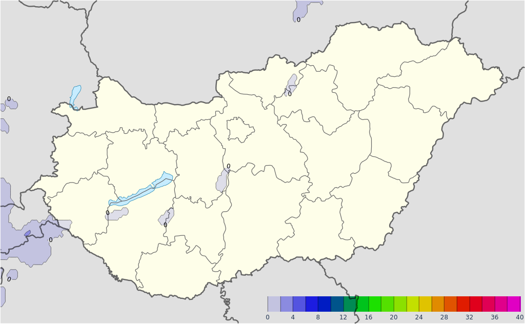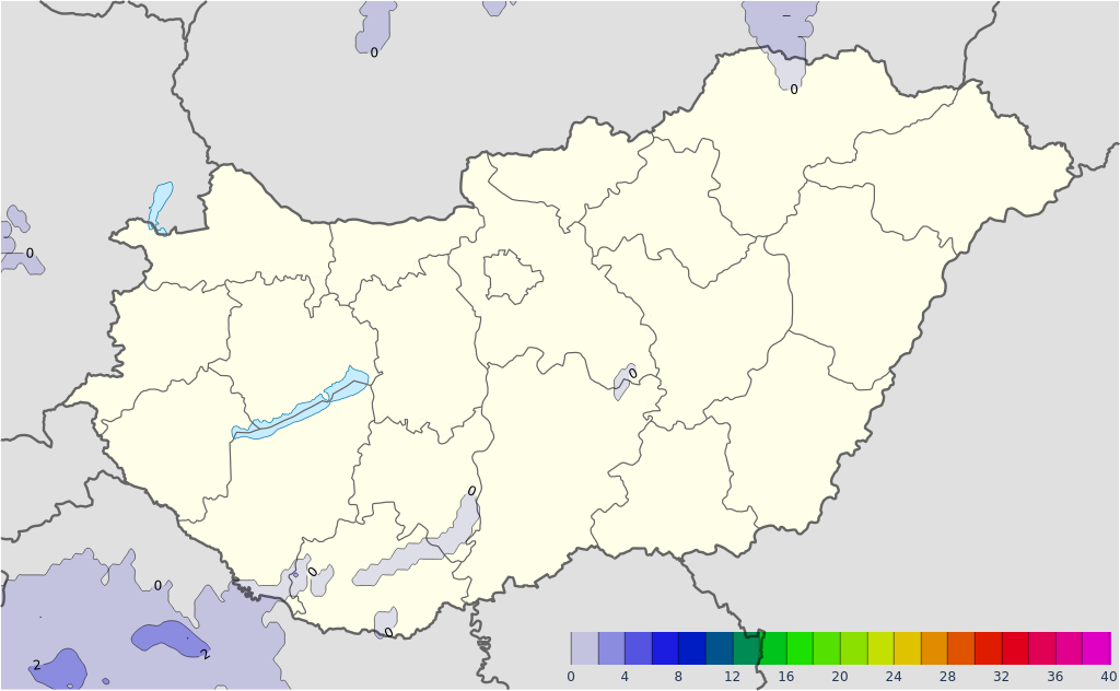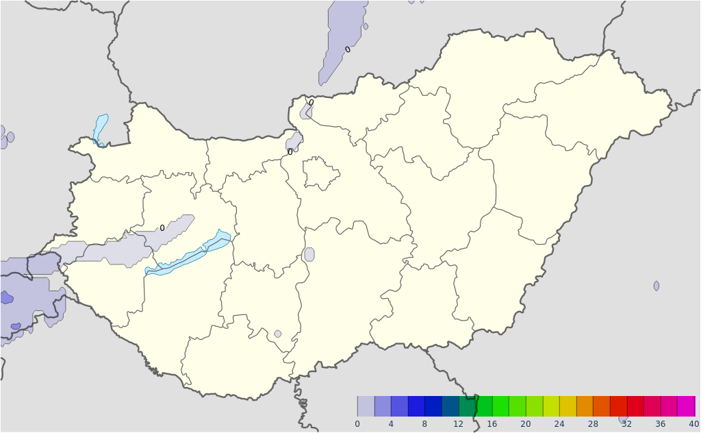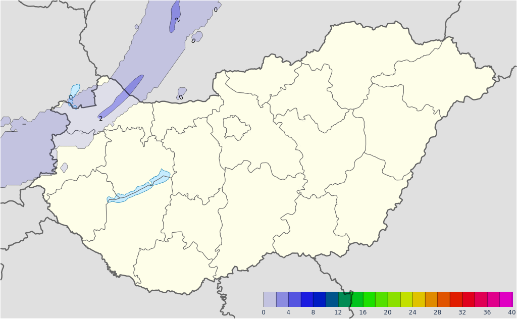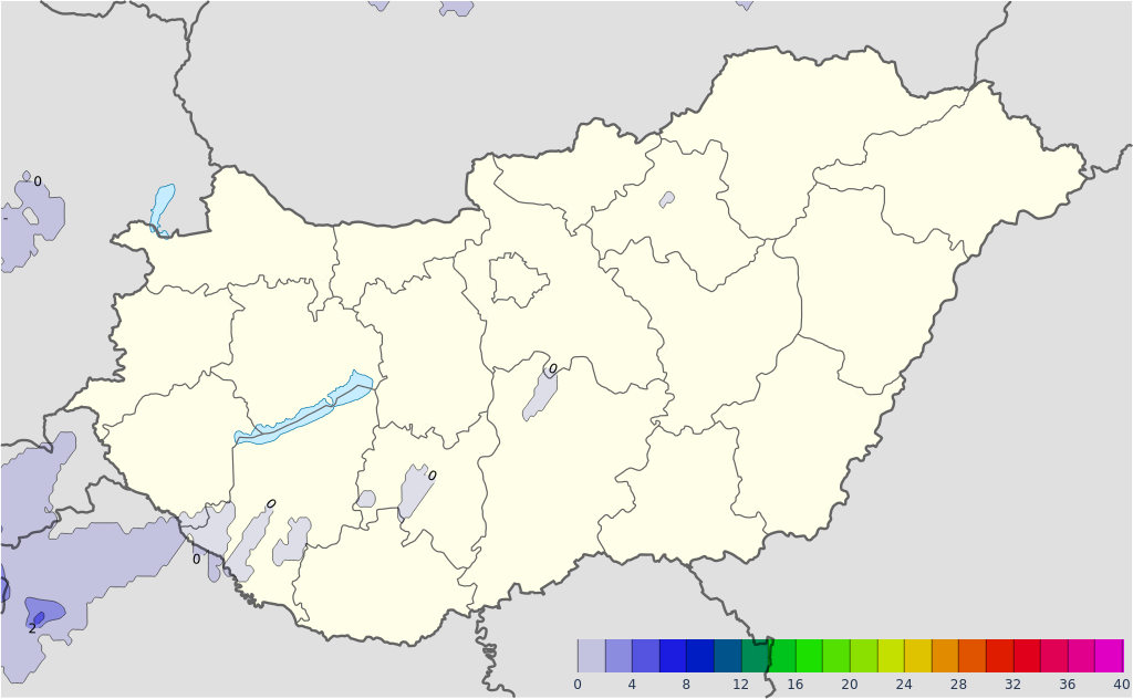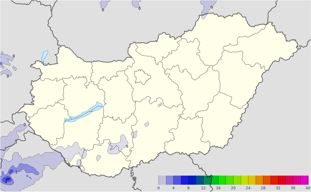 A térképek a csapadék intenzitását jelöli. A világoskék árnyalatok gyenge, a sötétebbek erősebb csapadékintenzitást jeleznek.