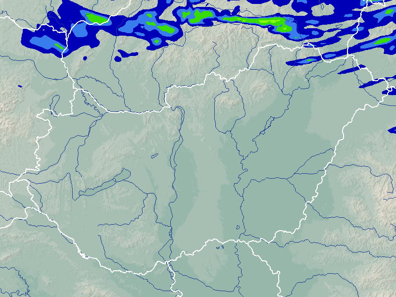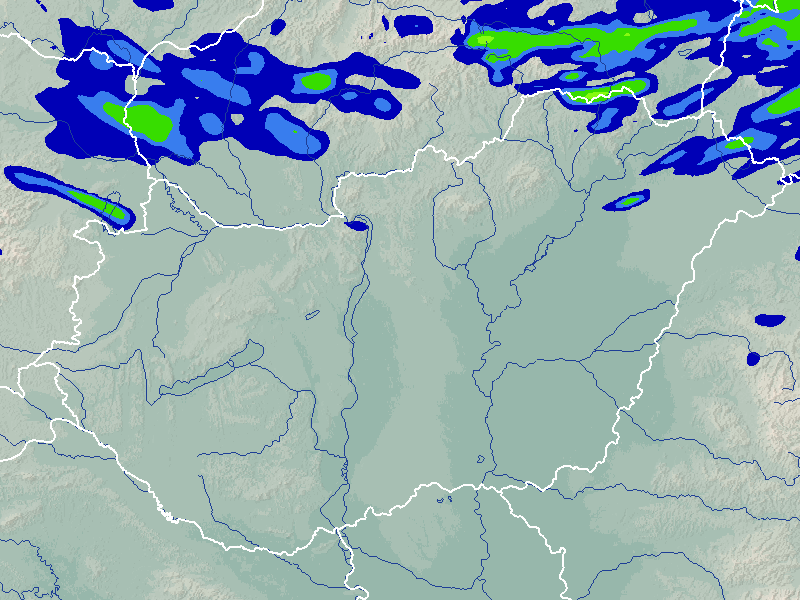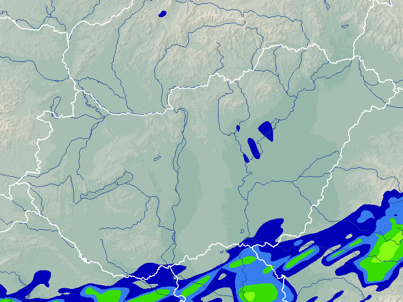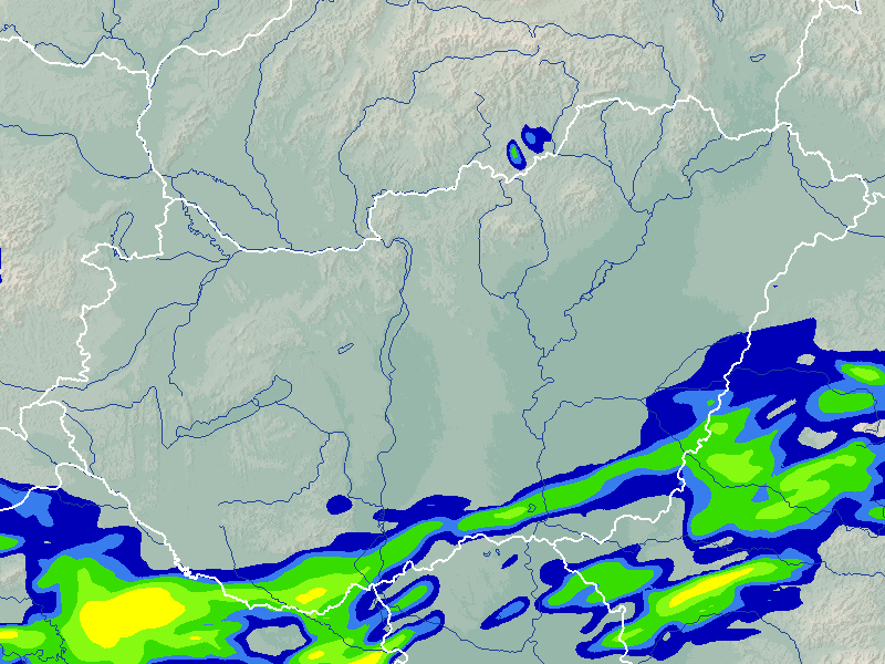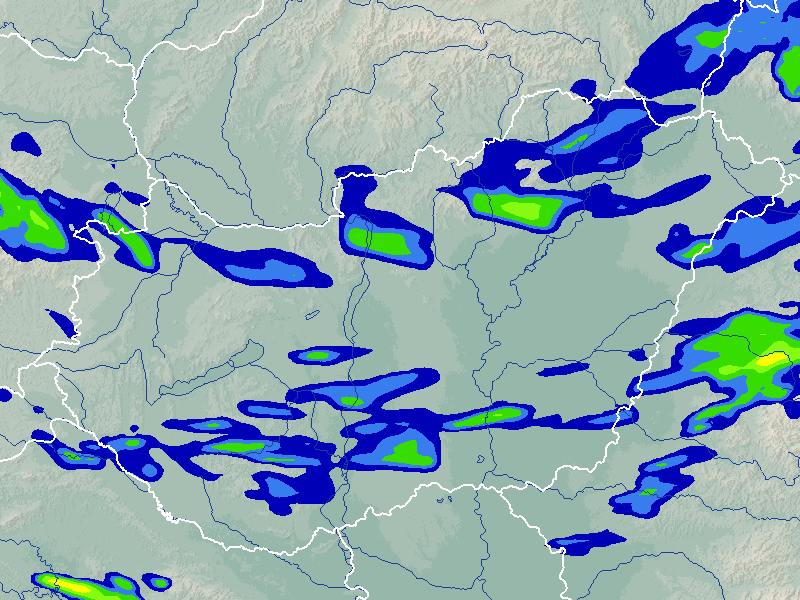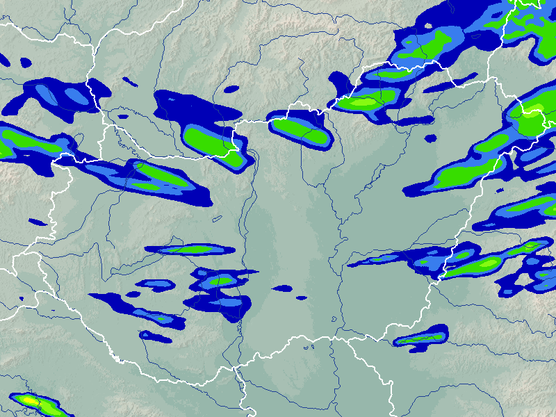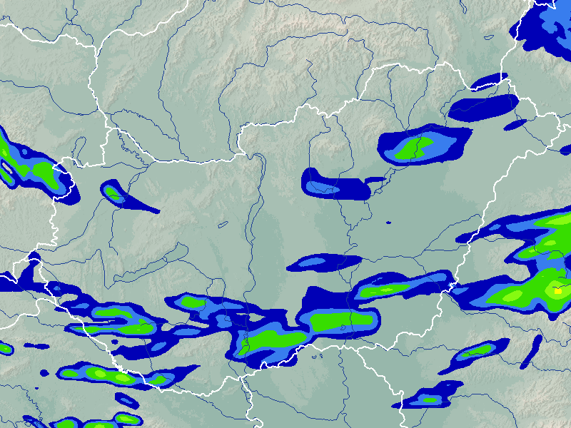 A térkép a csapadék intenzitását jelöli. A kékes árnyalatok gyenge, a zöldes közepes, míg a sárga és piros színek erős csapadékintenzitást jeleznek.