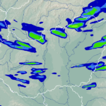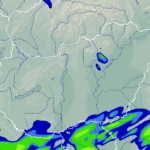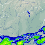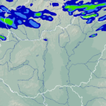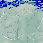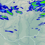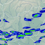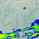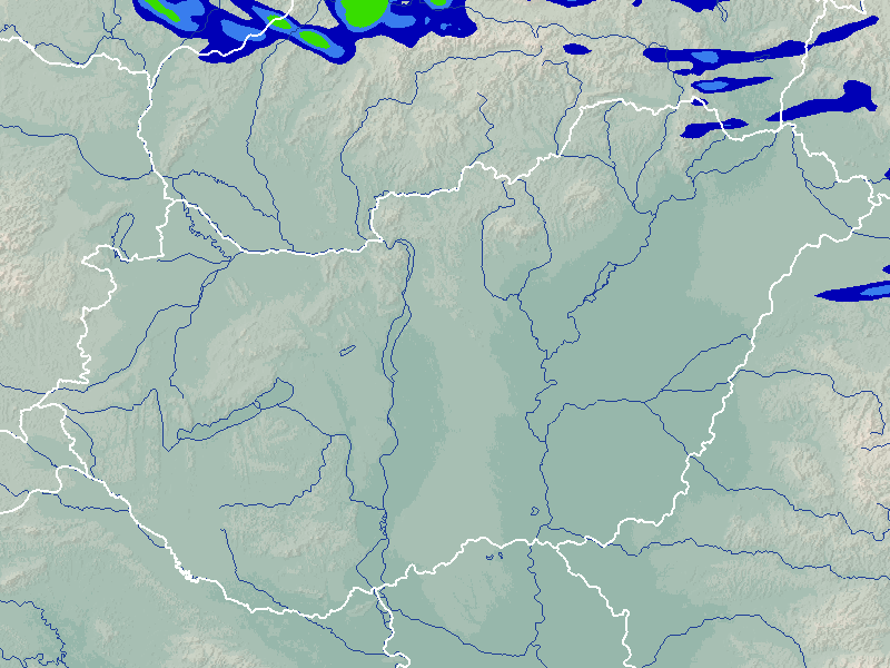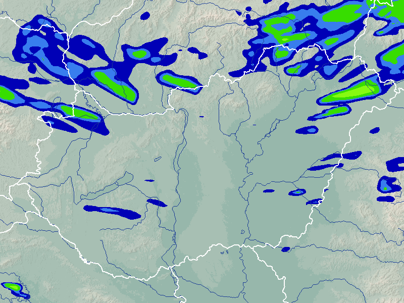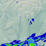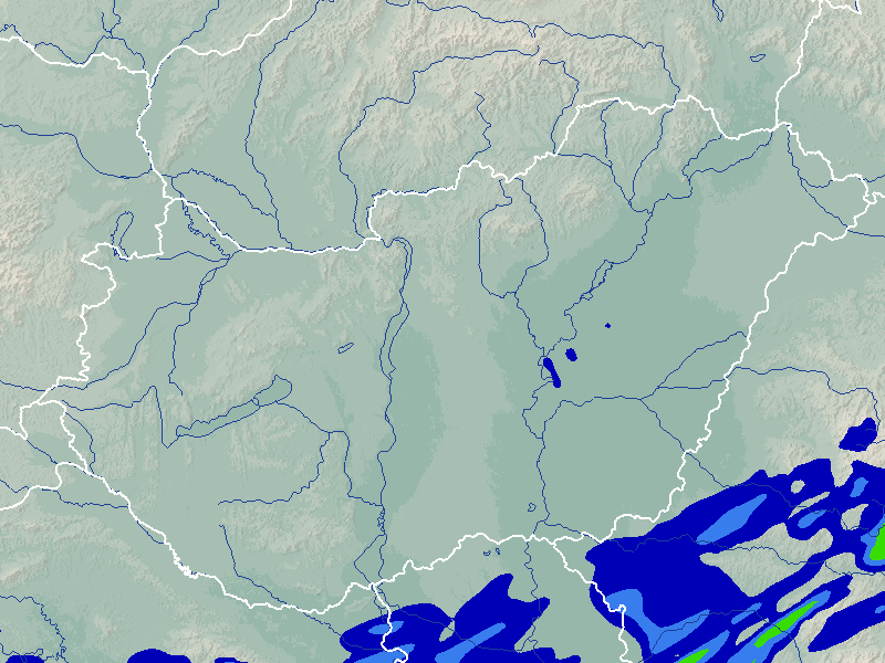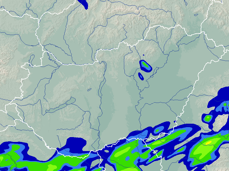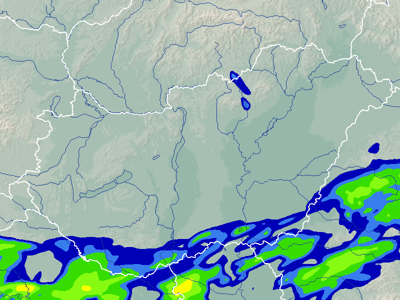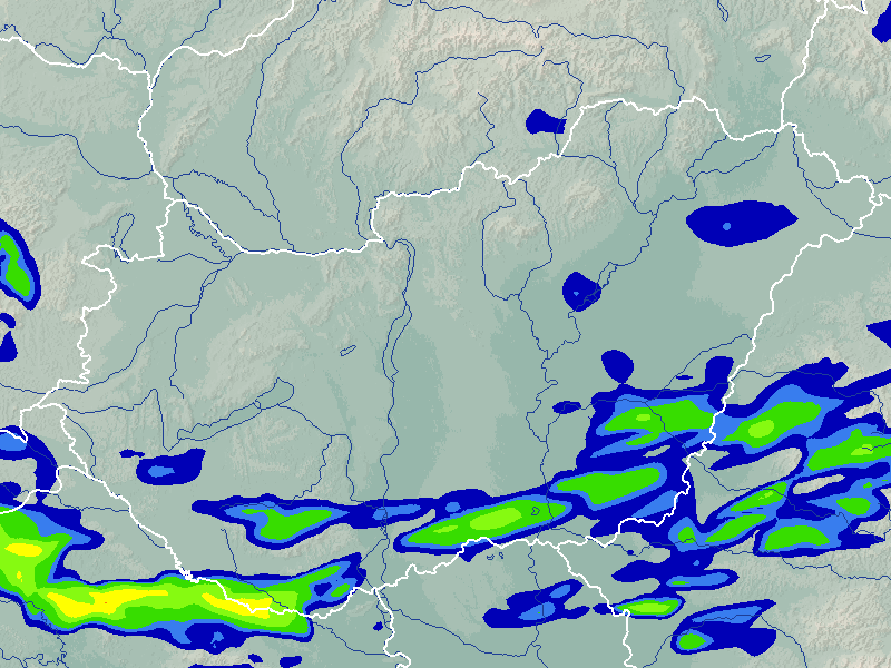 A térkép a csapadék intenzitását jelöli. A kékes árnyalatok gyenge, a zöldes közepes, míg a sárga és piros színek erős csapadékintenzitást jeleznek.