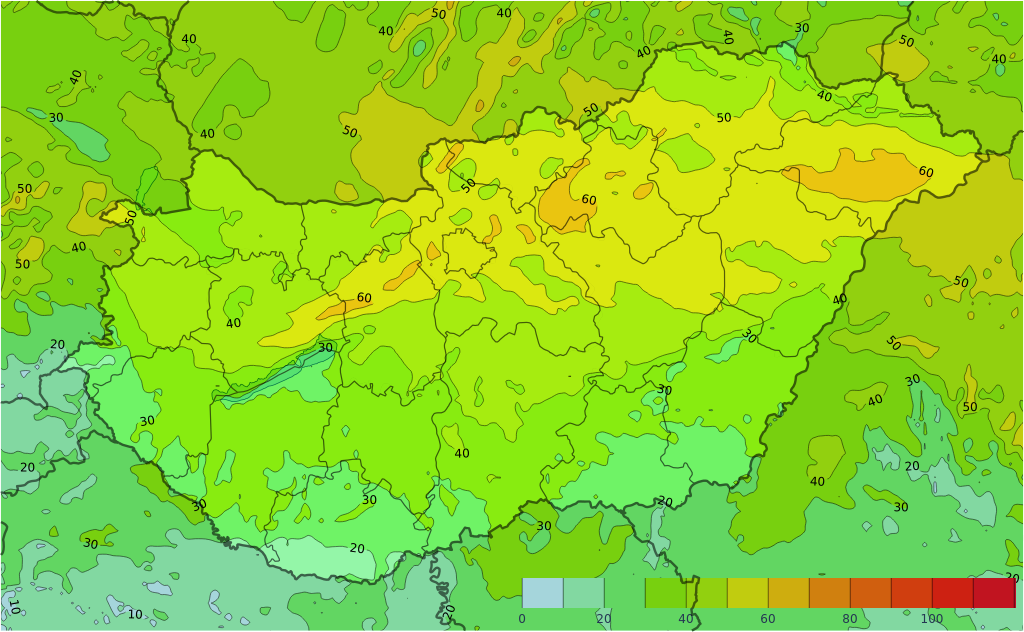 Az első térképek a csapadék intenzitását jelölik. A kékes árnyalatok gyenge, a zöldes közepes, míg a sárga és piros színek erős csapadékintenzitást jeleznek. A hőmérséklet térképeken a lilás árnyalatok 35 fok feletti, a pirosas árnyalatok 25-35 fok közötti, sárga-narancs árnyalatok 15-25 fok közötti, míg a világoszöld 10-15 fok közötti hőmérsékletet jelölnek.