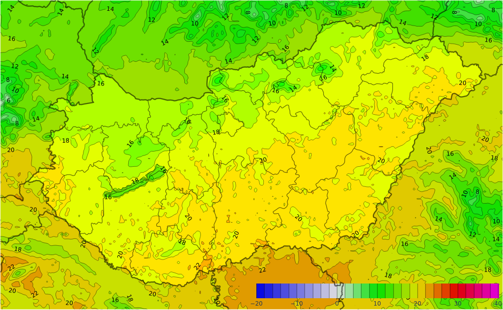 Nagyrészt gomolyfelhős, napos idő várható, de északnyugat felől hidegfront érkezik, amely napközben főként az északnyugati tájakon okozhat – néhol tartósan – felhős időt. Utóbbi területen többfelé valószínű zömmel eső, zápor, míg a front mentén, illetve annak előterében zivatarok is kialakulhatnak. Legkisebb eséllyel a déli országrészben eshet. A délnyugati szél többfelé megélénkül, megerősödik, majd az északnyugatira forduló szél átmenetileg több helyen viharossá fokozódik. Emellett zivatarok környezetében is lehetnek viharos széllökések. A legmagasabb nappali hőmérséklet 22 és 35 fok között várható, északnyugaton mérhetjük a legalacsonyabb, míg délkeleten a legmagasabb értékeket. A front mögött napközben gyorsan csökken a hőmérséklet. Késő este 15, 22 fok valószínű.