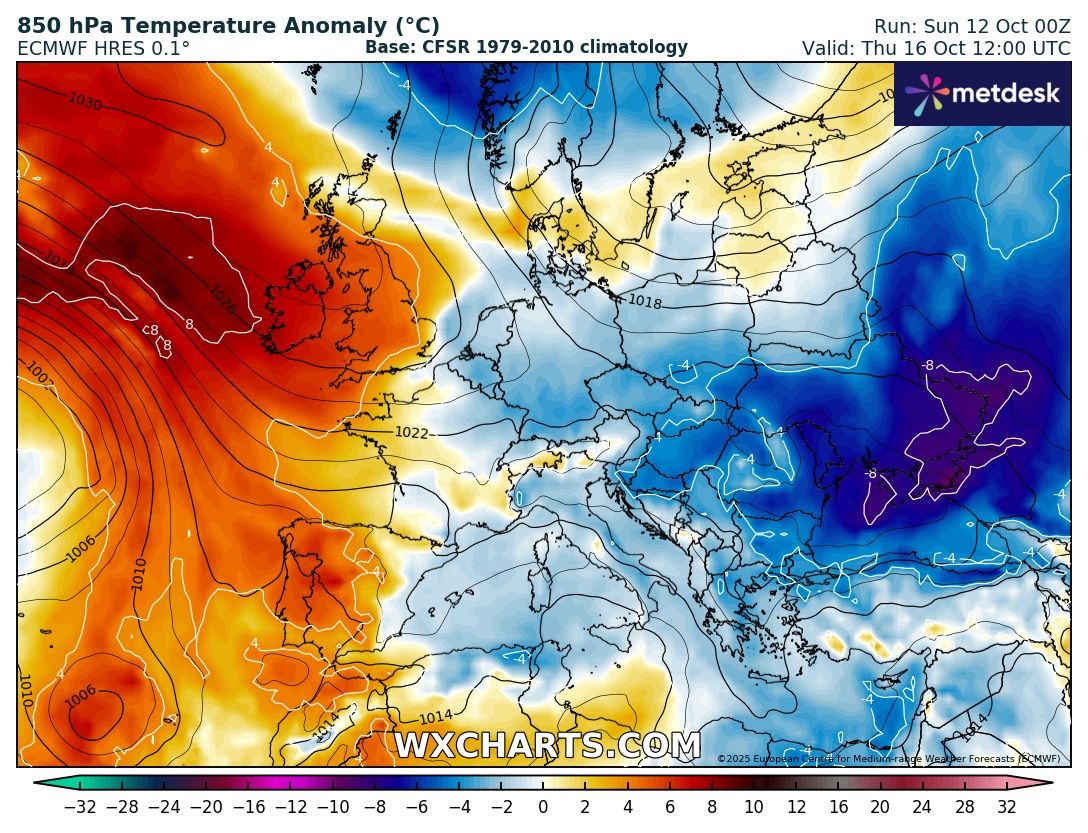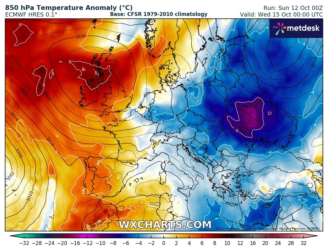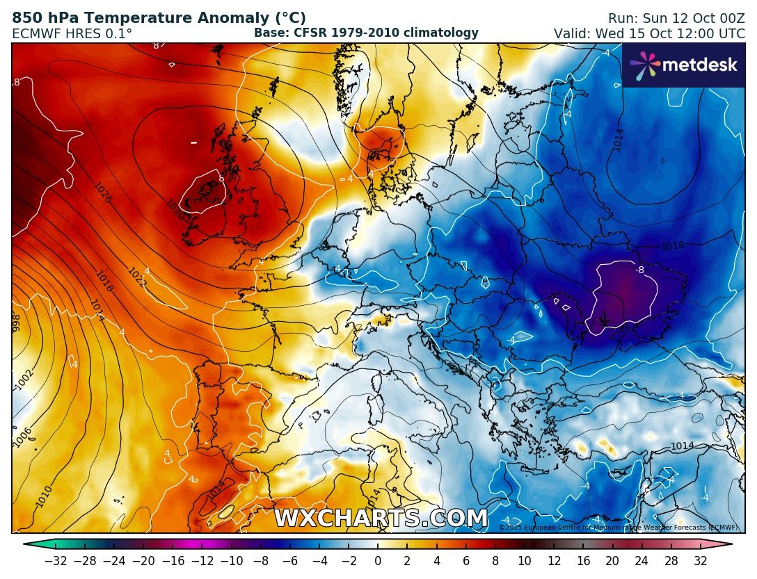 A térképek a 850 hPa-os szinten mutatják a szokásos hőmérséklettől való eltérést. Ez nagyjából 1500 méteres magasságot jelent.
