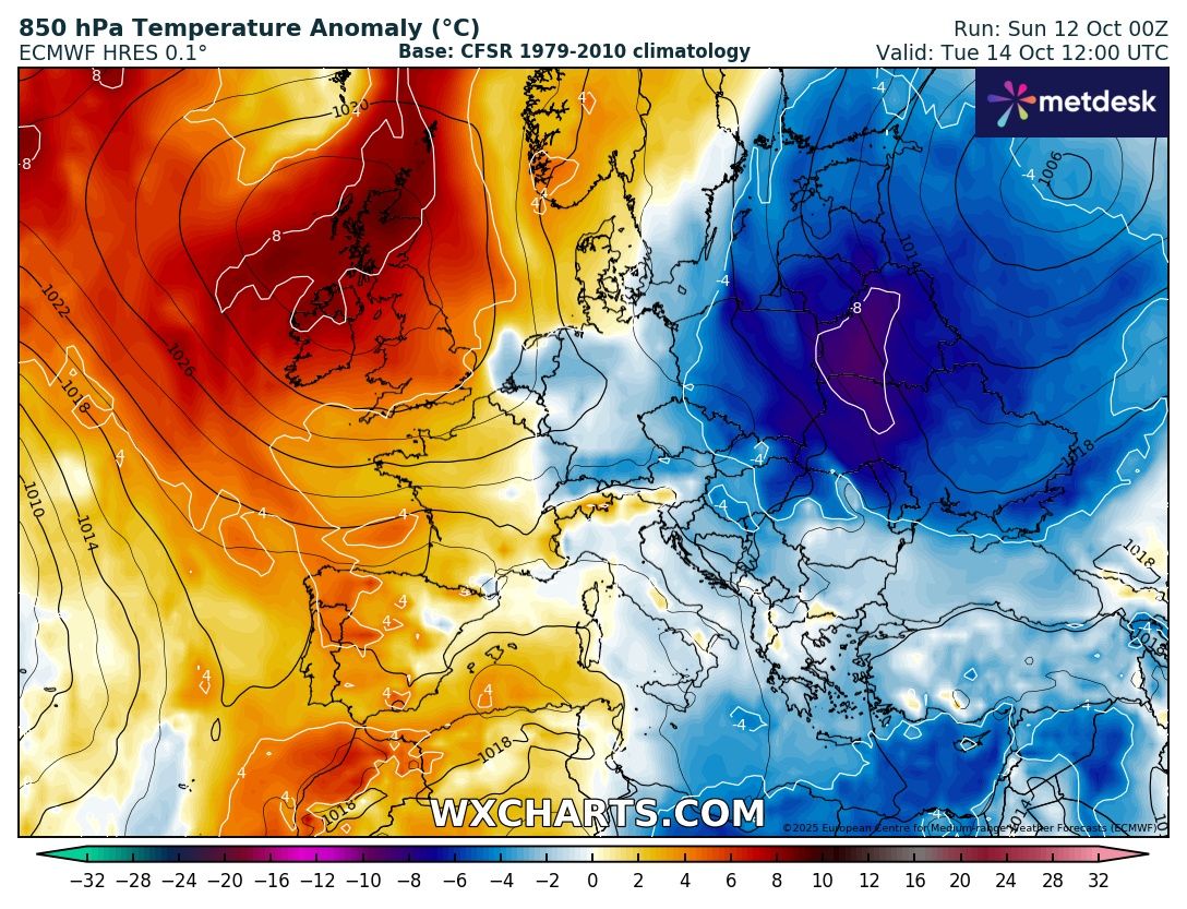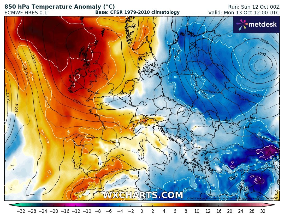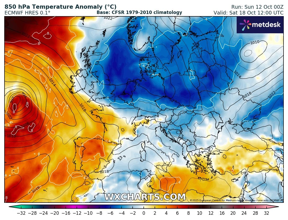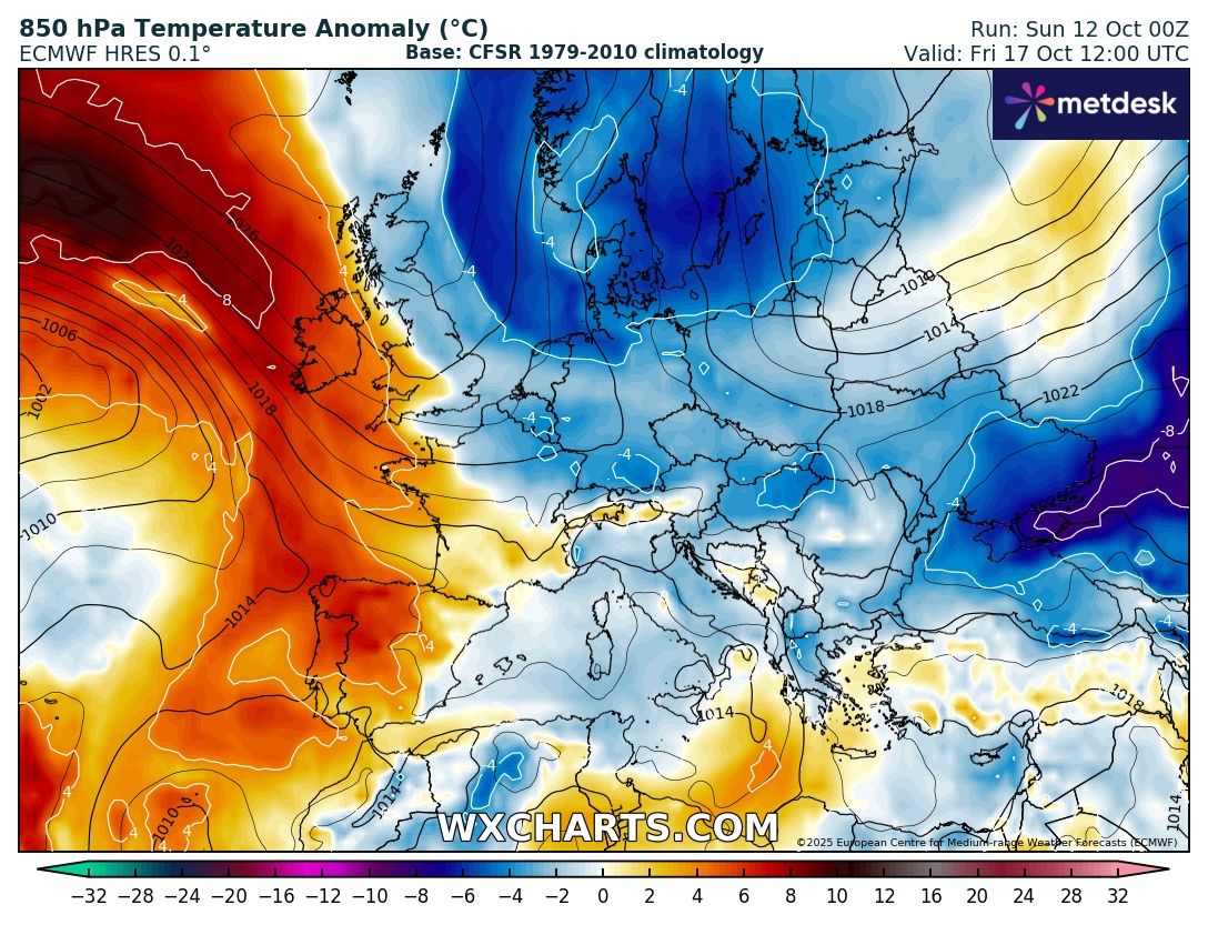 A térképek a 850 hPa-os szinten mutatják a szokásos hőmérséklettől való eltérést. Ez nagyjából 1500 méteres magasságot jelent.