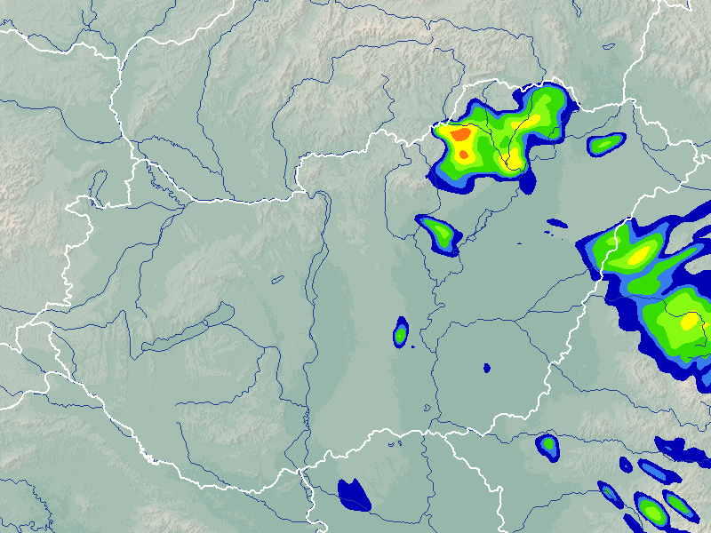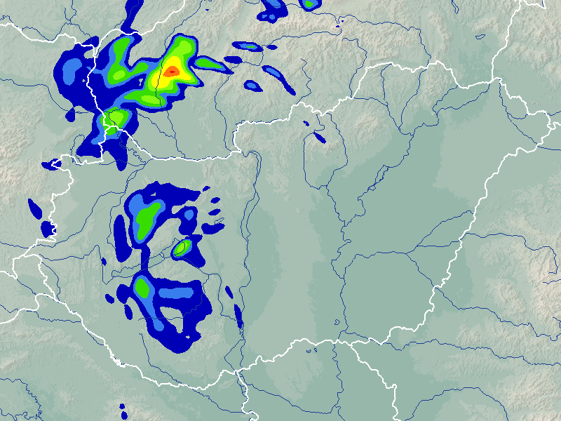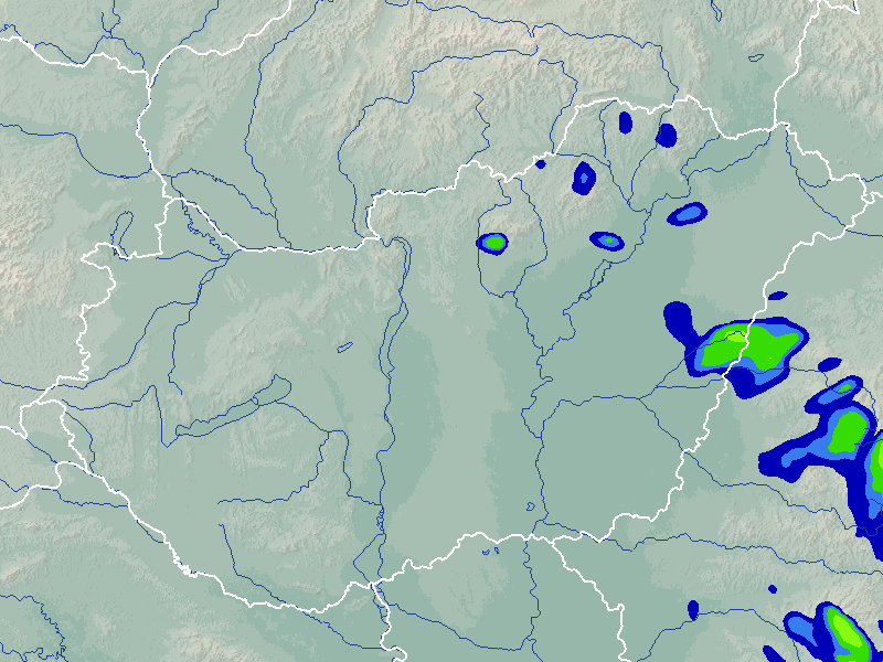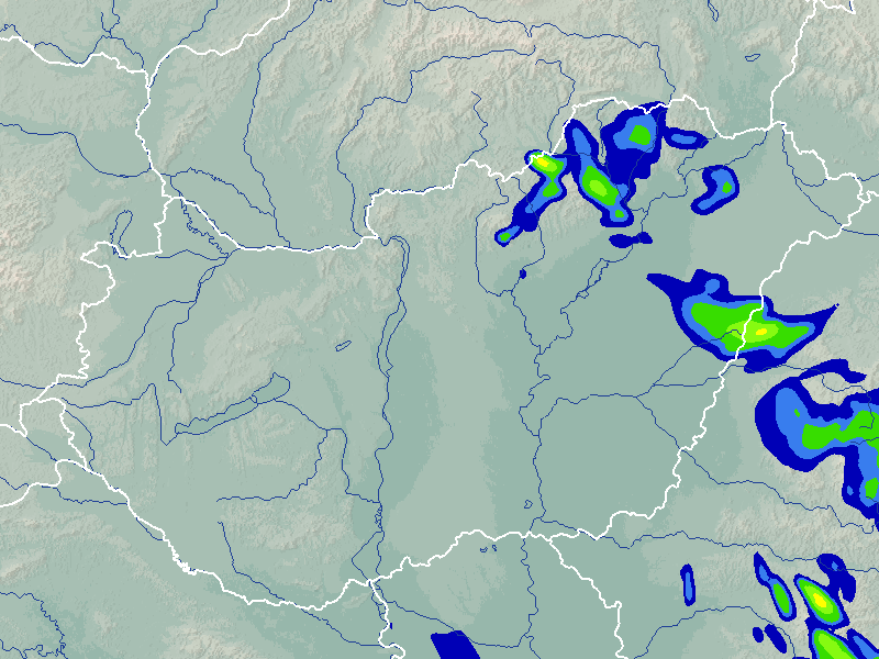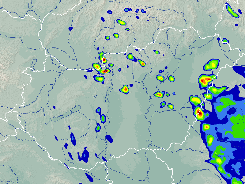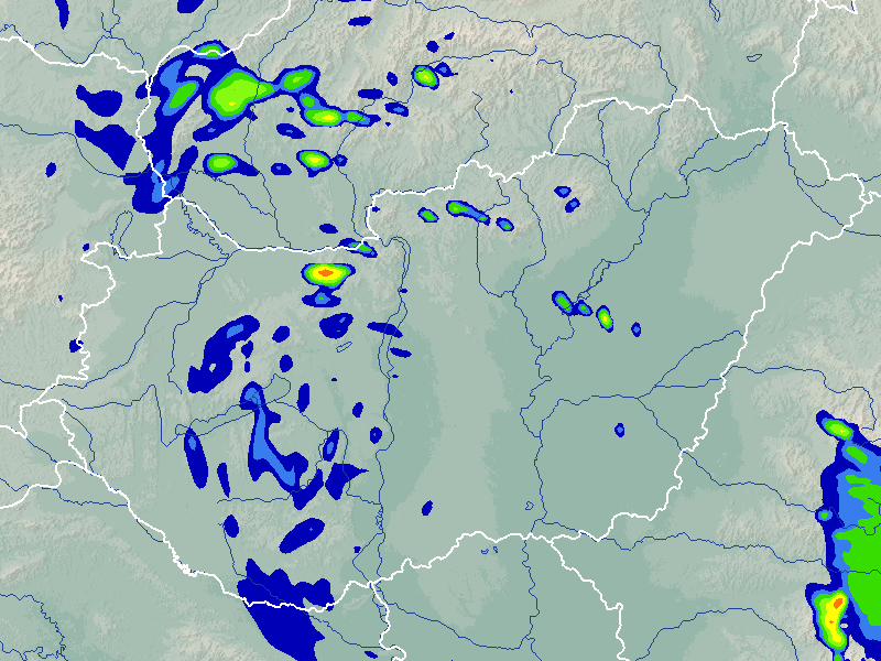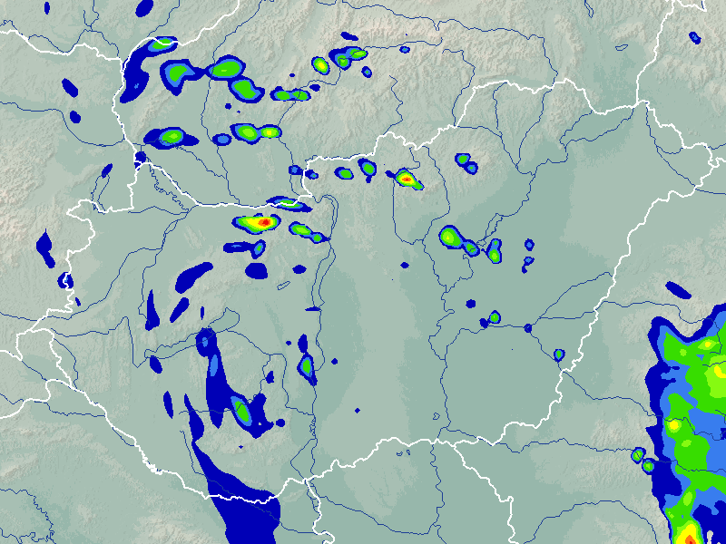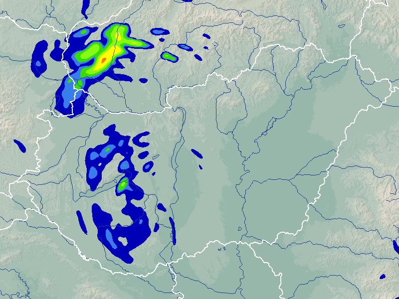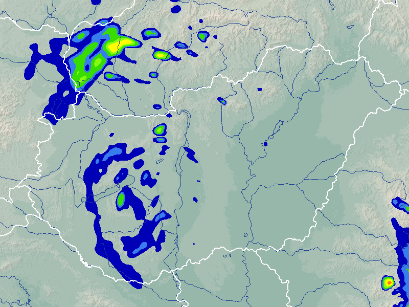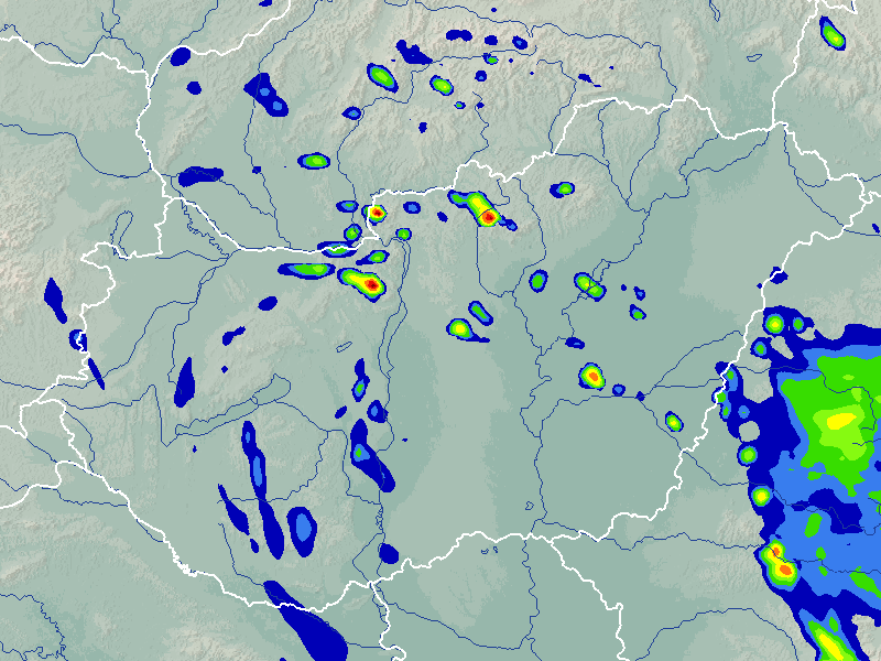 A térképek a csapadék intenzitását jelölik. A kékes árnyalatok gyenge, a zöldes közepes, míg a sárga és piros színek erős csapadékintenzitást jeleznek. Záporos csapadék miatt a gócok elhelyezkedése változhat, de a tendencia így is jól megfigyelhető.