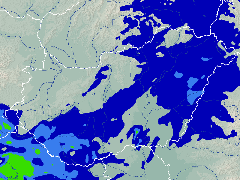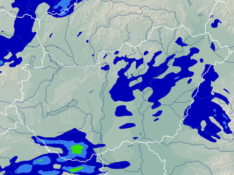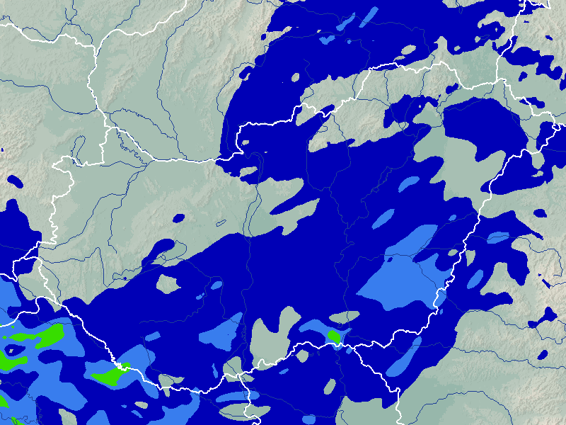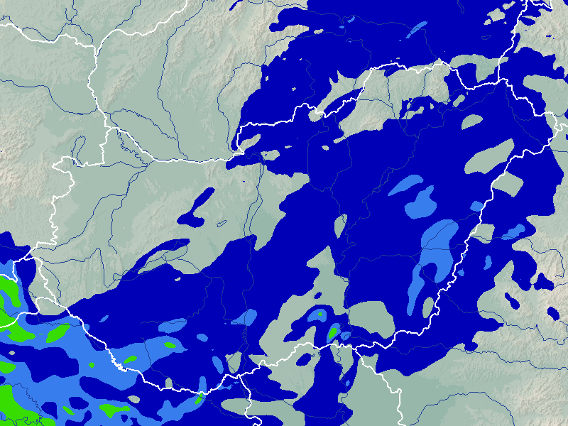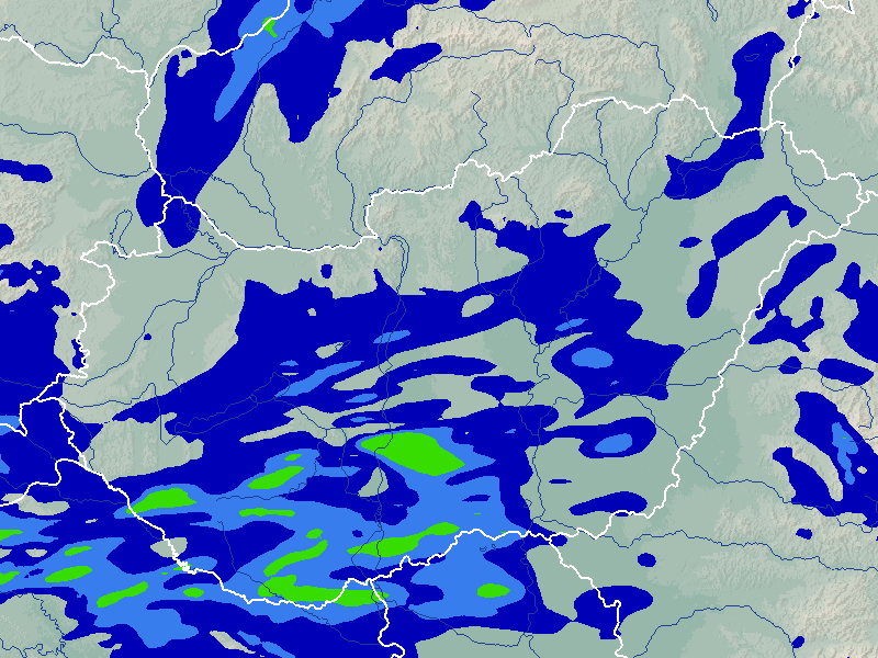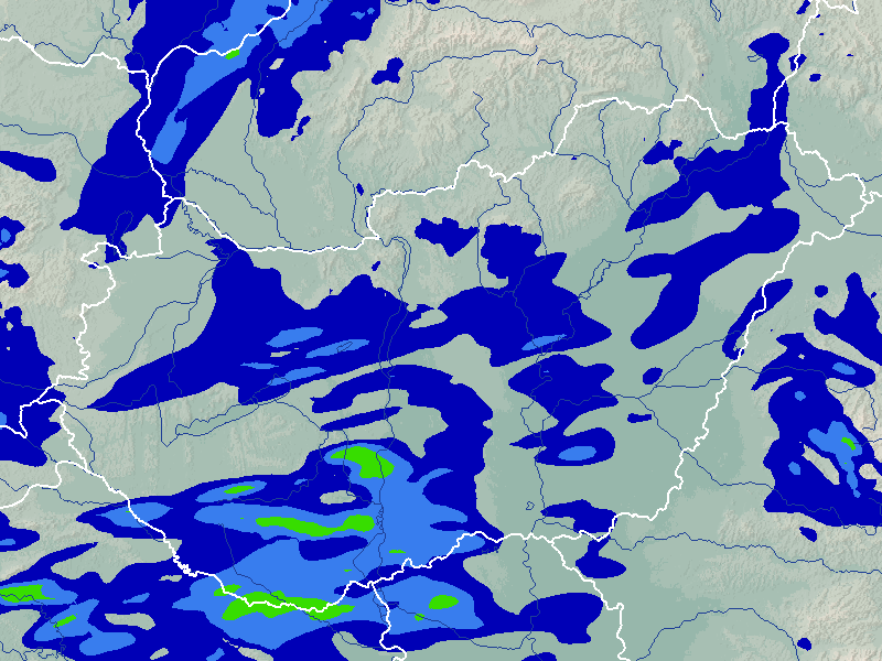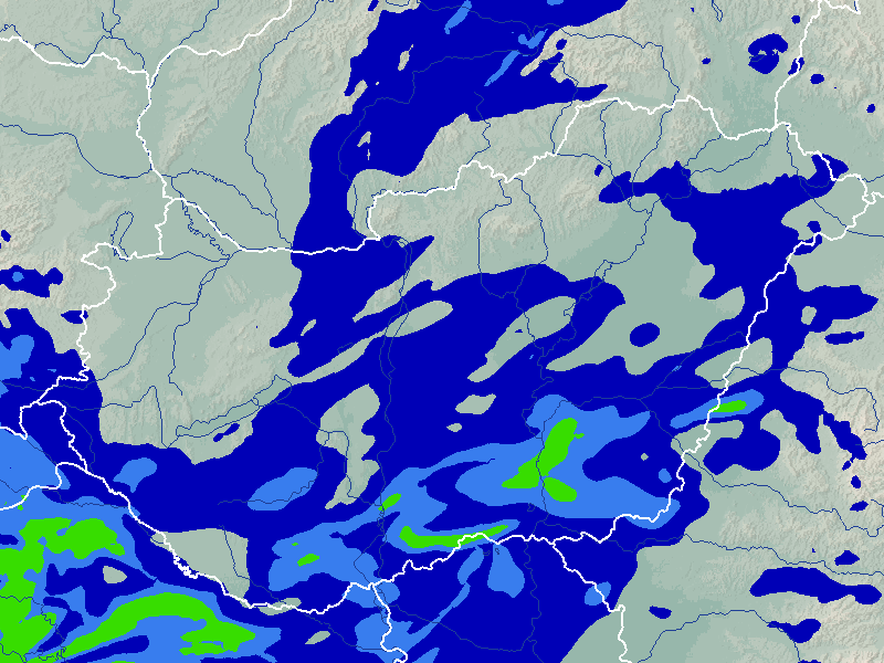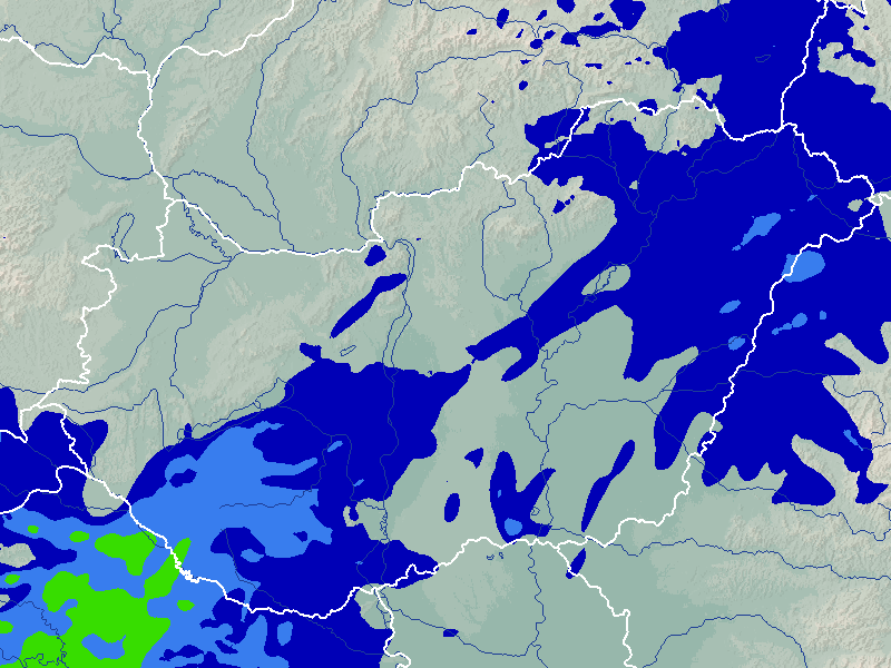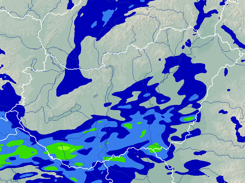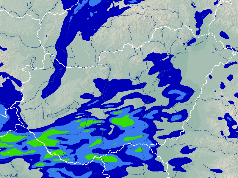 A térkép a csapadék intenzitását jelöli. A kékes árnyalatok gyenge, a zöldes közepes, míg a sárga és piros színek erős csapadékintenzitást jeleznek. Havazás esetén gyengébb csapadékintenzitás mellett is lehet sűrű hóesés.