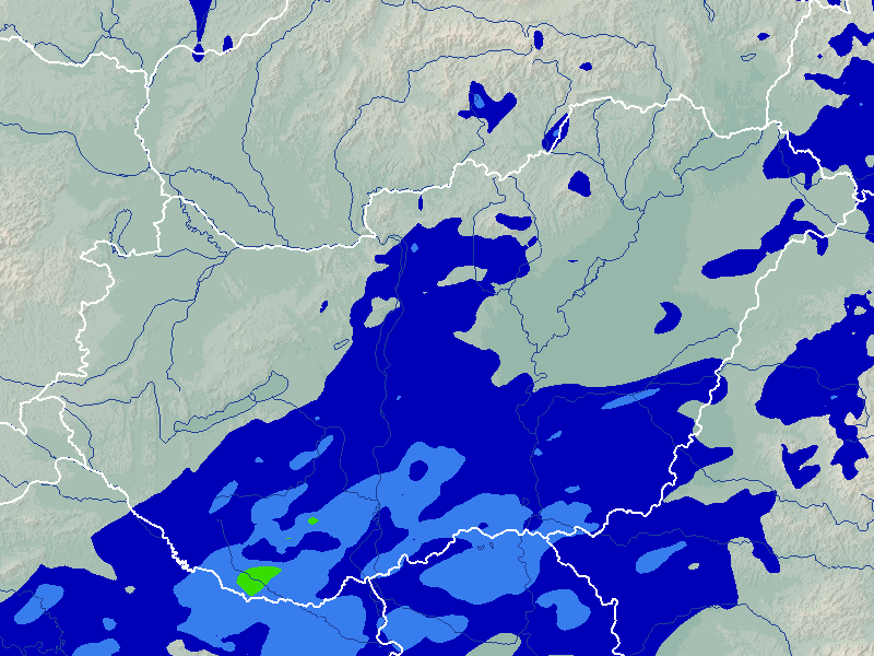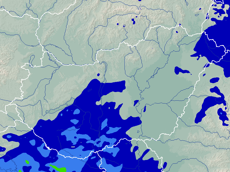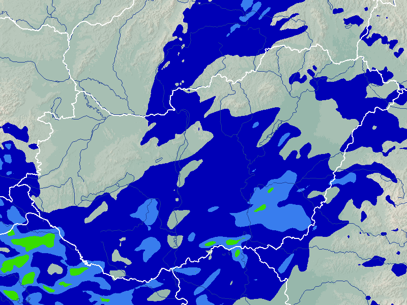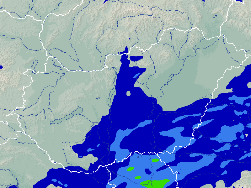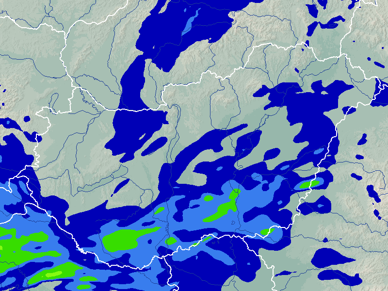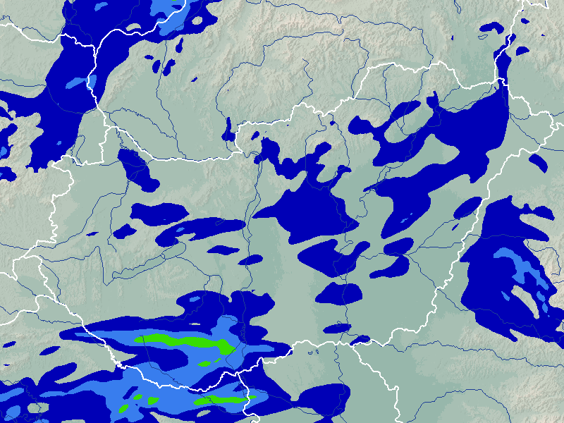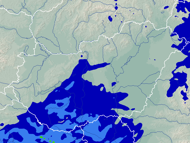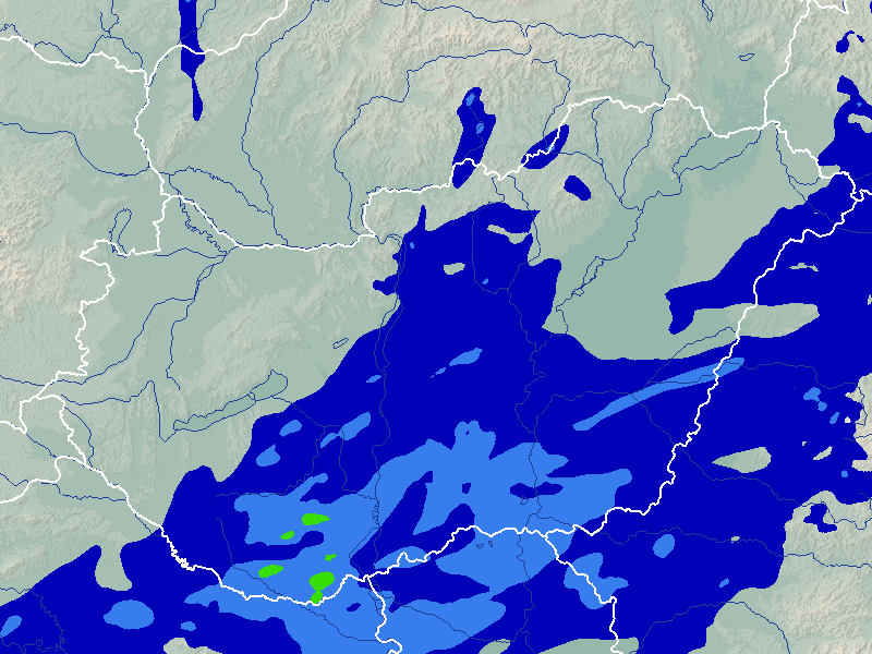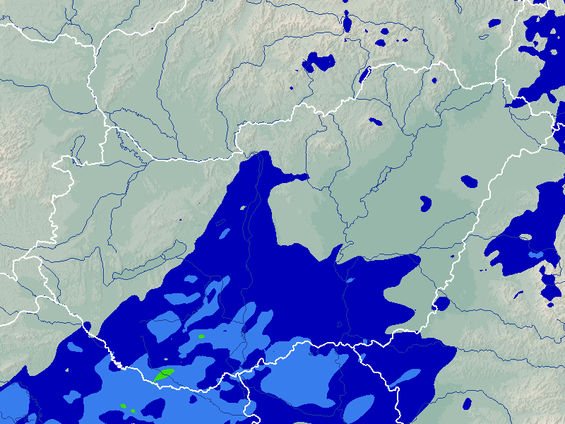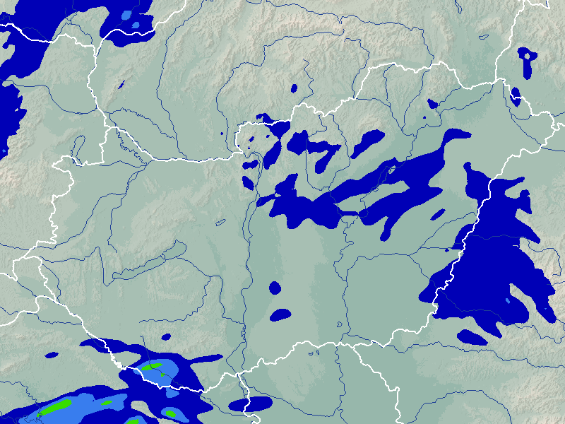A térkép a csapadék intenzitását jelöli. A kékes árnyalatok gyenge, a zöldes közepes, míg a sárga és piros színek erős csapadékintenzitást jeleznek. Havazás esetén gyengébb csapadékintenzitás mellett is lehet sűrű hóesés.
