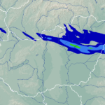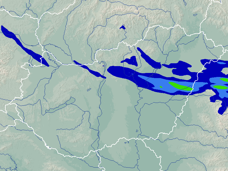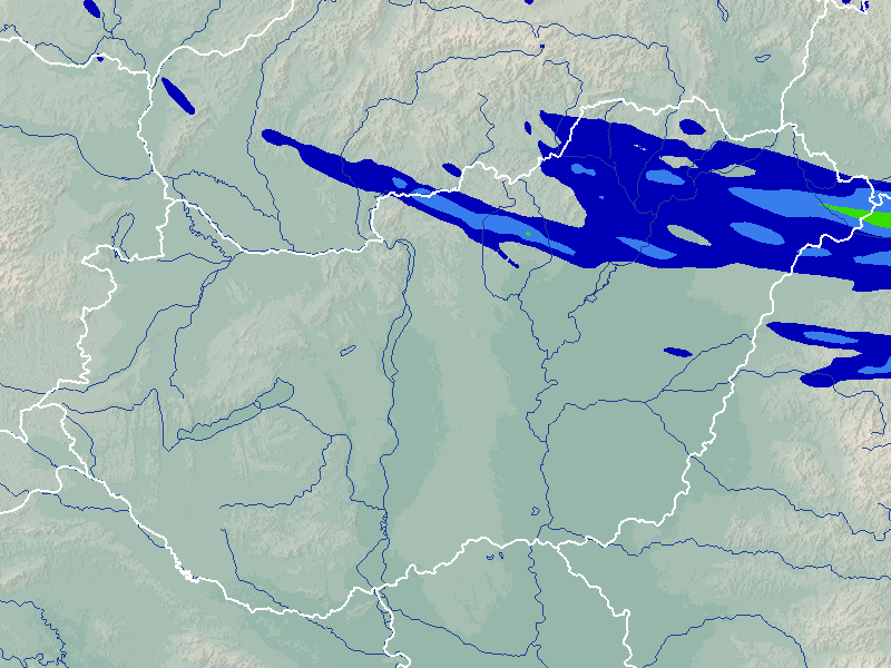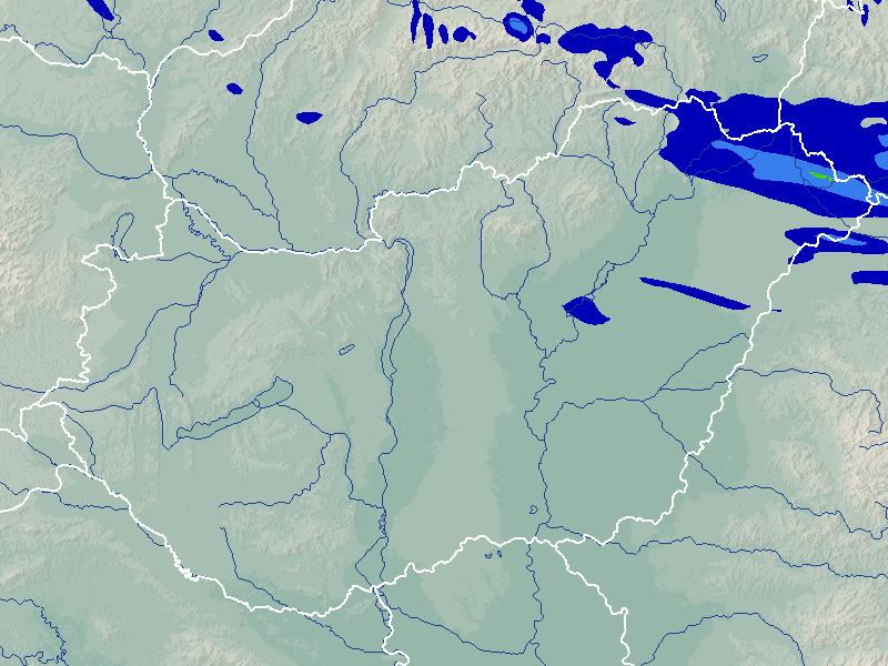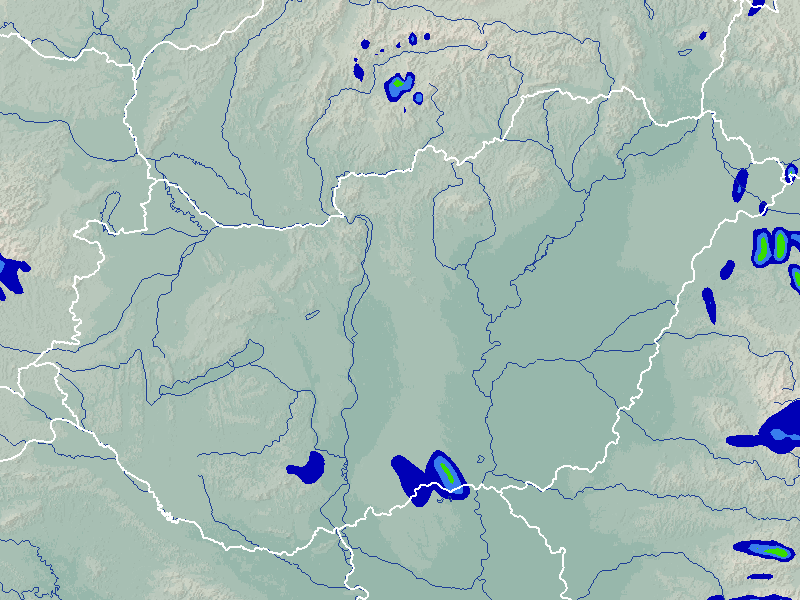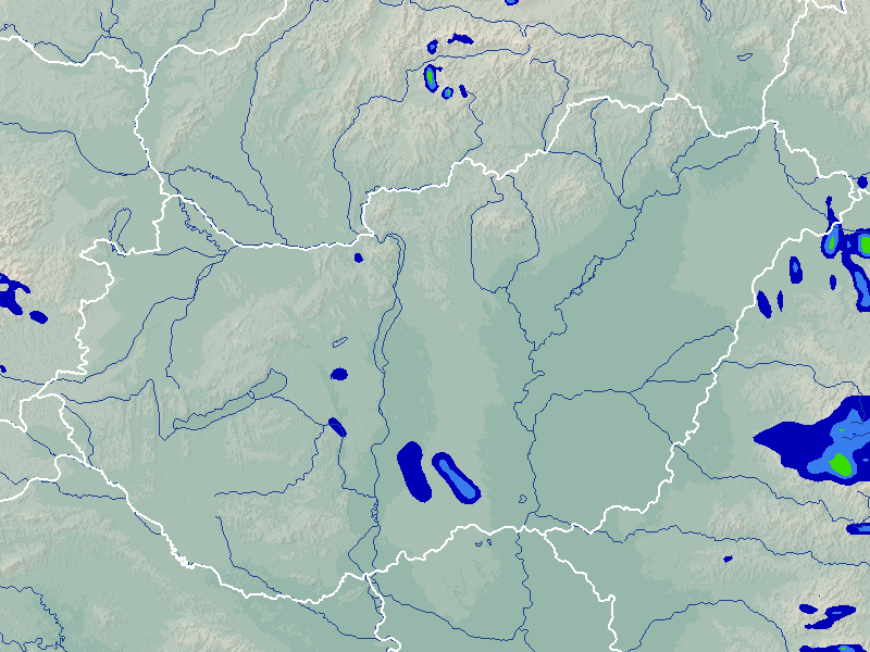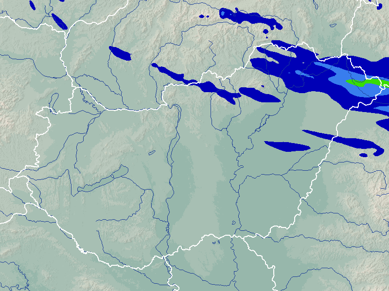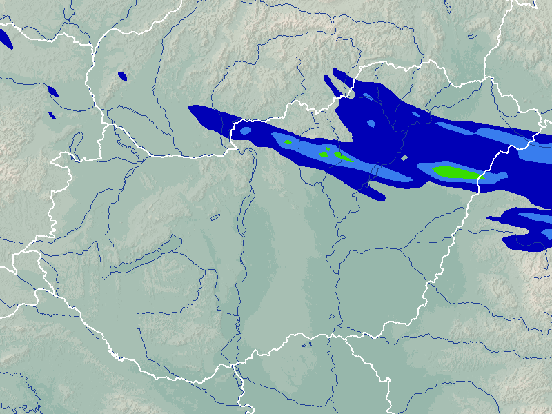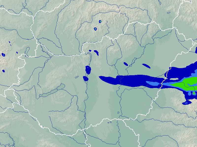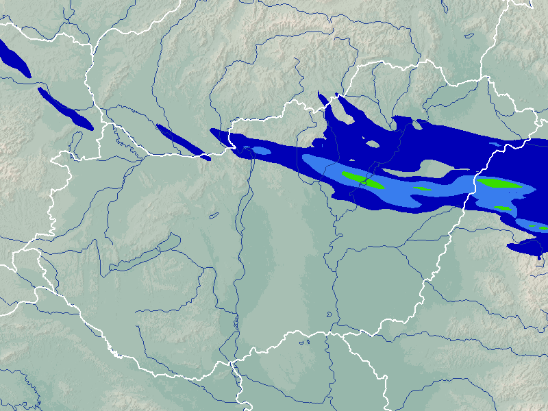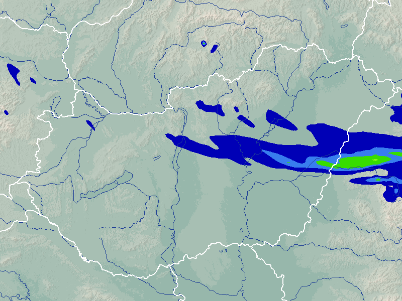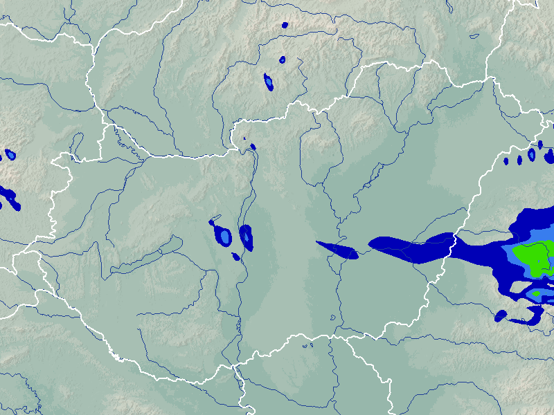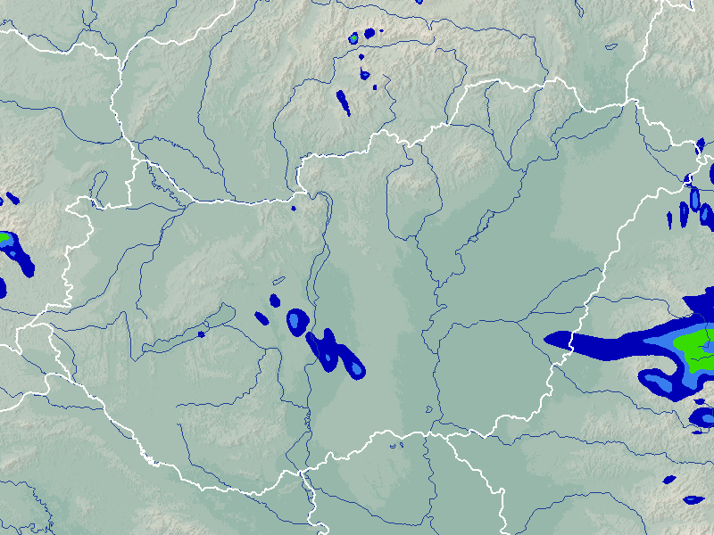 A térképek a csapadék intenzitását jelölik. A kékes árnyalatok gyenge, a zöldes közepes, míg a sárga és piros színek erős csapadékintenzitást jeleznek.