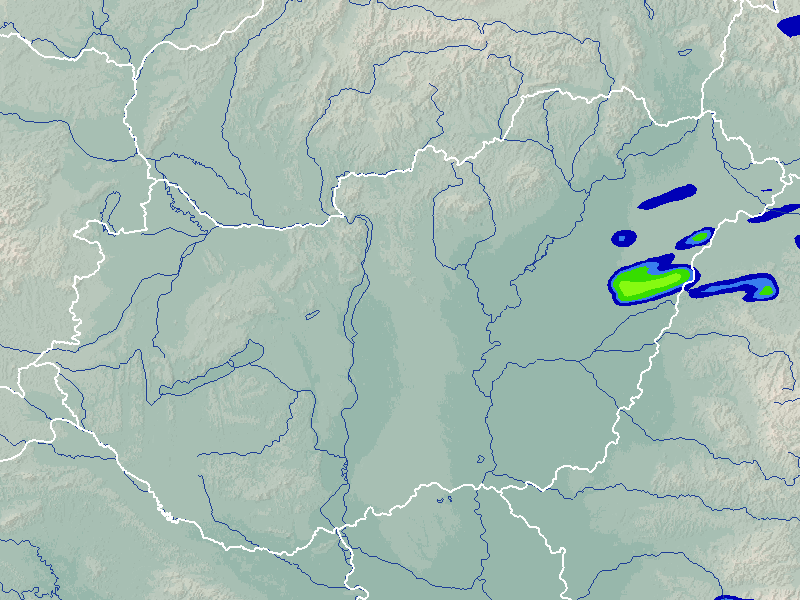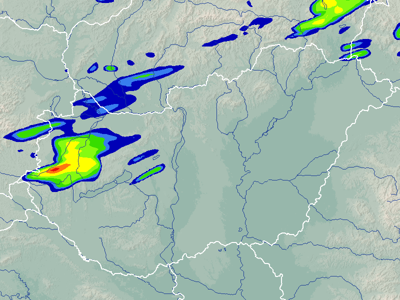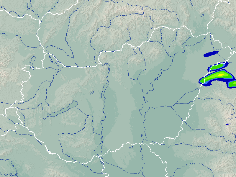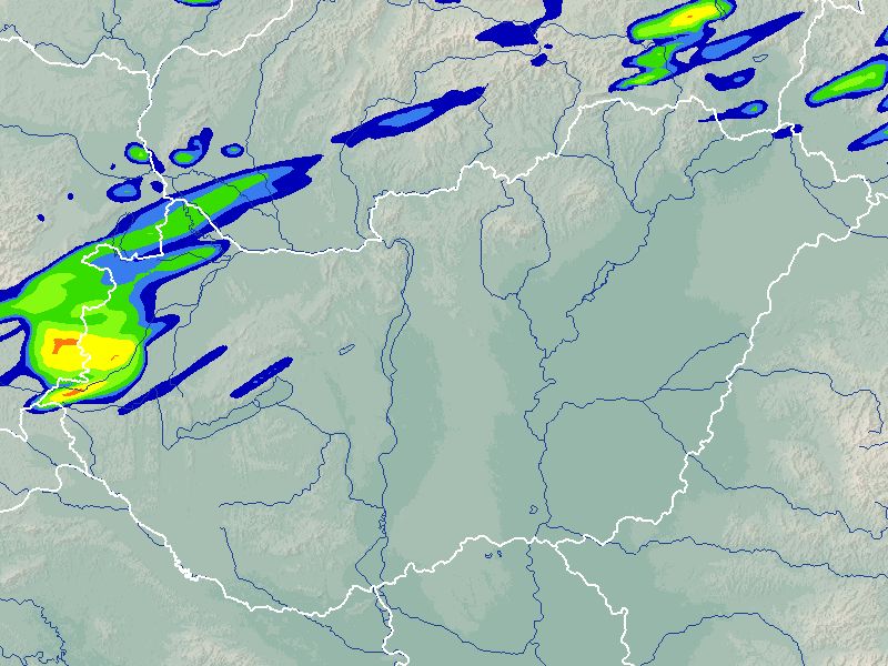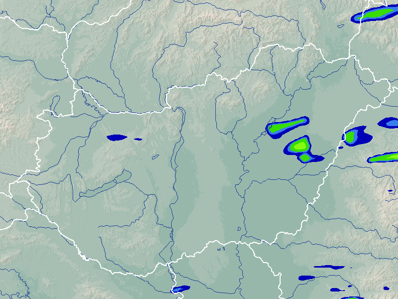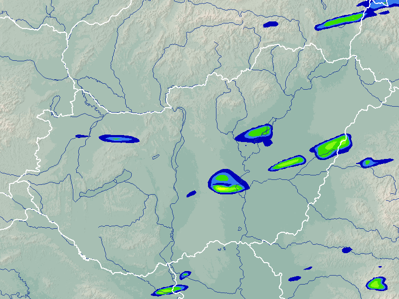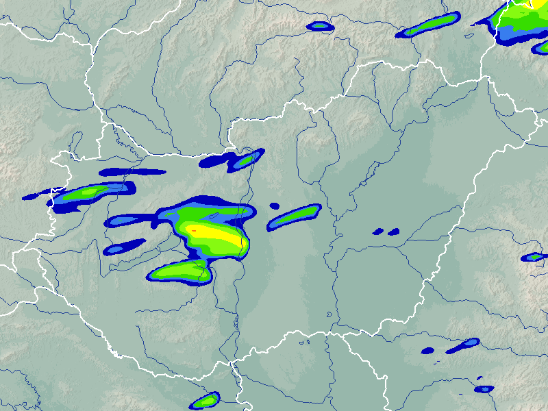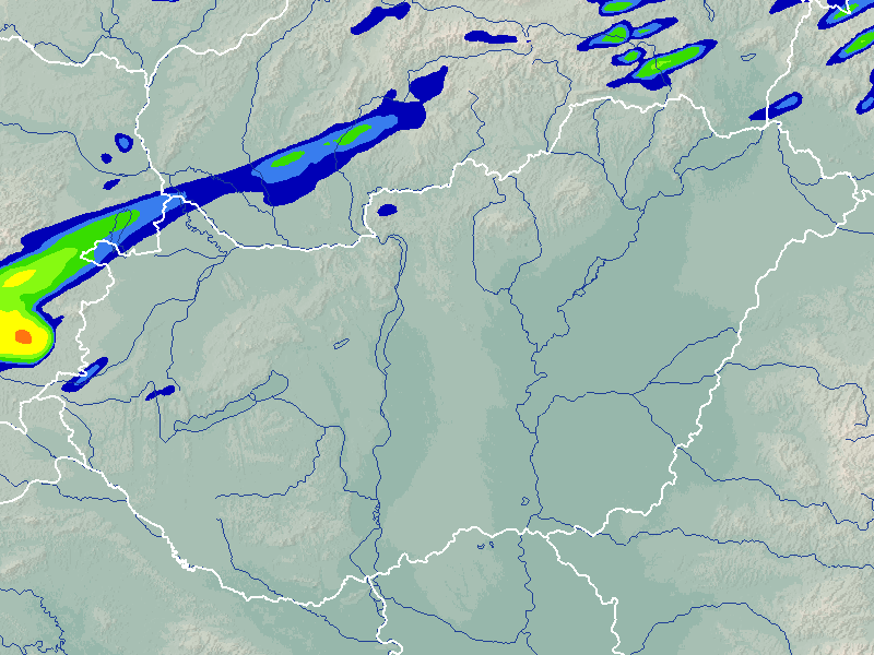 A térképek a csapadék intenzitását jelölik. A kékes árnyalatok gyenge, a zöldes közepes, míg a sárga és piros színek erős csapadékintenzitást jeleznek.