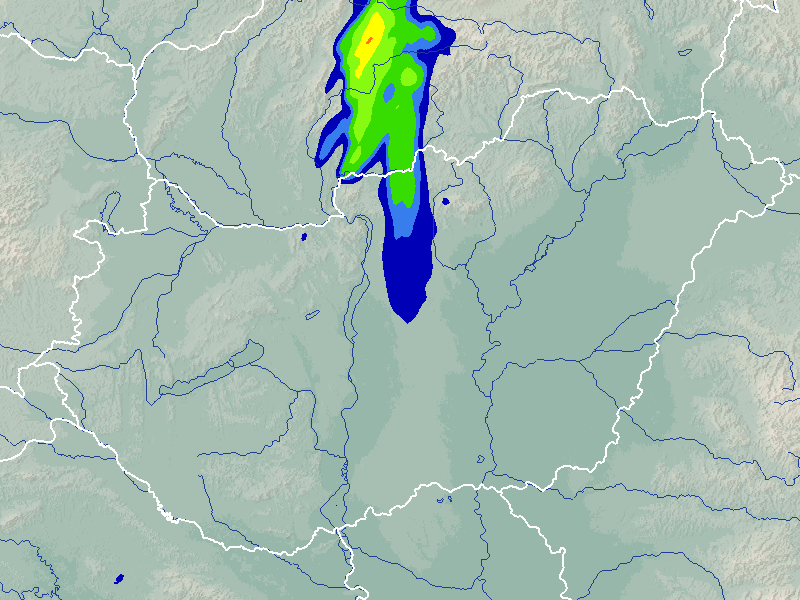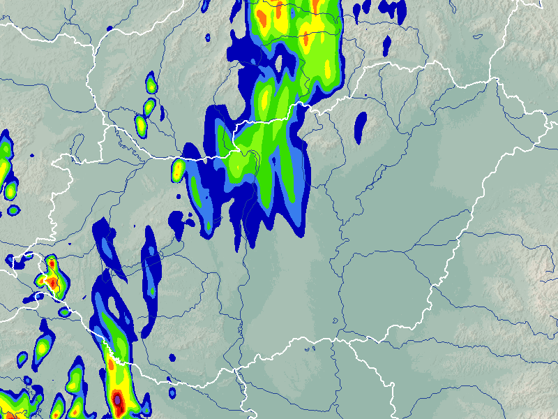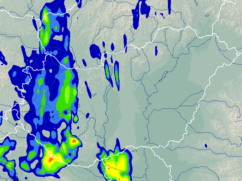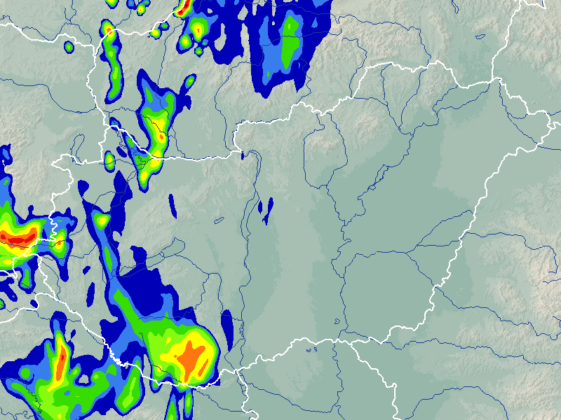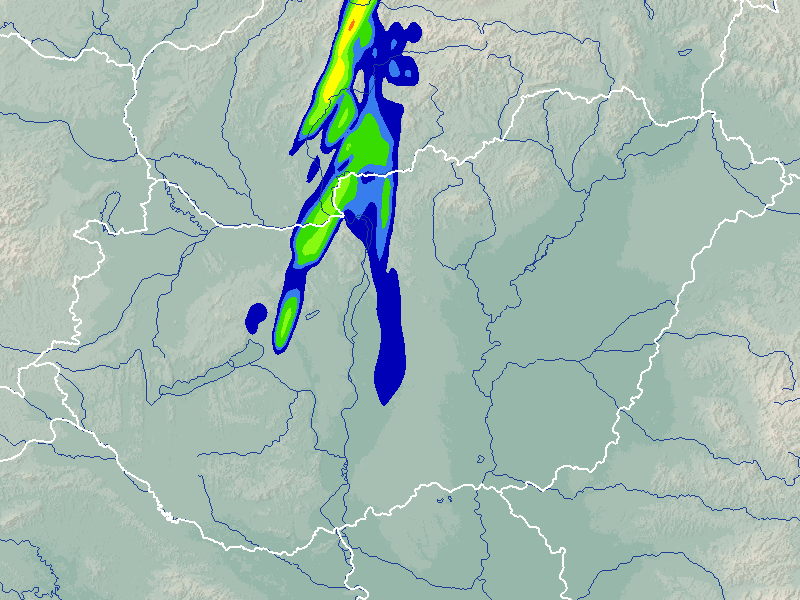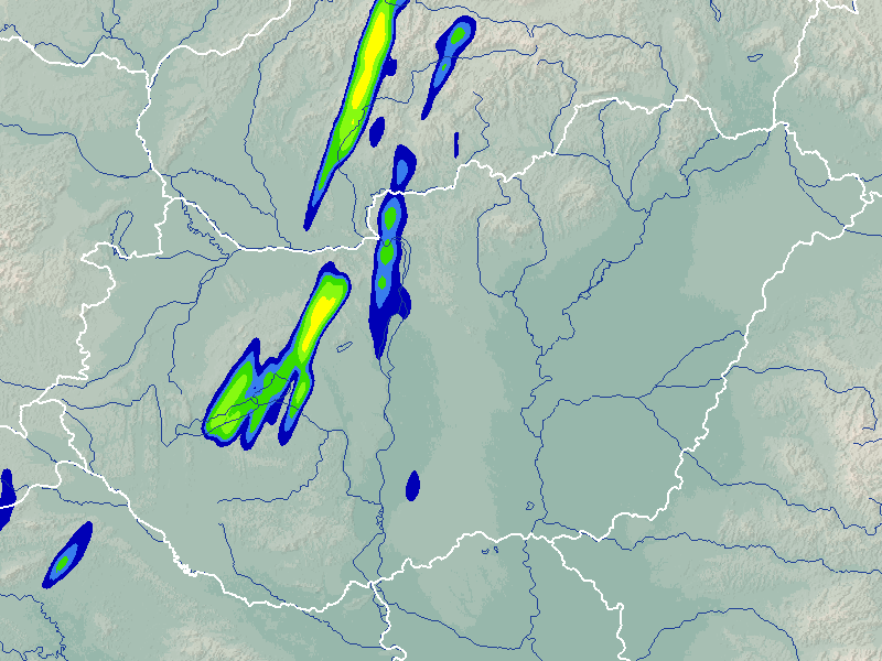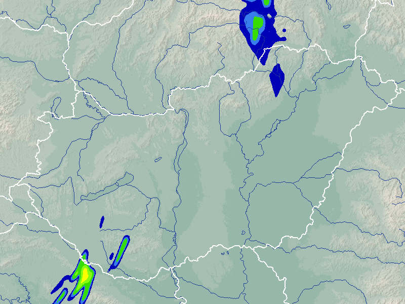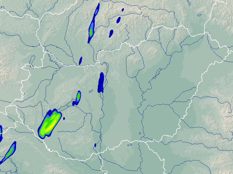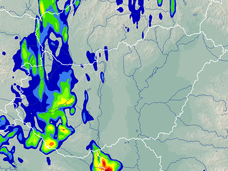 A térképek a csapadék intenzitását jelölik. A kékes árnyalatok gyenge, a zöldes közepes, míg a sárga és piros színek erős csapadékintenzitást jeleznek. Záporos csapadék miatt a gócok elhelyezkedése változhat, de a tendencia így is jól megfigyelhető.