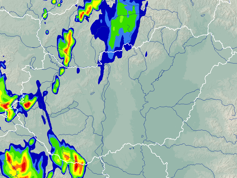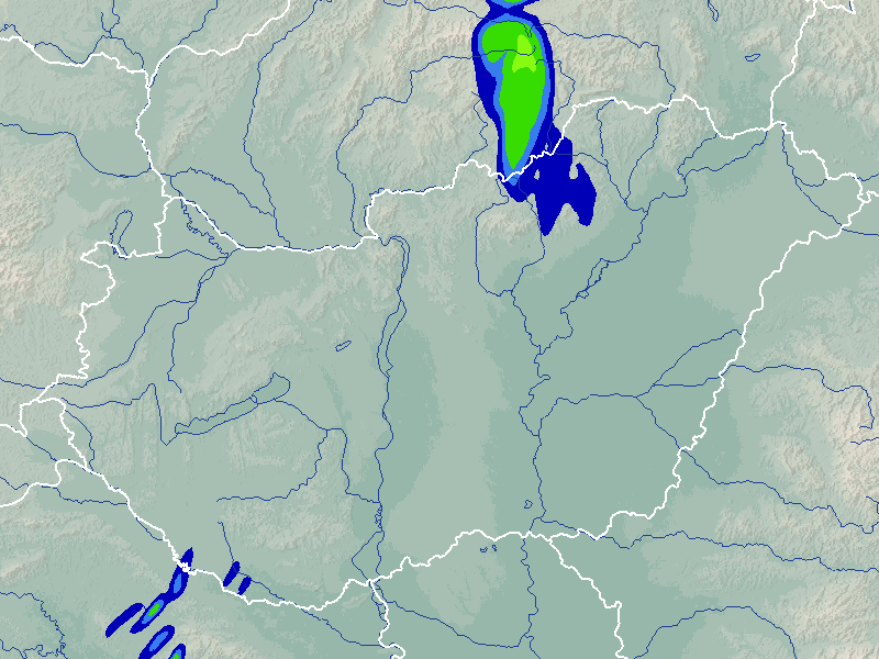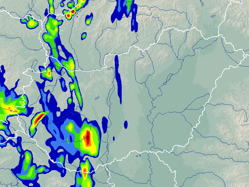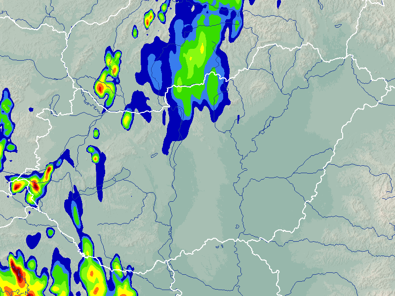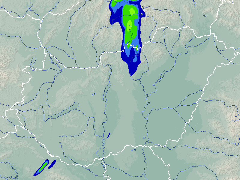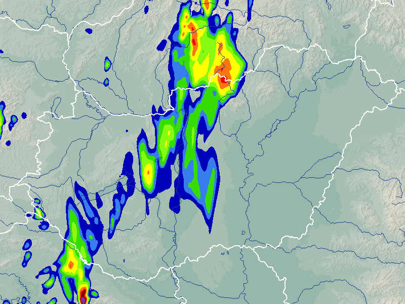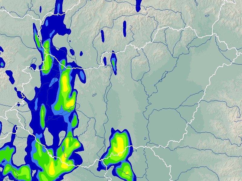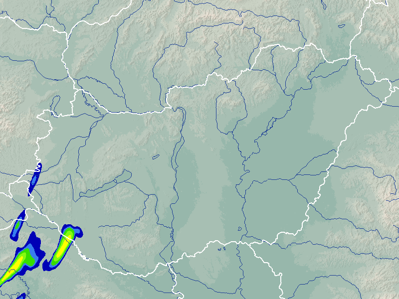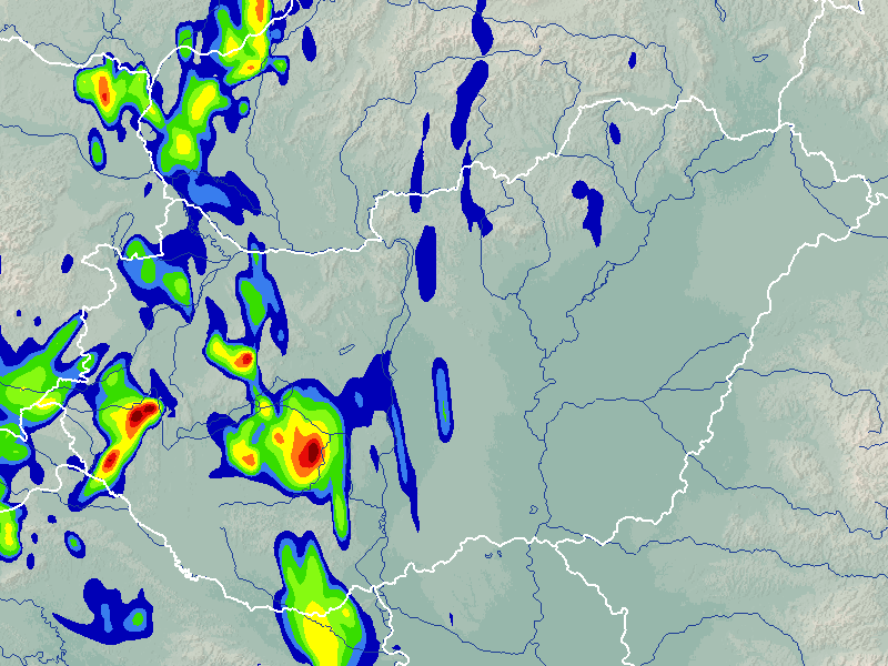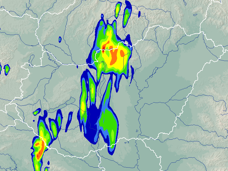 A térképek a csapadék intenzitását jelölik. A kékes árnyalatok gyenge, a zöldes közepes, míg a sárga és piros színek erős csapadékintenzitást jeleznek. Záporos csapadék miatt a gócok elhelyezkedése változhat, de a tendencia így is jól megfigyelhető.