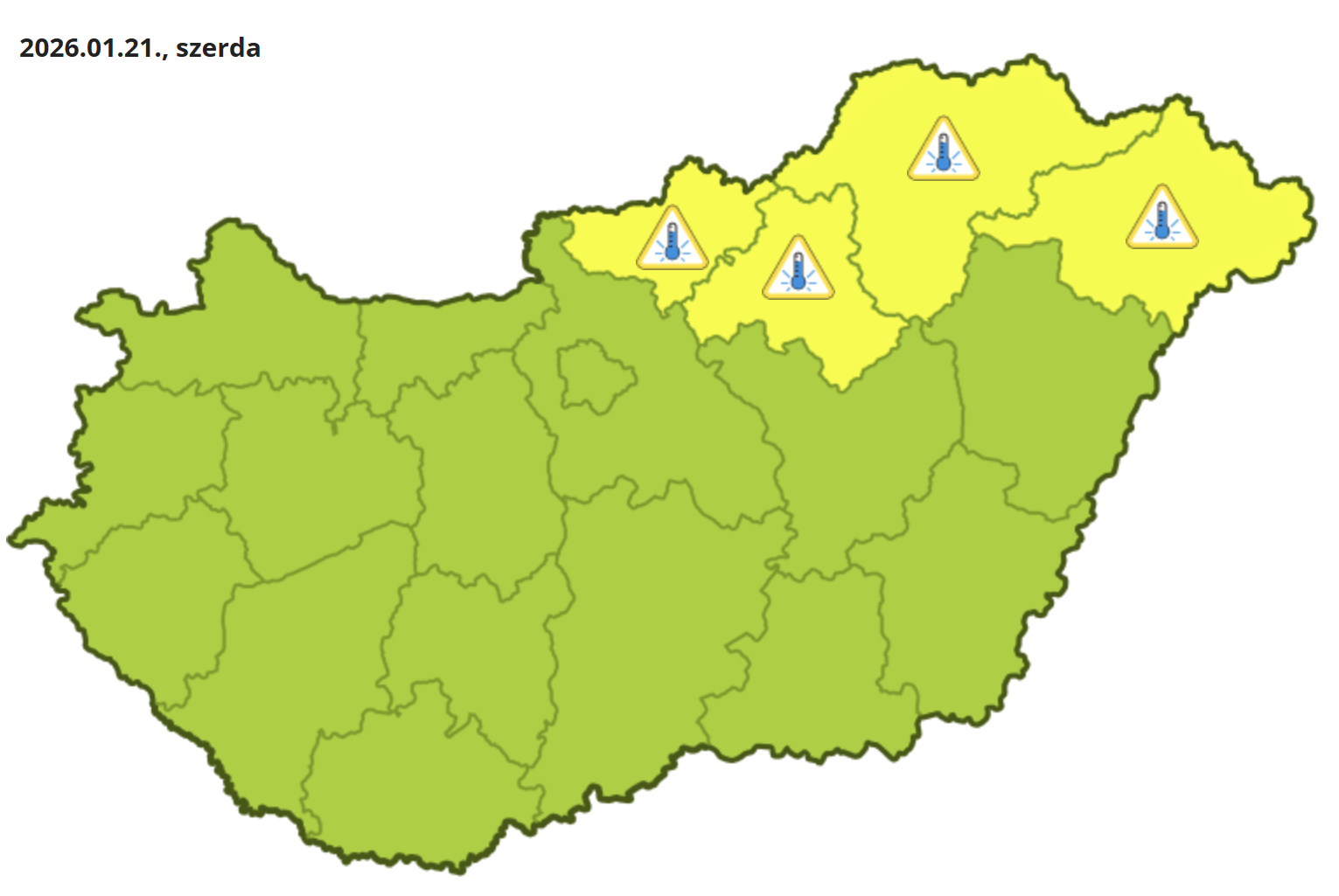 Keddről szerdára virradó éjszaka a derült északi, északkeleti tájainkon ismételten -15 fok közelében alakulhatnak a minimum-hőmérsékletek. Ezért a HunfaroMet elsőfokú figyelmeztetést adott ki az extrém hideg miatt Nógrád, Heves, Borsod-Abaúj-Zemplén és Szabolcs-Szatmár-Bereg vármegyére.