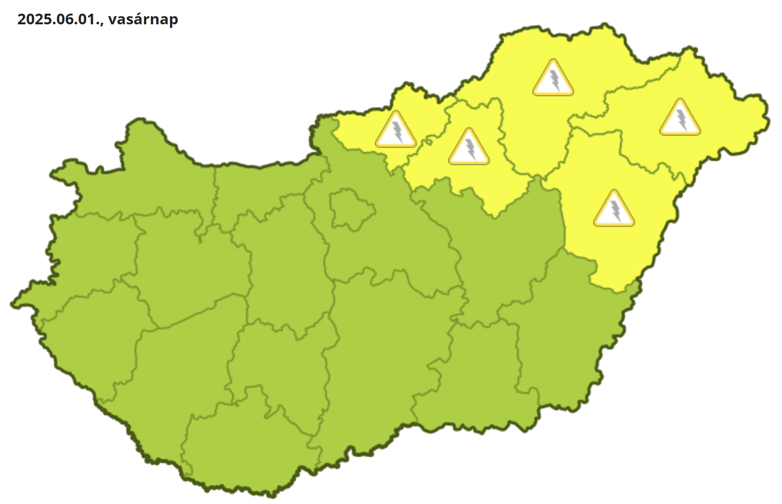 A HungaroMet elsőfokú figyelmeztetést adott ki szombatra a zivatarok kialakulásának veszélye miatt Nógrád, Heves, Borsod-Abaúj-Zemplén és Szabolcs-Szatmár-Bereg vármegyére.
