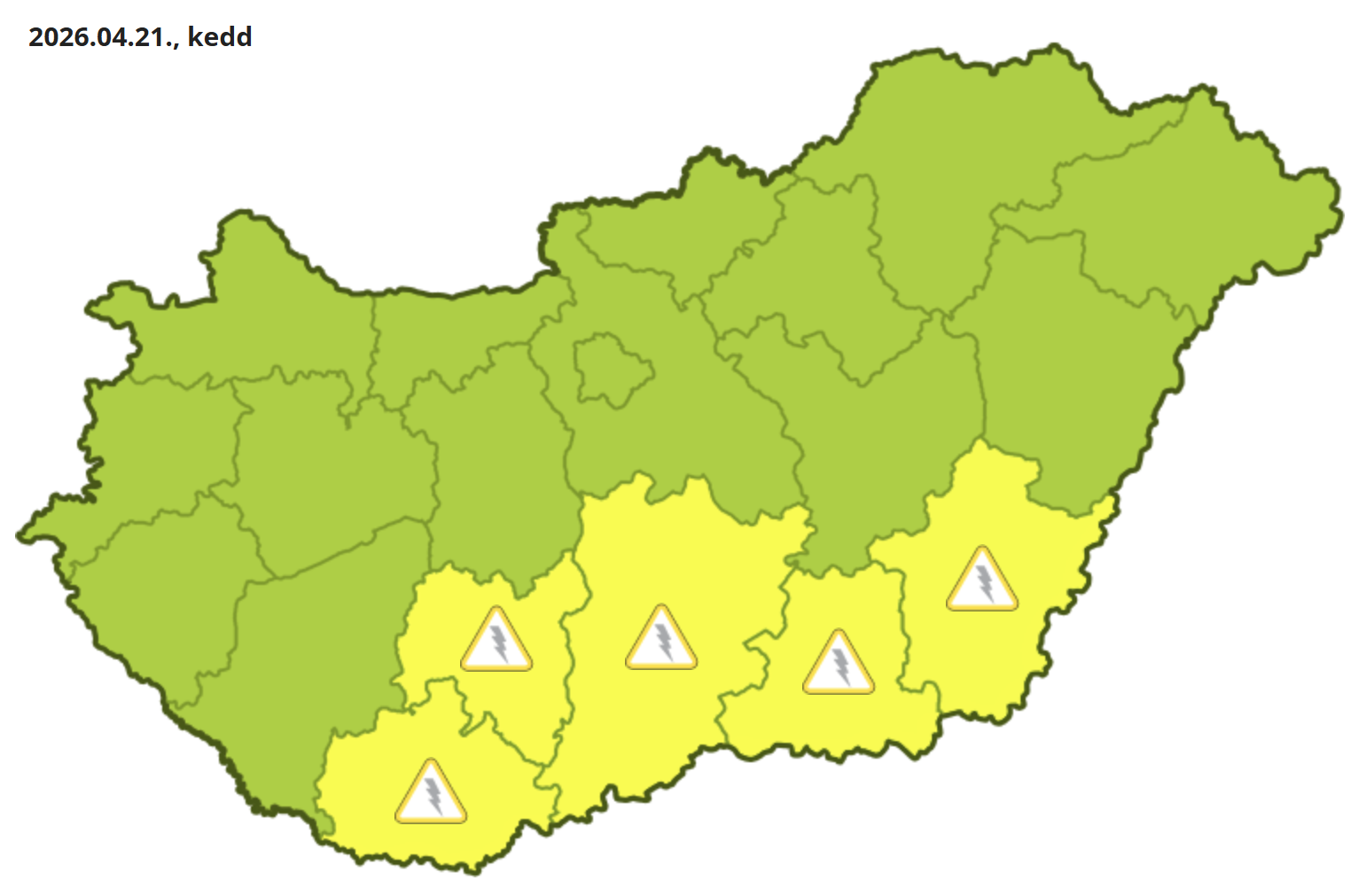A HungaroMet elsőfokú figyelmeztetést adott ki a zivatarok és azok veszélyes kísérőjelenségei miatt Tolna, Baranya, Bács-Kiskun, Csongrád-Csanád és Békés vármegyére.