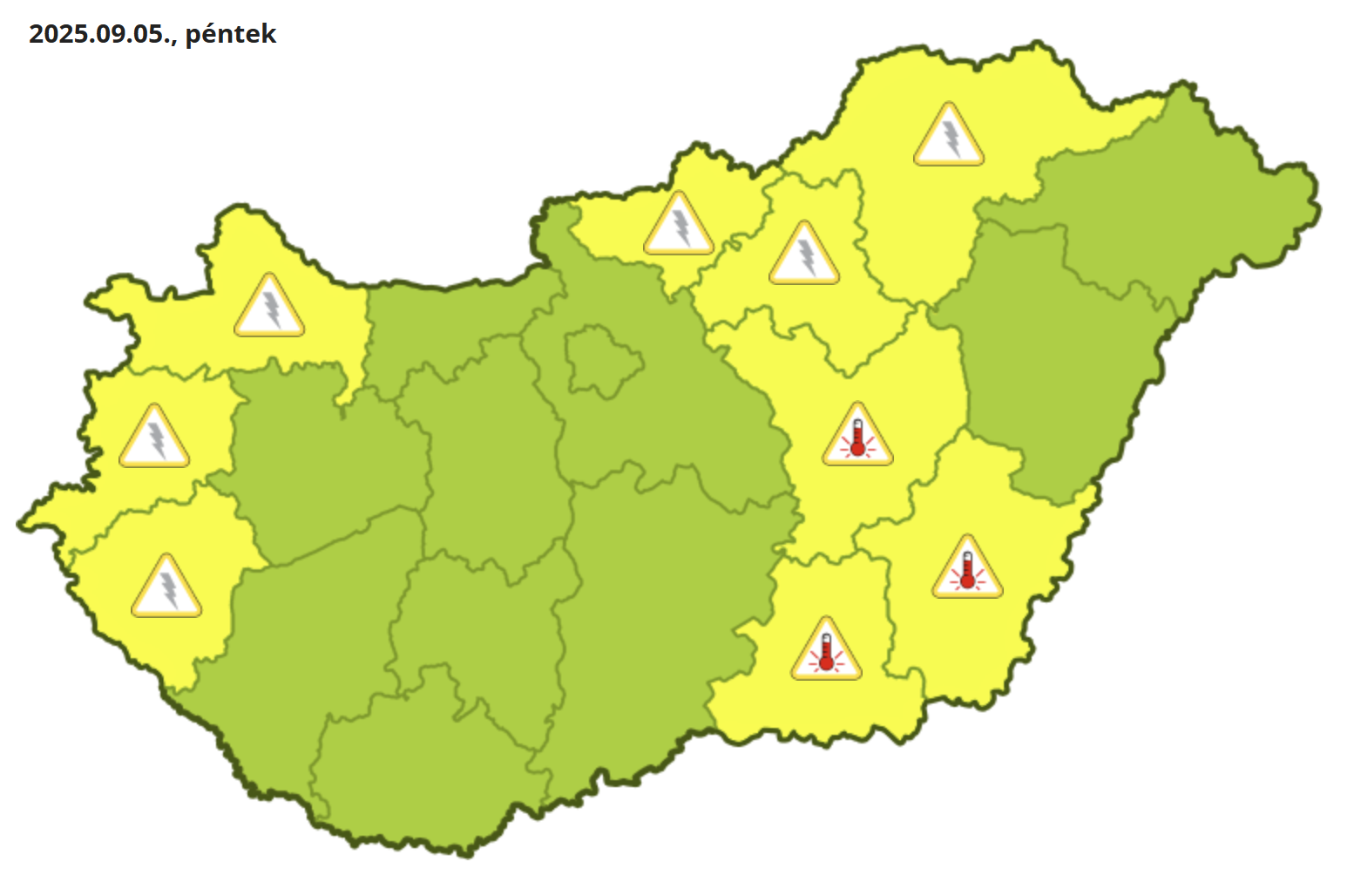 A Hungaromet elsőfokú figyelmeztetést adott ki a zivatarok veszélyes kísérőjelenségei miatt pénteken Borsod-Abaúj-Zemplén, Nógrád, Heves, Vas, Zala és Győr-Moson-Sopron vármegyére. Jász-Nagykun-Szolnok, Békés és Csongrád-Csanád vármegyében elsőfokú figyelmeztetés érvényes a magas középhőmérséklet miatt.