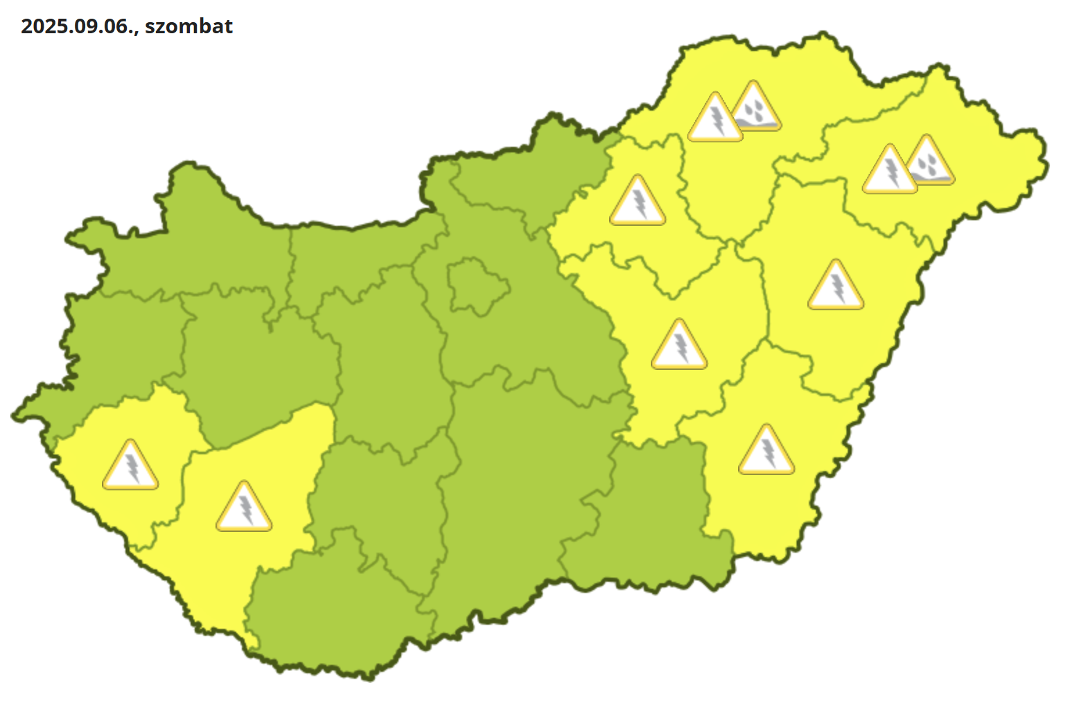 Szombaton elsőfokú figyelmeztetés érvényes a zivatarok veszélyes kísérőjelenségei miatt Zala, Somogy, Borsod-Abaúj-Zemplén, Heves, Szabolcs-Szatmár-Bereg, Hajdú-Bihar, Jász-Nagykun-Szolnok és Békés vármegyére, felhőszakadás miatt pedig Borsod-Abaúj-Zemplén és Szabolcs-Szatmár-Bereg vármegyére.