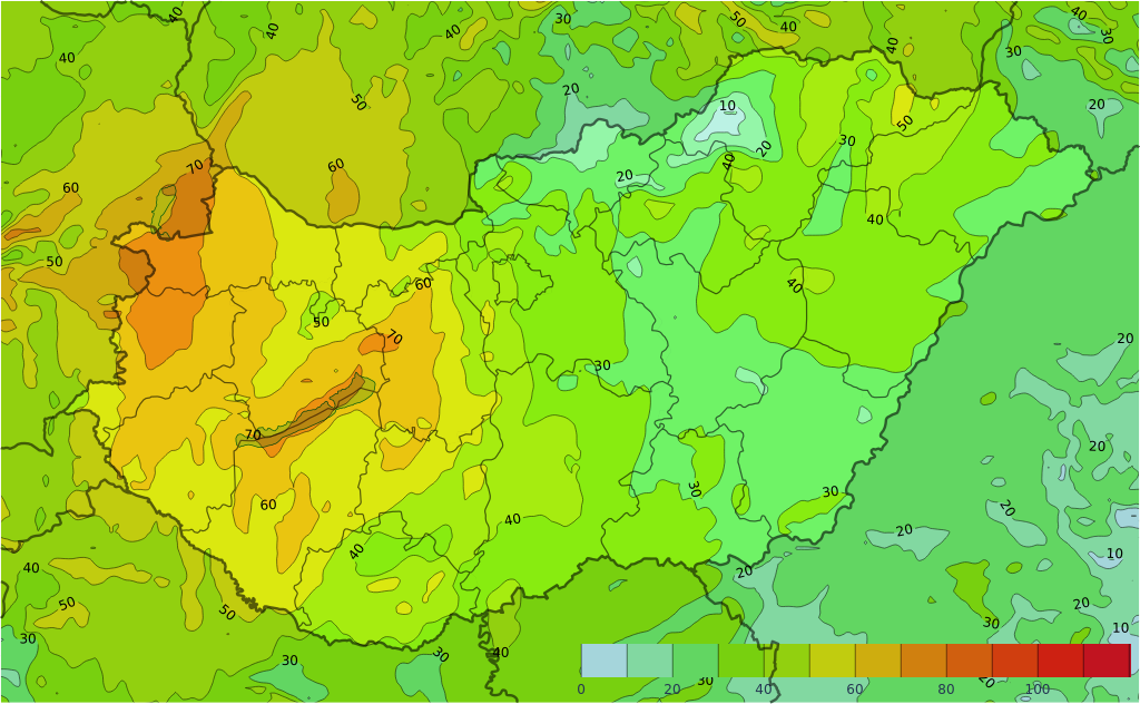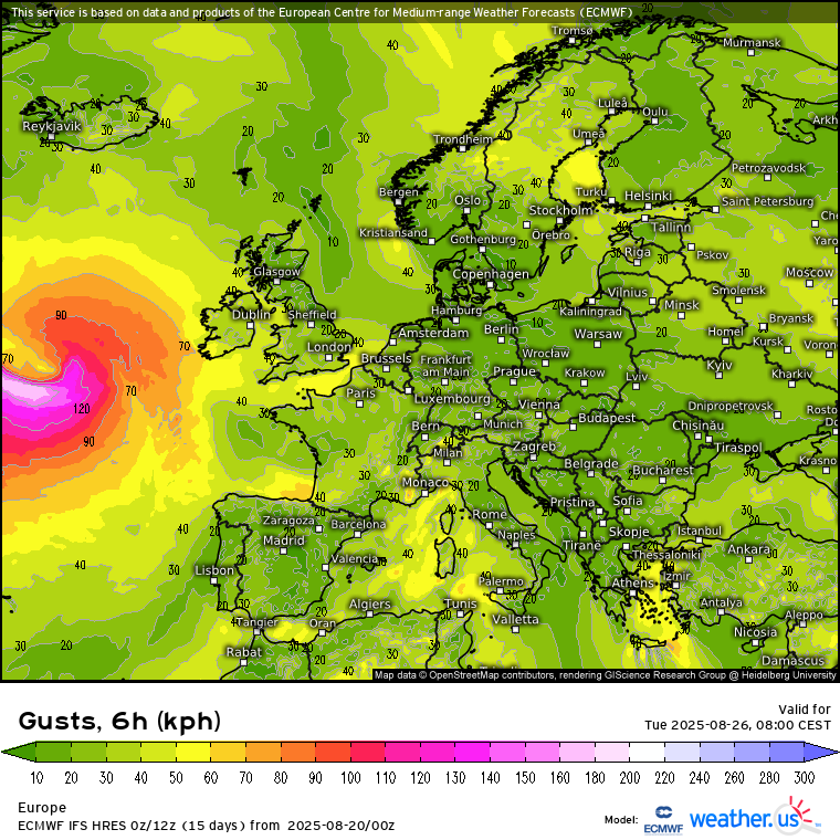 A legerősebb széllökések (km/órában) augusztus 16-án reggel, az ECMWF időjárás-előrejelző modell alapján. Forrás: weather.us
