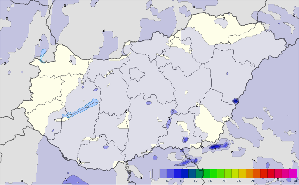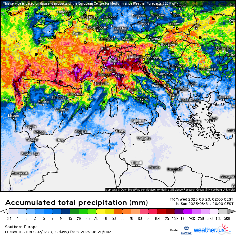 A várható csapadék mennyisége milliméterben, augusztus 31-ig Dél-Európában, az ECMWF időjárás-előrejelző modell alapján.