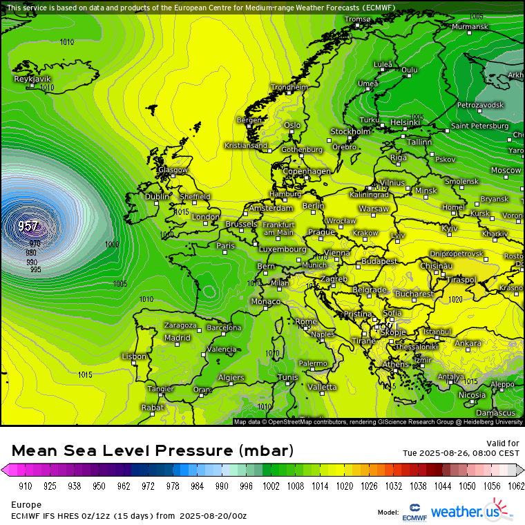 A legfrissebb előrejelzés szerint Erin kedd reggel 957 hpa-os nyomásközépponttal fog rendelkezni (térkép alább), amely nagyon intenzív ciklont jelent az év ezen szakaszában.