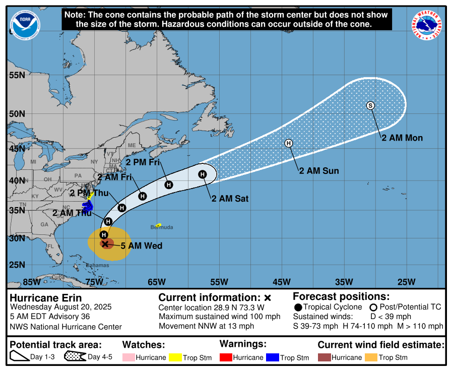 Az Erin hurrikán már napok óta az Atlanti-óceán trópusi vizei felett örvénylik és lassan mozog északi irányba az Egyesült Államok keleti partvidékétől néhány száz kilométerre. A következő napokban azonban elhagyja a trópusi égövet és a nyugatias szelek tartományába lép át, amelynek hatására mozgása látványosan felgyorsul.