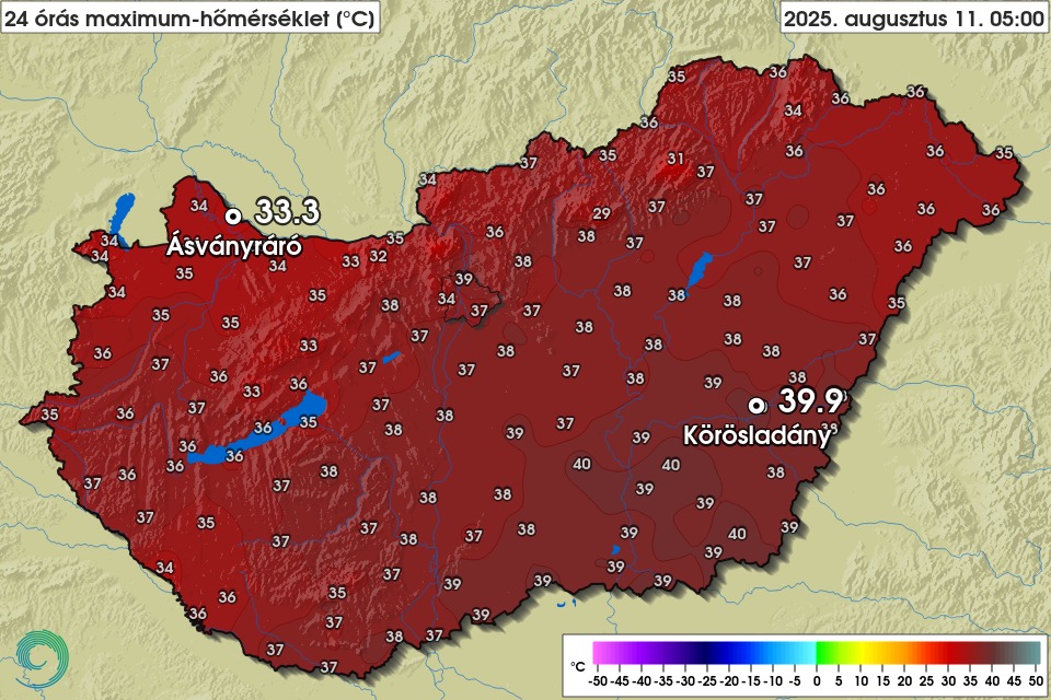 Maximumhőmérséklet alakulása Magyarországon, 2025. augusztus 10-én, Térkép forrása: Hungaromet facebook
