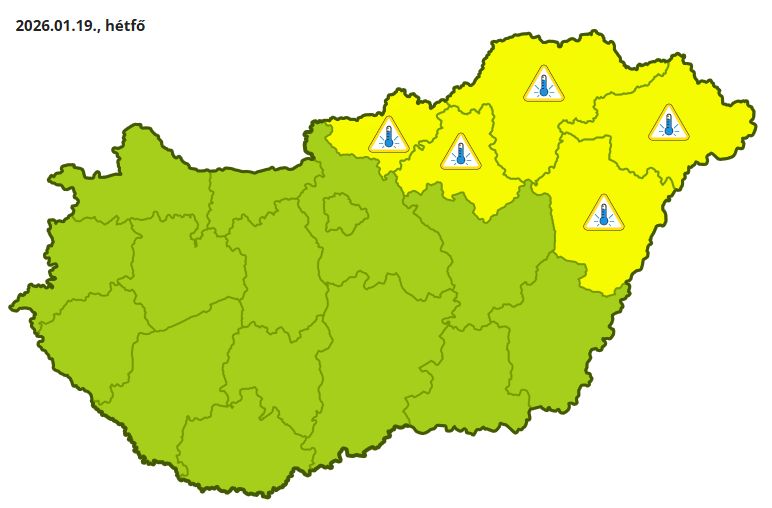 Hétfőre virradó éjszaka nagyobb területre terjeszkedik a hideg, emiatt Nógrád, Heves, Borsod-Abaúj-Zemplén, Szabolcs-Szatmár-Bereg és Hajdú-Bihar vármegyében elsőfokú figyelmeztetés érvényes a -15 fok alá csökkenő hőmérséklet miatt.