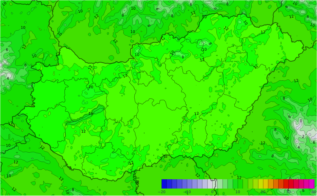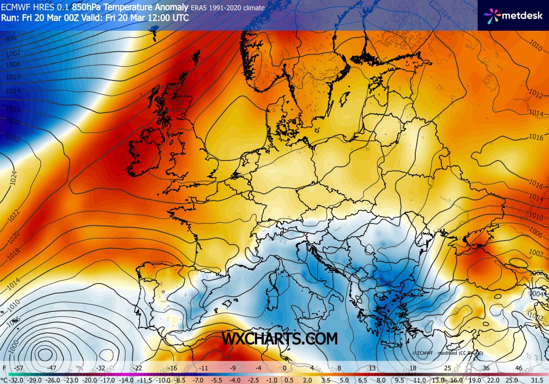 Március 20. (Péntek) Éles kontraszt látható a kontinens felett. Míg a kontinens nagy részén az átlagosnál több fokkal enyhébb az idő, addig Közép-Európa déli fele, Olaszország és a Balkán egy hideg légtömeg fogságában van (kék árnyalatok). Hazánk ezen a napon még az átlagosnál 1-3 fokkal hűvösebb zónába tartozik. A magasban lévő hideg levegő miatt a fagyos reggelt követően, a nappali felmelegedés is mérsékelt maradt.