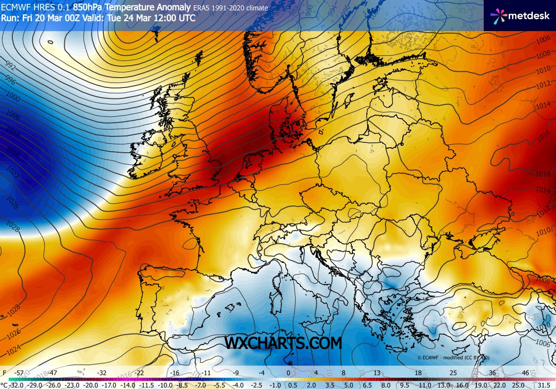 Március 24. (Kedd) A meleg levegő tovább terjeszkedik. A hűvös levegő a mediterrán térség déli területeire húzódik vissza. Hazánkban ezen a napon már egyértelműen az átlag feletti hőmérsékletek dominálnak (sárga/világosnarancs szín). Ez már kellemes, 15-18 fokos tavaszi időt jelent.