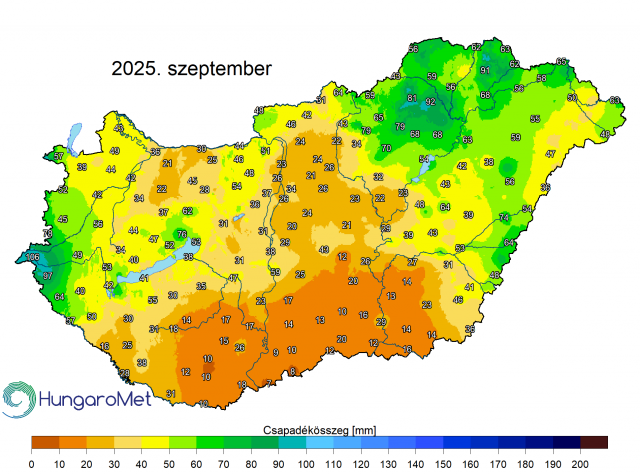 Havi csapadékösszeg 2025 szeptemberében, Magyarországon. Térkép forrása: met.hu