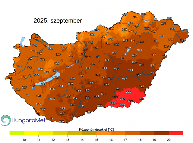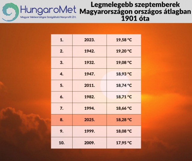 A HungaroMet Nonprofit Zrt. legfrissebb adatai szerint 2025 szeptemberét országos átlagban 18,28 °C-os középhőmérséklet jellemezte, ami 2,24 fokkal haladta meg a 1991–2020-as átlagot — ezzel az eddigi mérések alapján a nyolcadik legmelegebb szeptembernek számít a 20. század kezdete óta.