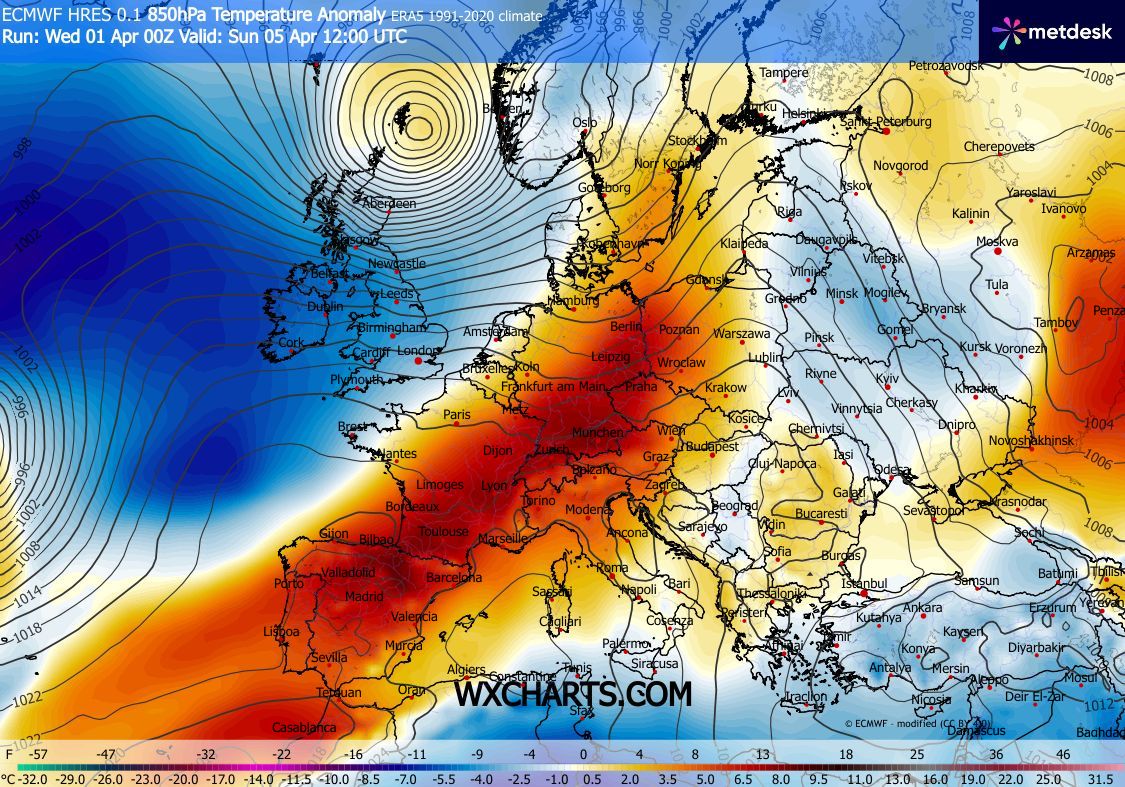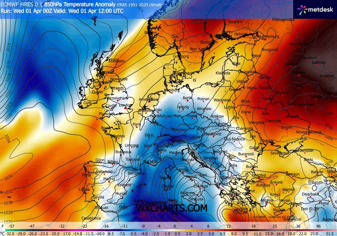 Április 1., szerda A kontinens nyugati és északi részén (Spanyolország, Franciaország, Brit-szigetek, Skandinávia) enyhe az idő, ezzel szemben Közép-Európa és a mediterrán térség középső területei felett egy mediterrán ciklon hatására változékony, az átlagosnál hidegebb az idő. Hazánkban az ilyenkor szokásosnál kissé hűvösebb, 1-4 fokkal az átlag alatti hőmérsékletek uralkodnak. Ez friss, de az évszaknak nagyjából megfelelő, kissé hűvös tavaszi időt jelent.