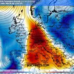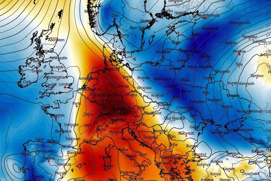 Április 8., szerda. Észak- és Északkelet-Európára (Skandinávia, Baltikum, Oroszország) sarkvidéki eredetű, fagyos levegő zúdul be (mélyvöröstől a sötétkékig váltó éles határvonal). Ugyanakkor Közép-Európa felett egy rendkívül erős "melegnyelv" alakul ki. Hazánk időjárása is két részre szakad. Délnyugaton kitart az enyhe késő tavaszi idő, míg északkeletre hidegebb levegő tör be.