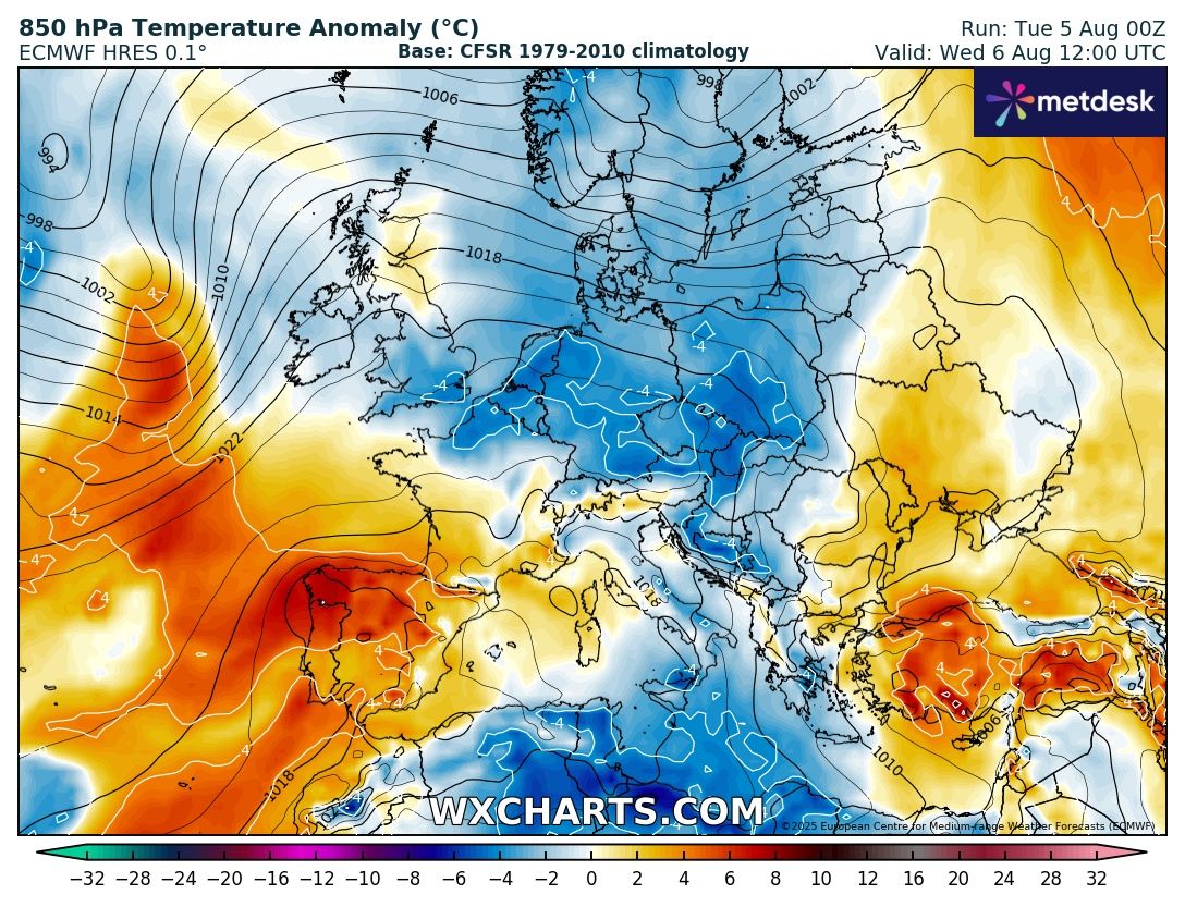 A hét közepén Európa nagy része fölé még hűvös levegő áramlik. Térségünkben is mérsékleten meleg időre lehet számítani. Hőhullám csak az Ibériai-félszigeten, Dél-Franciaországban és Törökországban van.