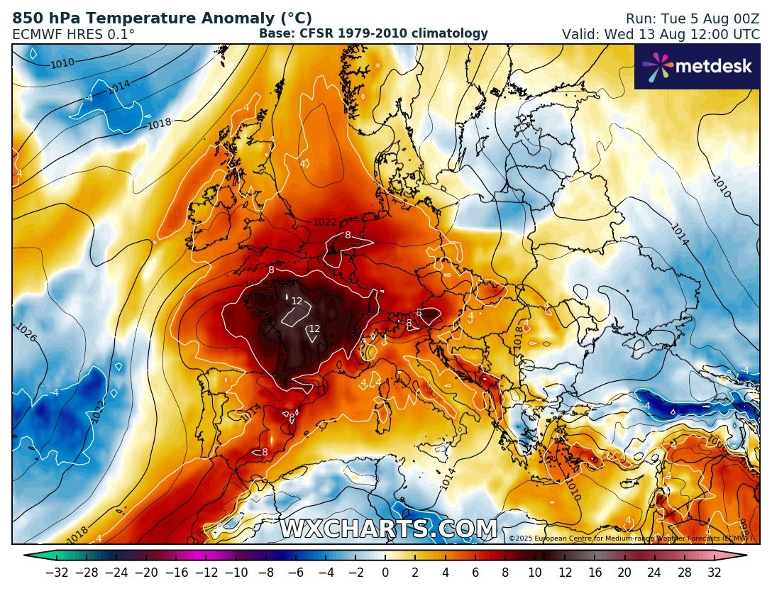 A jövő hét közepére Délnyugat-Európában tovább fokozódik a hőhullám, Franciaországban és az Ibériai-félszigeten a 40 fokot is elérheti a csúcshőmérséklet. Térségünkben jelentős változásra nem kell számítanunk, marad a hőség, 35 fok körüli nappali maximumokkal és emellett nagyon száraz időre van kilátás.