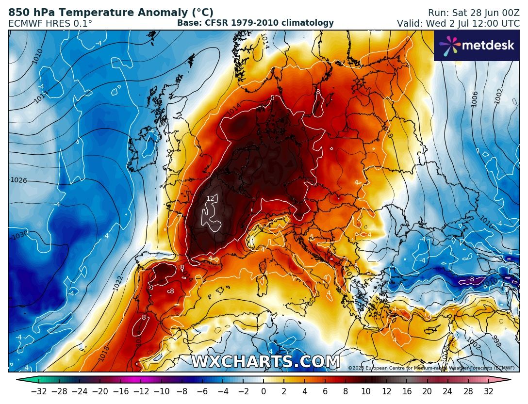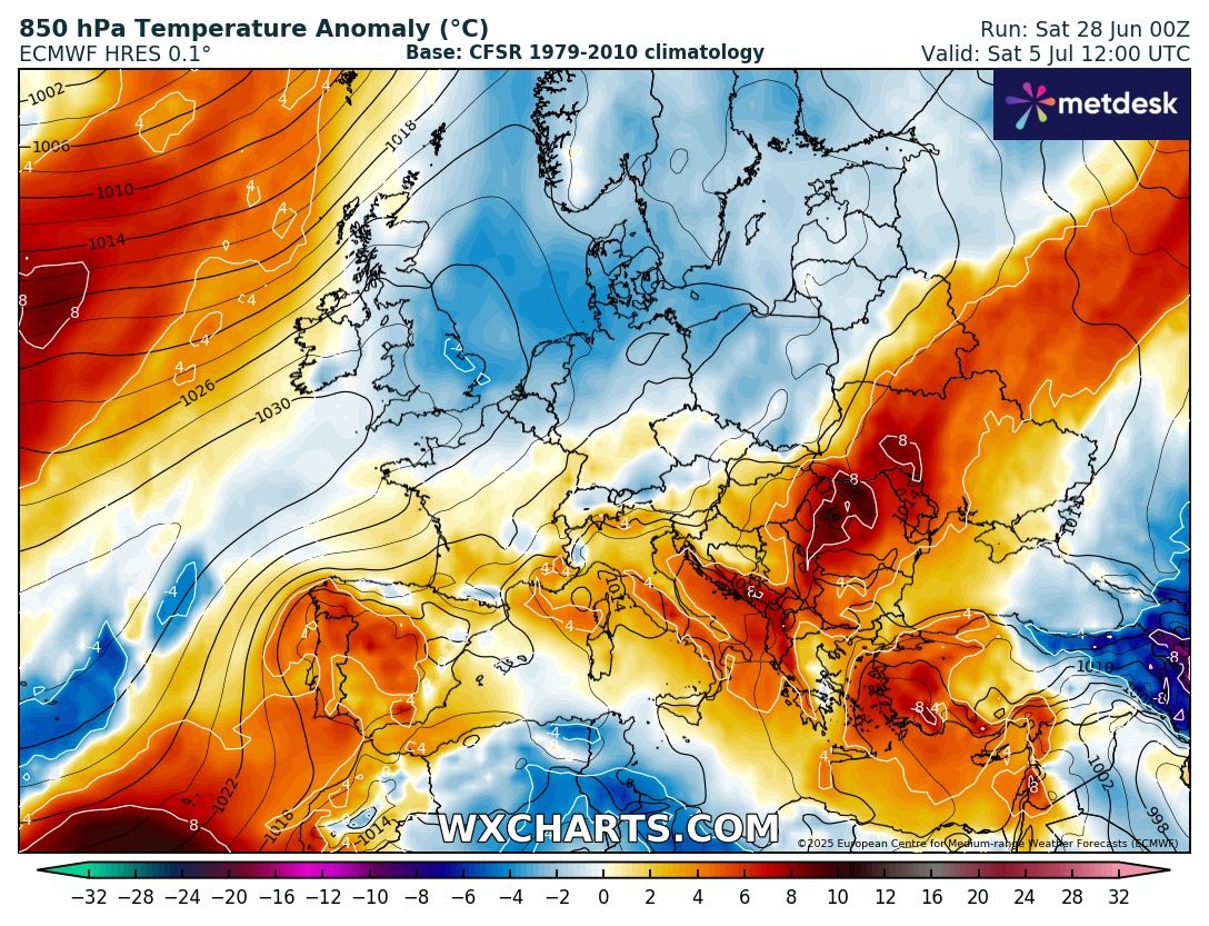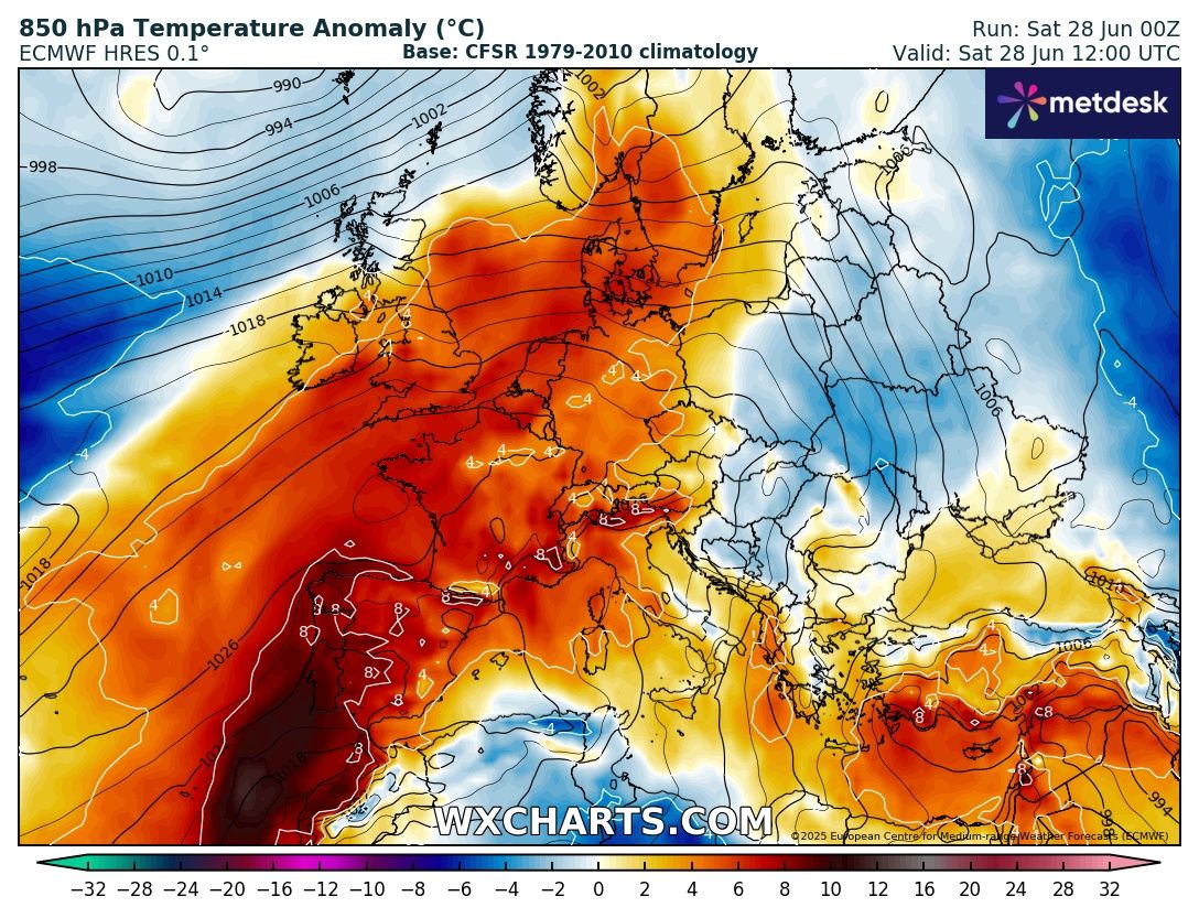 Nyugat-Európa felett jelenleg anticiklon alakítja az időjárást, az Ibériai-félszigeten a csúcshőmérséklet helyenként a 40 fokot is meghaladja. Közép-Európában kissé visszaesett a hőmérséklet, de a következő napokban felénk is jelentős melegedésre számíthatunk.