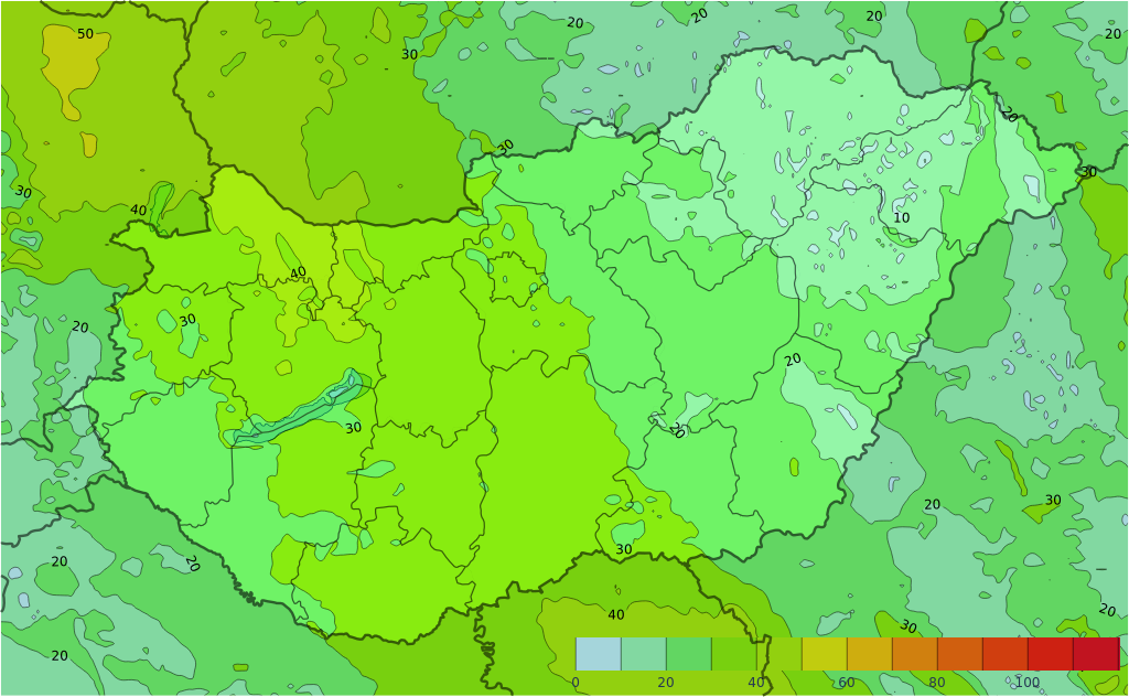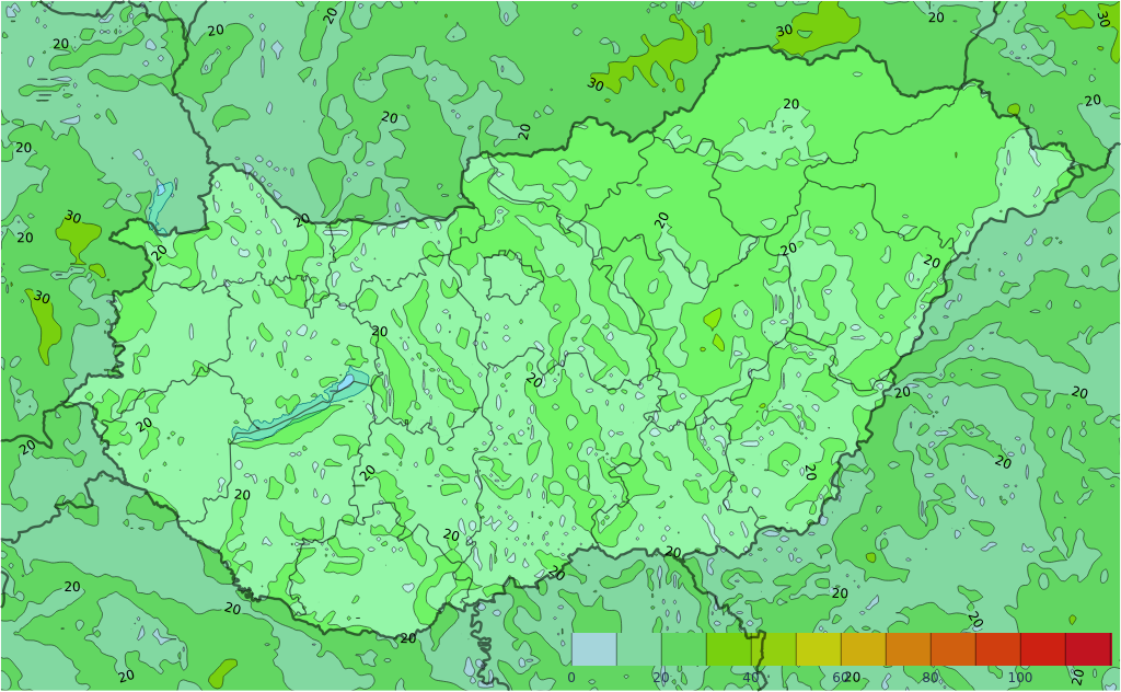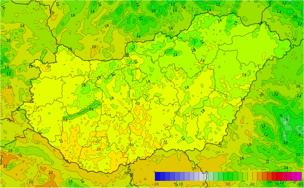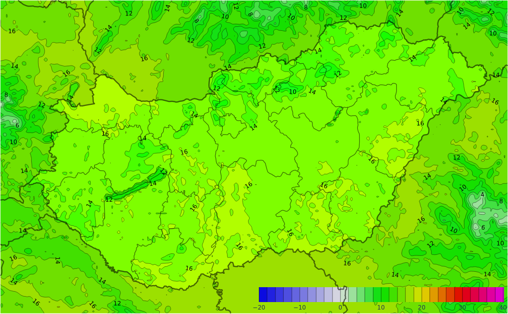 Március 13. Péntekre a kép drasztikusan megváltozik. Nyugat-Európa (Brit-szigetek, Franciaország) felett már kékbe fordul a térkép, ami az átlag alatti hőmérsékletet jelzi. A meleg levegő beszorul a kontinens délkeleti és keleti szegleteibe. Egy markáns hidegfront vonala rajzolódik ki, ami épp ekkor éri el Közép-Európát. Magyarország még épp a meleg oldalon van (narancssárga zóna), de a határainknál már ott toporog a lehűlés. Ebben az időszakban megerősödik a szél, és a nyugati országrészben már érezhetően visszaeshet a hőmérséklet, miközben keleten még tarthatja magát az enyhe idő.