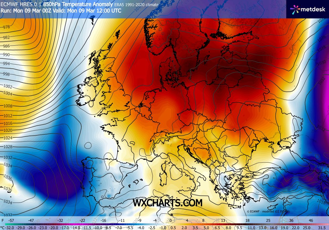 Március 9. Hétfő. Európa középső, északi és keleti területei felett egy hatalmas kiterjedésű, pozitív hőmérsékleti anomália látható. Skandináviában és Közép-Európában helyenként 8-12 °C-kal mérnek melegebbet az ilyenkor szokásosnál. Csak az Atlanti-óceán felett és Oroszországban gyülekezik a hideg utánpótlás. Hazánkban is jóval melegebb az idő a szokásosnál. Az ország egész területén verőfényes napsütést jelent.
