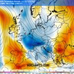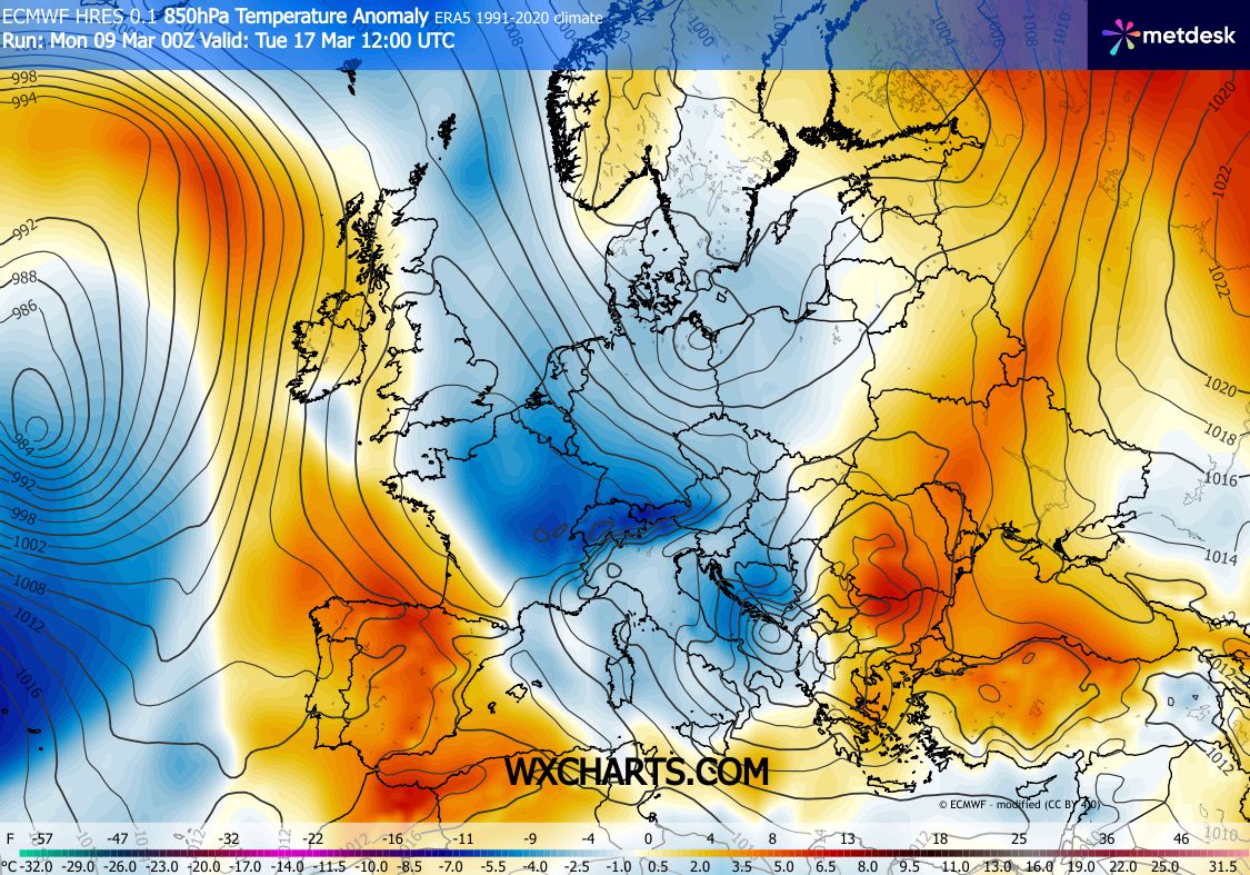 Március 17. Kedd. A fordulat teljessé válik. Európa szívét – Németországtól az Alpokon át egészen a Balkánig negatív anomália borítja be. Ez a sarkvidéki eredetű légtömeg 4-8°C-kal viszi az átlag alá a hőmérsékletet. A meleg teljesen kiszorul Oroszország és az Atlanti-térség peremére. Magyarországon is hidegebbre fordul az idő. Visszatérhetnek az éjszakai fagyok, és a nappali csúcsértékek is 10 fok alatt maradhatnak. Ez a mezőgazdaság számára kritikus időszak lehet, hiszen a korábbi melegben megindult rügyezést komolyan veszélyeztetheti a hirtelen jött hideg.