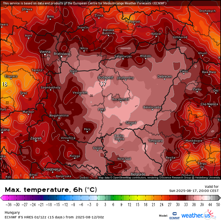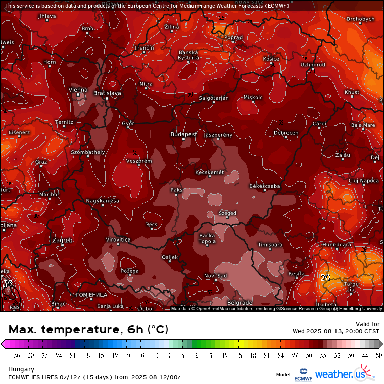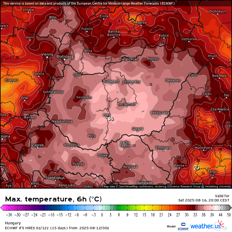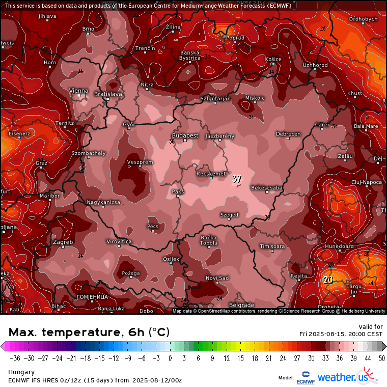 Az alábbi galériában mutatjuk be az ECMWF időjárás előrejelző modell által várt maximumhőmérséklet országos eloszlását a következő hét napban. A képektől jobbra olvasható, hogy melyik napra vonatkozik az előrejelzés.