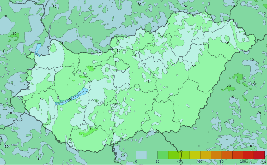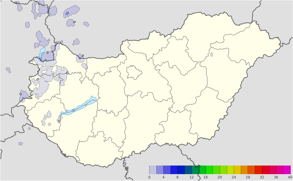 Térképen mutatjuk a havazás várható területi eloszlását, illetve mennyiségét. A térképen a számok a hóvastagságot jelölik cm-ben. A hó várható mennyisége nagyjából lepel- 2 cm lehet, de a Bakonyban ennél több is eshet.
