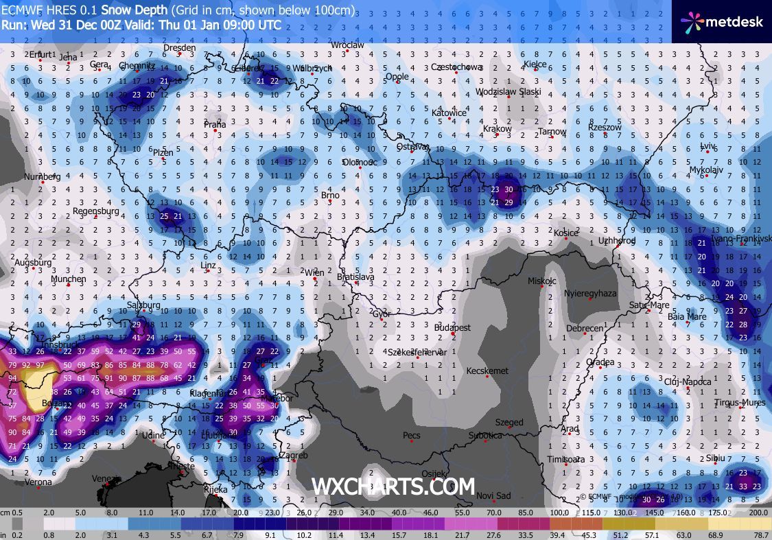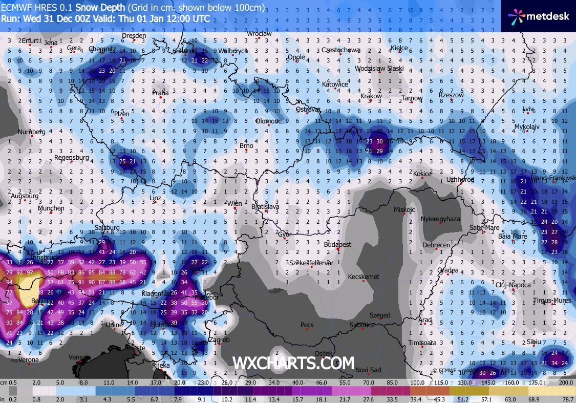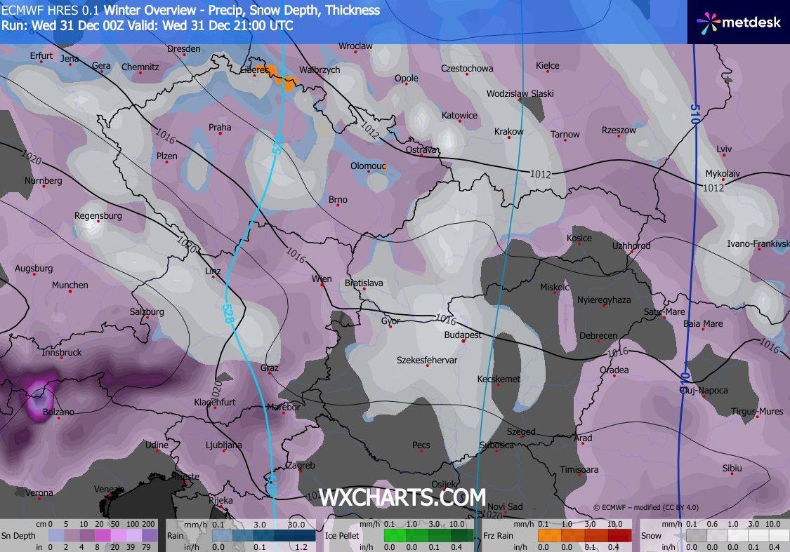 Szerdán kora délutánig csak kevés helyen lehet hózápor, majd késő délutántól, estétől az Észak-Dunántúlon várható havazás, hózáporok. Az északnyugati szelet gyakran erős, elsősorban a Dunántúli-középhegységben viharos lökések kísérhetik. Estére Sopron és a Fertő térségét leszámítva csillapodik a légmozgás. Éjjel a hőmérséklet fagypont alá csökken. Újév napján délnyugat felől szakadozni kezd a felhőzet, a hószállingózás is délelőtt megszűnik, délutánra az ország nagy részén ismét kisüt a nap.