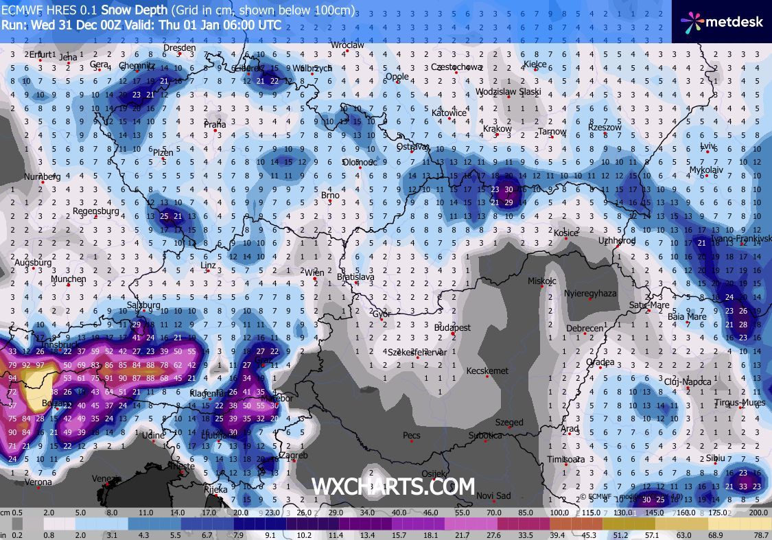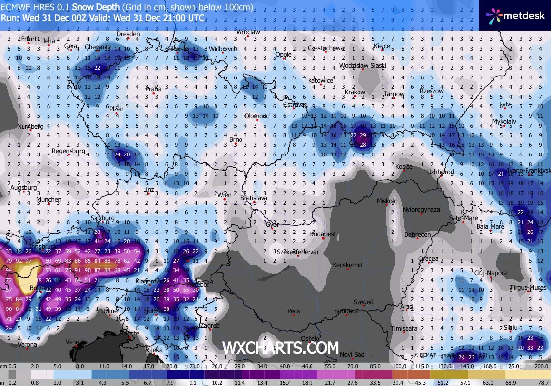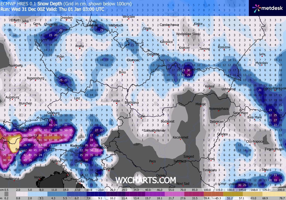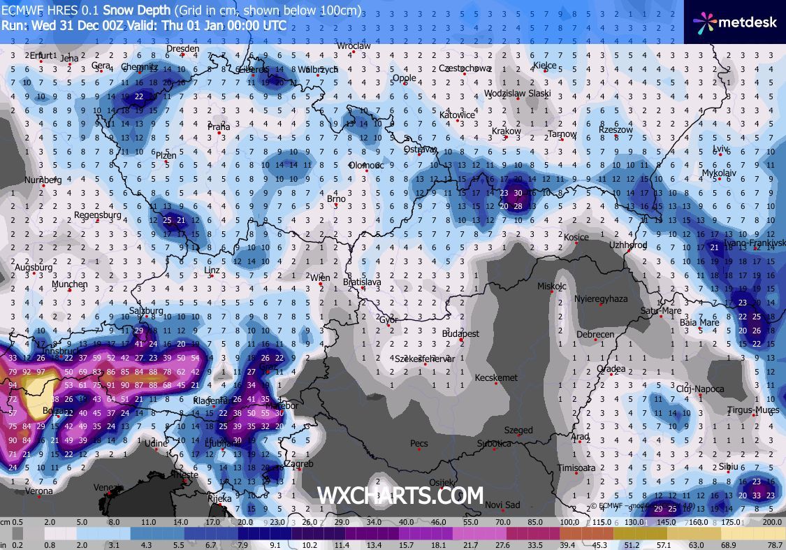 Szerdán kora délutánig csak kevés helyen lehet hózápor, majd késő délutántól, estétől az Észak-Dunántúlon várható havazás, hózáporok. Az északnyugati szelet gyakran erős, elsősorban a Dunántúli-középhegységben viharos lökések kísérhetik. Estére Sopron és a Fertő térségét leszámítva csillapodik a légmozgás. Éjjel a hőmérséklet fagypont alá csökken. Újév napján délnyugat felől szakadozni kezd a felhőzet, a hószállingózás is délelőtt megszűnik, délutánra az ország nagy részén ismét kisüt a nap.