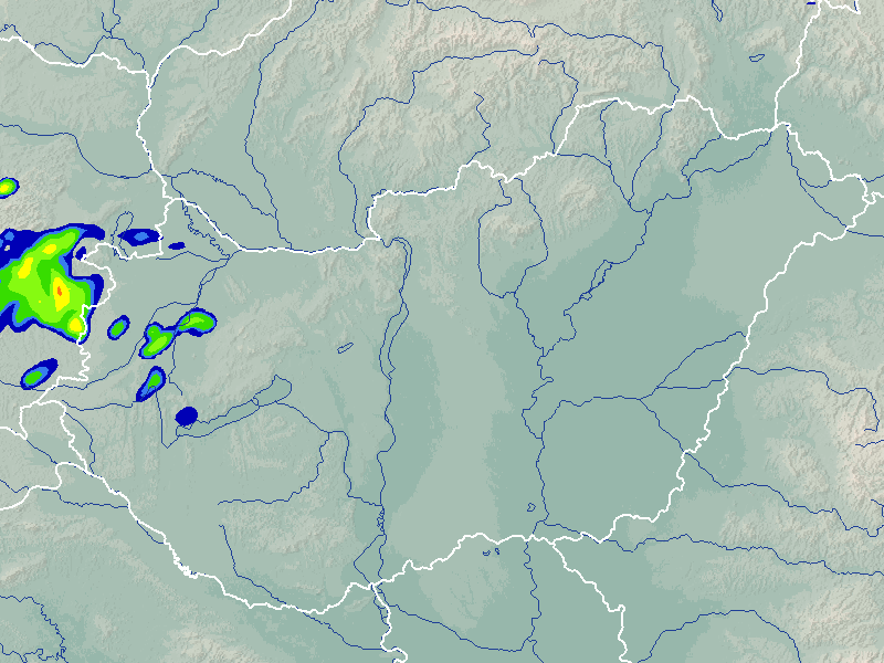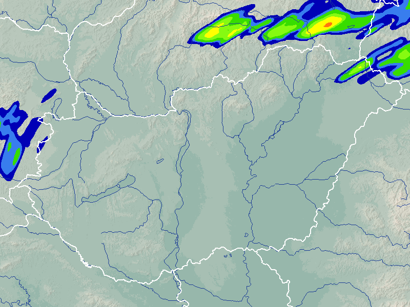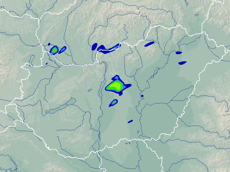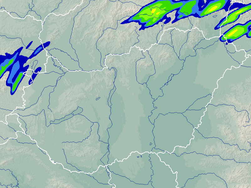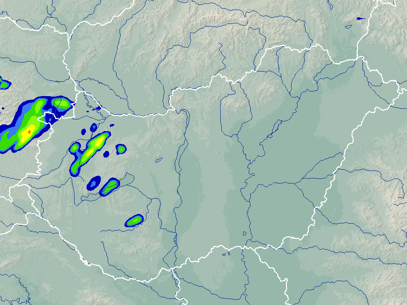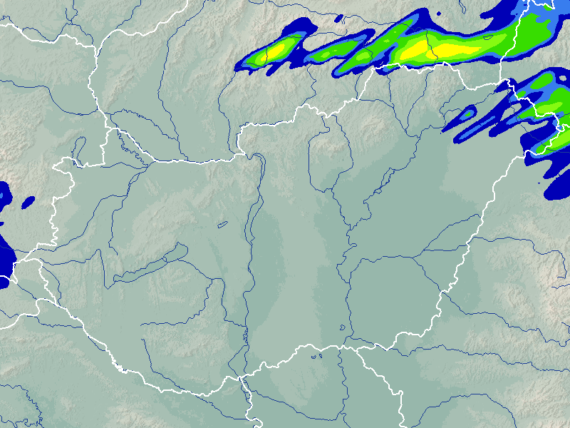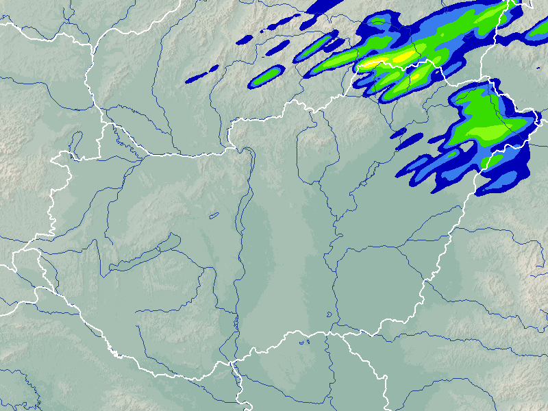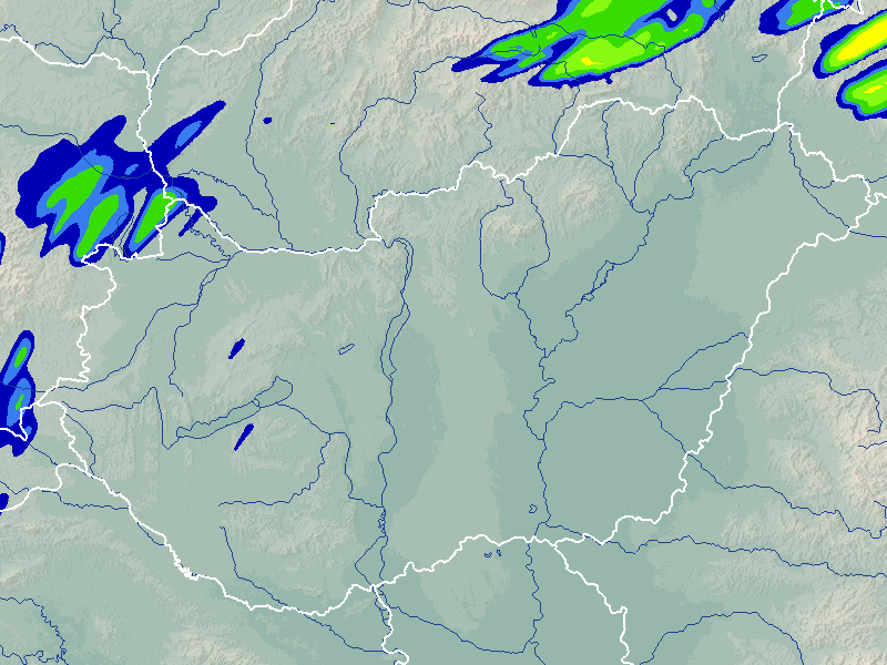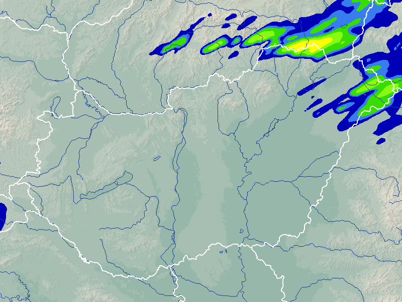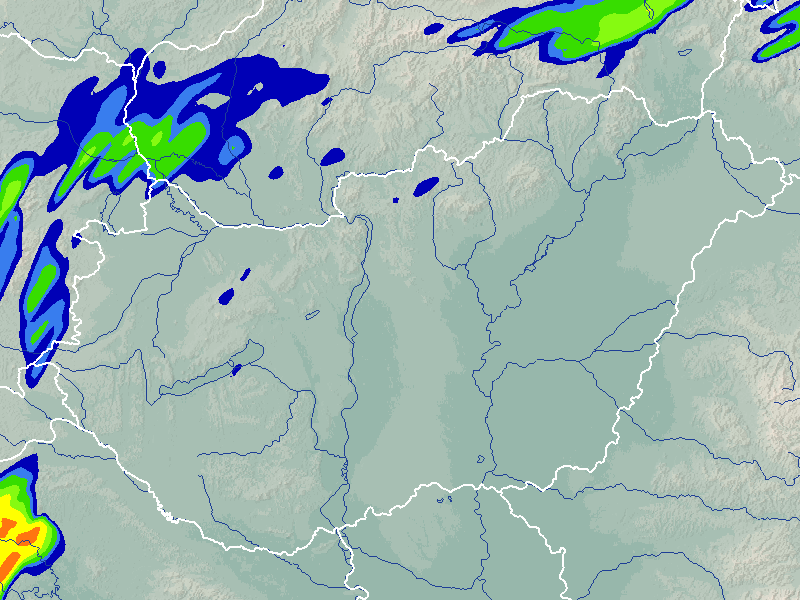 A térkép a csapadék intenzitását jelöli. A kékes árnyalatok gyenge, a zöldes közepes, míg a sárga és piros színek erős csapadékintenzitást jeleznek.