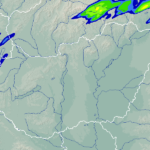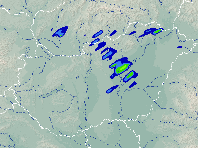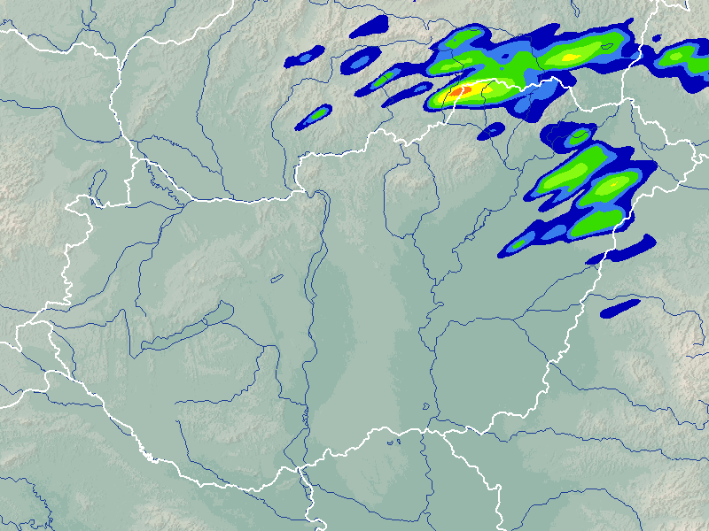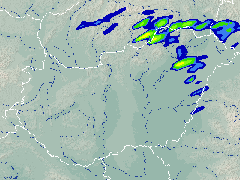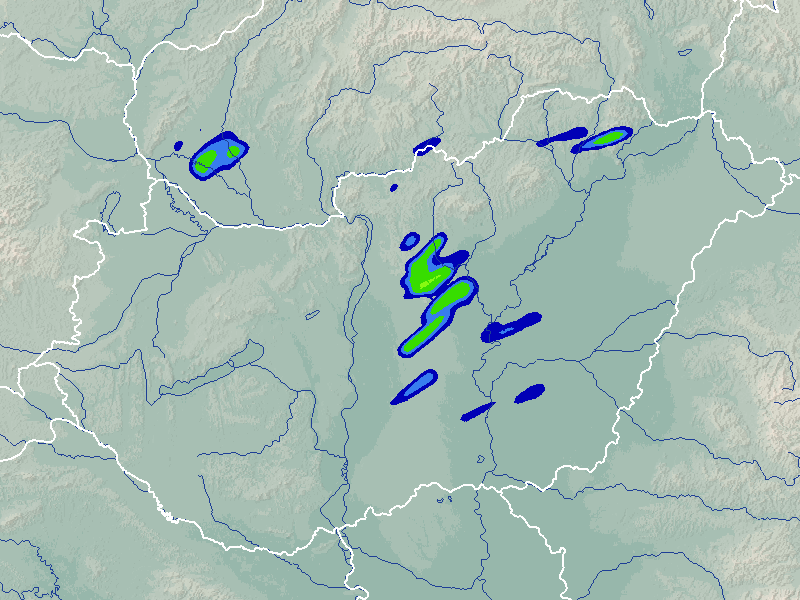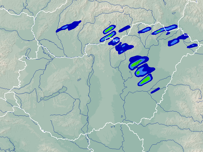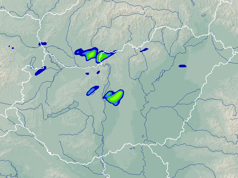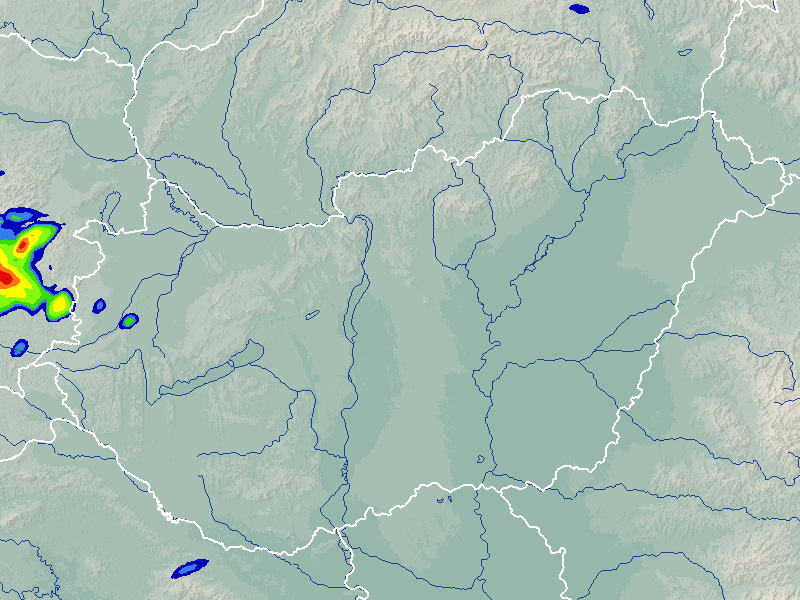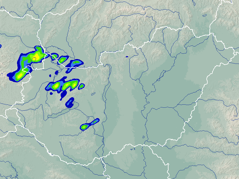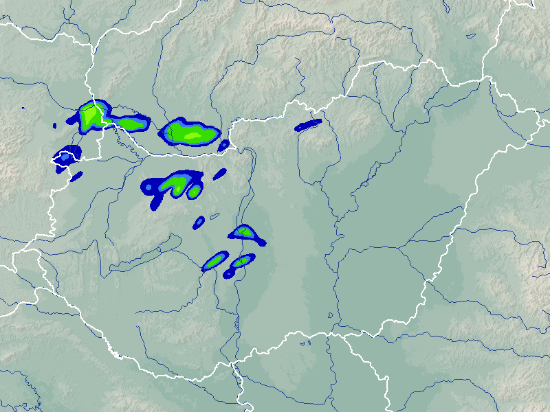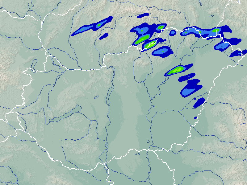 A térkép a csapadék intenzitását jelöli. A kékes árnyalatok gyenge, a zöldes közepes, míg a sárga és piros színek erős csapadékintenzitást jeleznek.