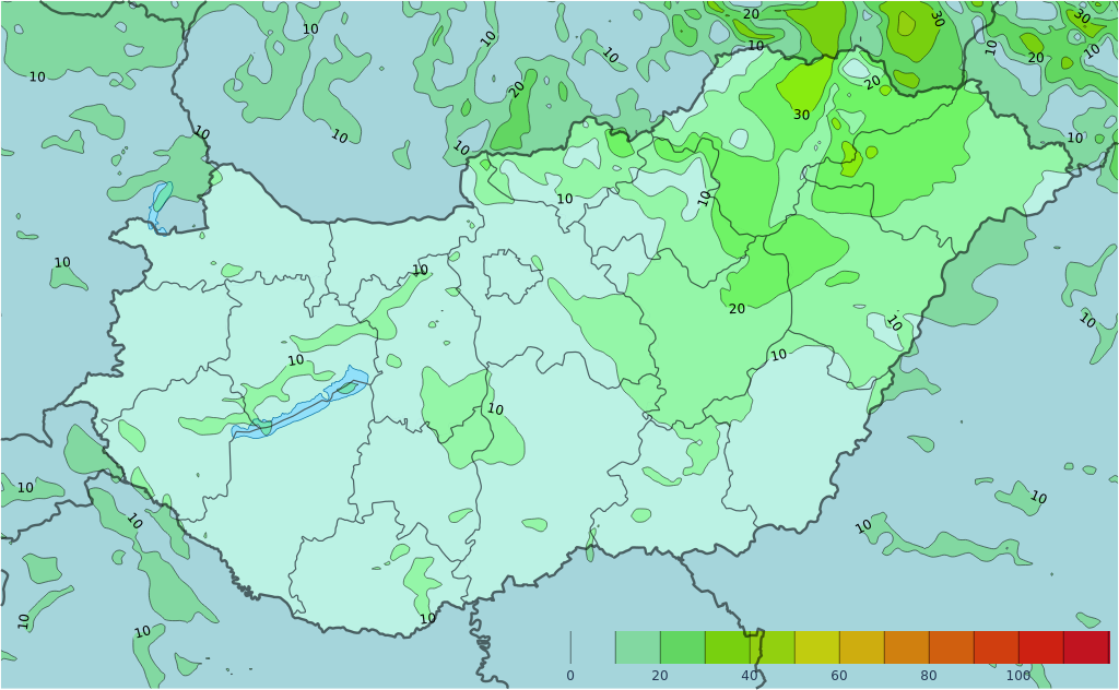 Az ECMWF időjárás-előrejelző modellje alapján vasárnap késő estig (23:00) a következő mennyiségek várhatók a leginkább érintett területeken: