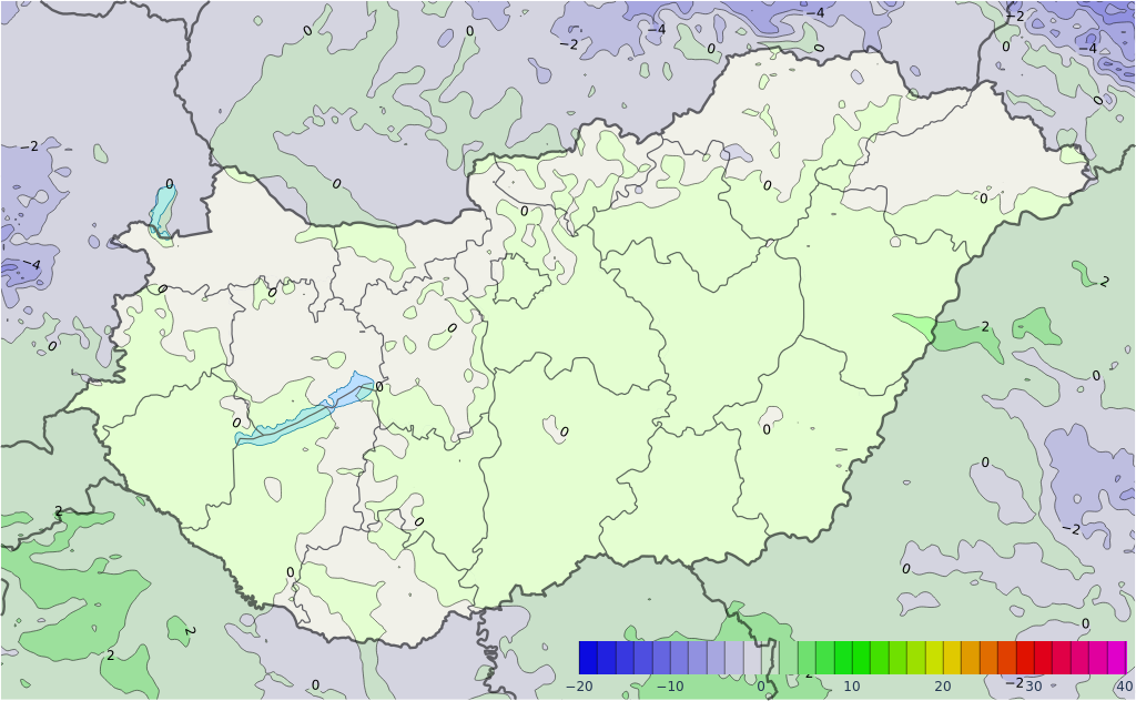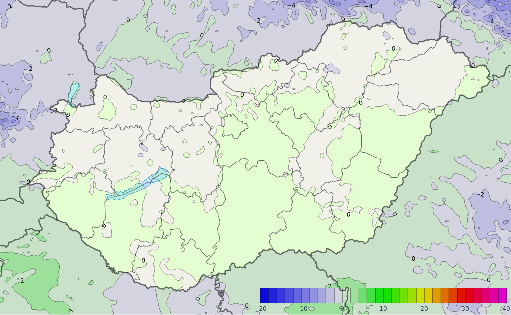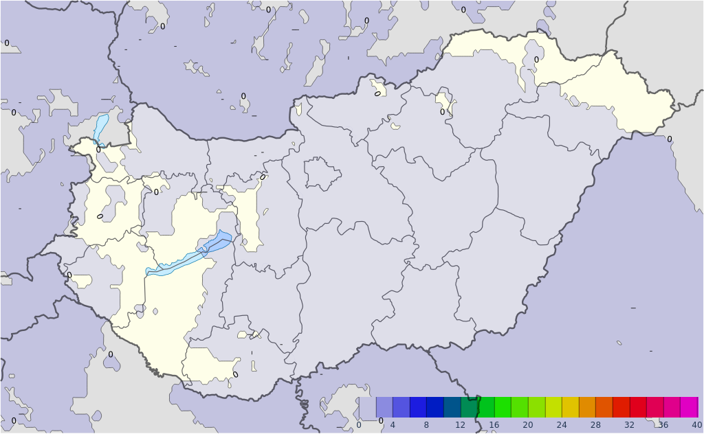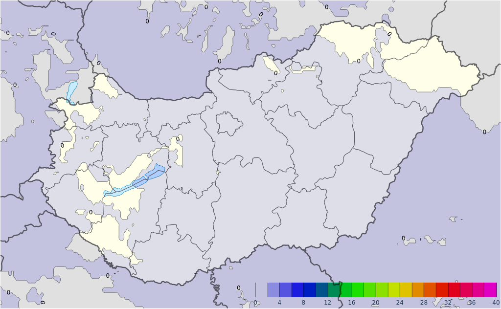 3. Délnyugat és egyéb hegyvidékek: A Mecsekben és a délnyugati határszélen (Zala, Somogy dombjai) a világosabb kék árnyalatok 1-3 cm havat ígérnek, ami vékony lepelként fedheti be a tájat az esőzések után.