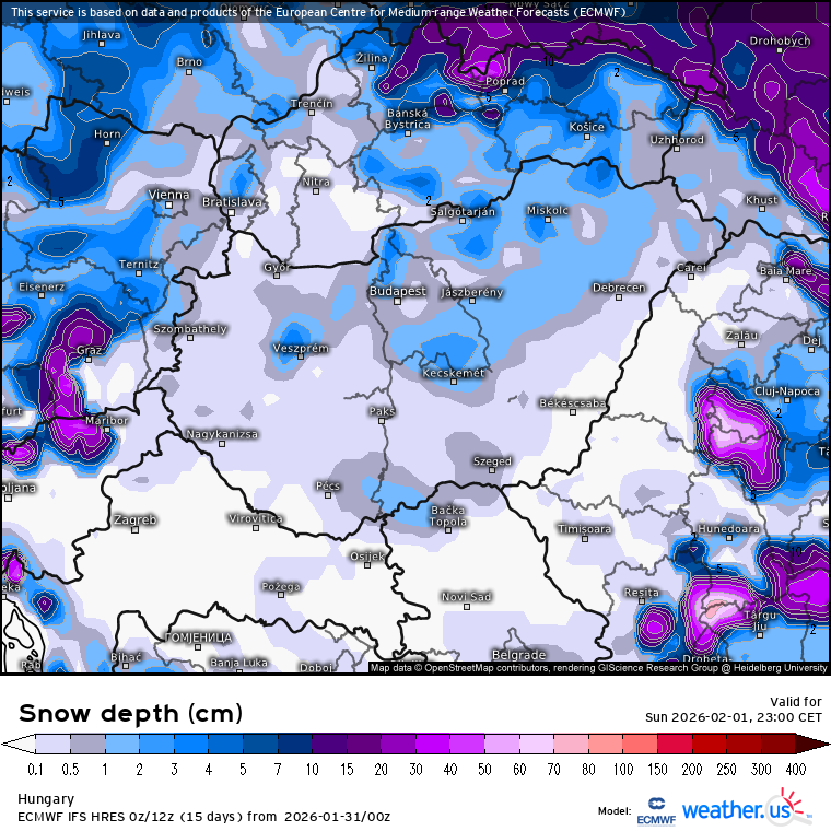 Összességében az Alföldön csak nyomokban (0-2 cm) várható hó, a hegyvidéki és északi tájakon viszont markáns téliesedés zajlik a hétvége folyamán, helyenként szánkózásra is alkalmas, 3-8 cm-es hóvastagsággal.