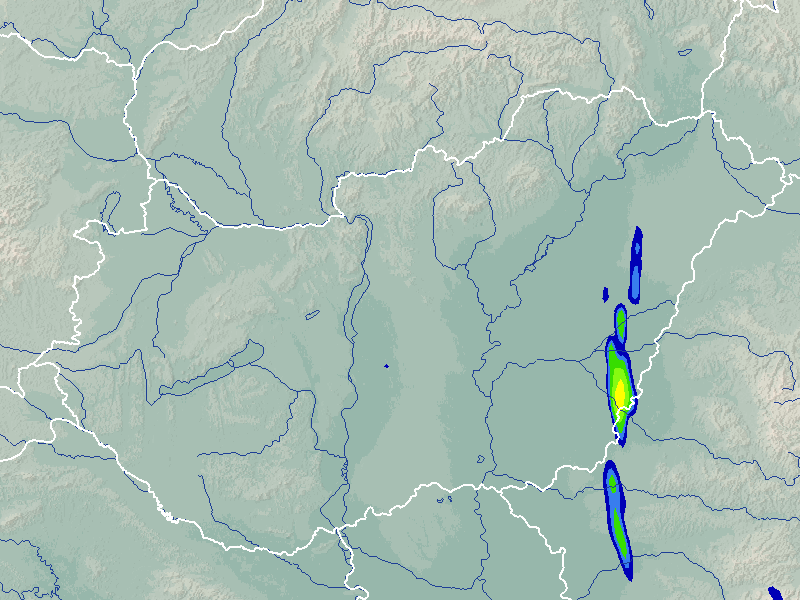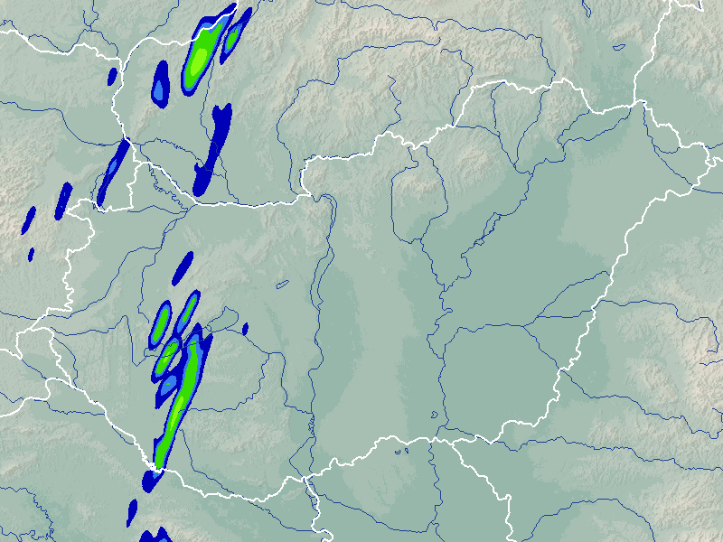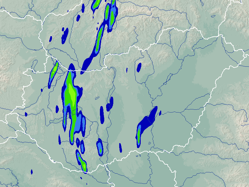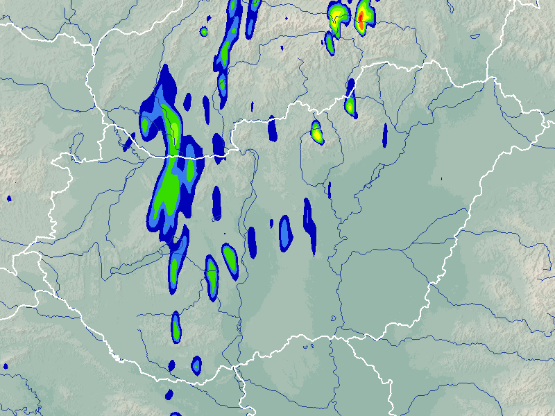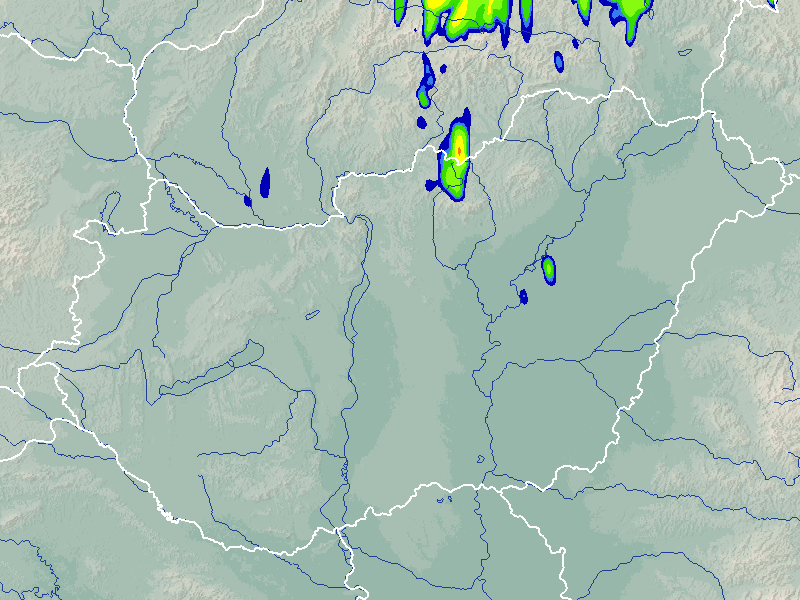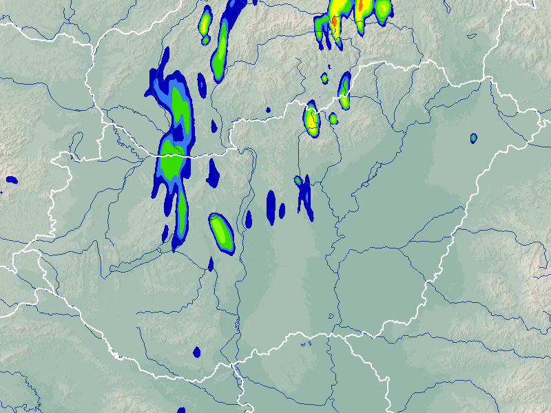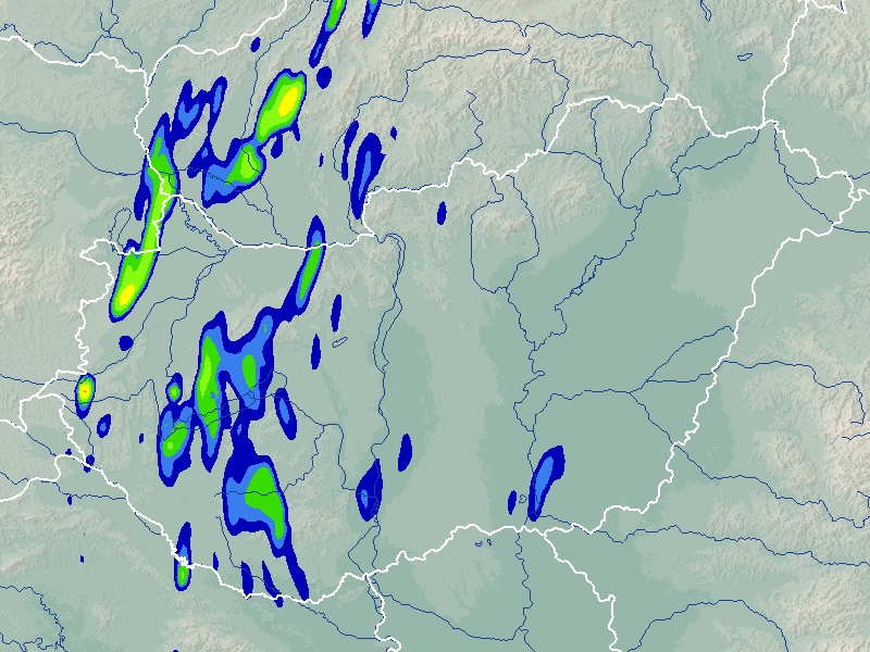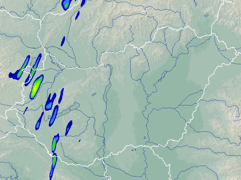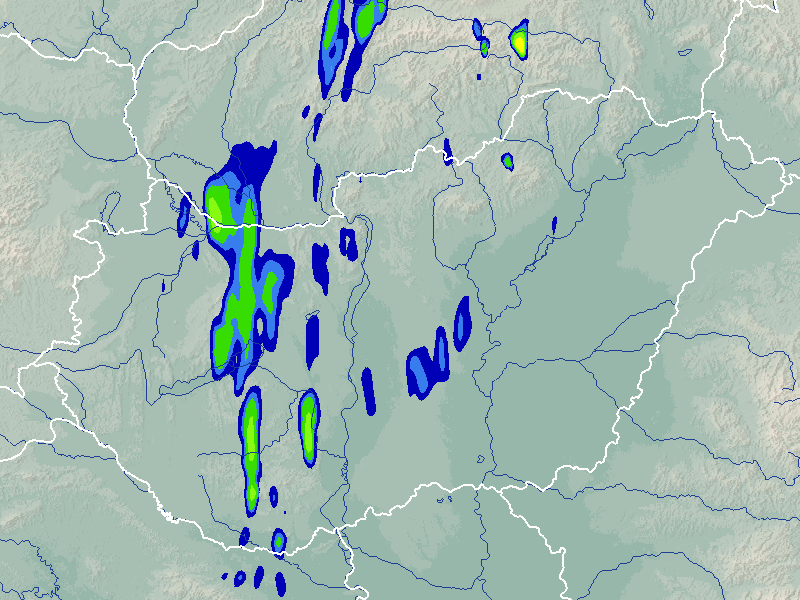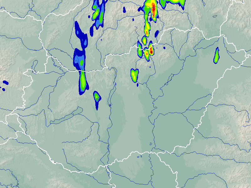 A térképek a csapadék intenzitását jelölik. A kékes árnyalatok gyenge, a zöldes közepes, míg a sárga és piros színek erős csapadékintenzitást jeleznek. Záporos csapadék miatt a gócok elhelyezkedése változhat, de a tendencia így is jól megfigyelhető.