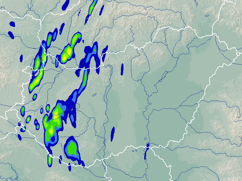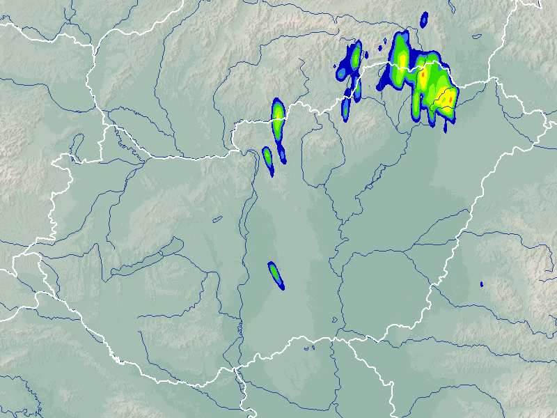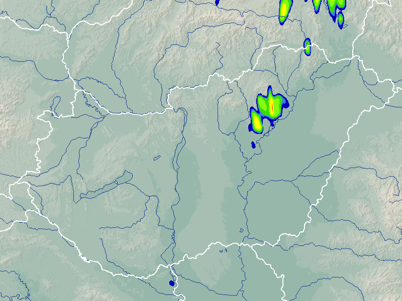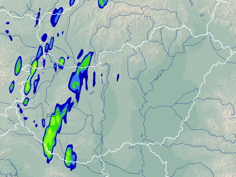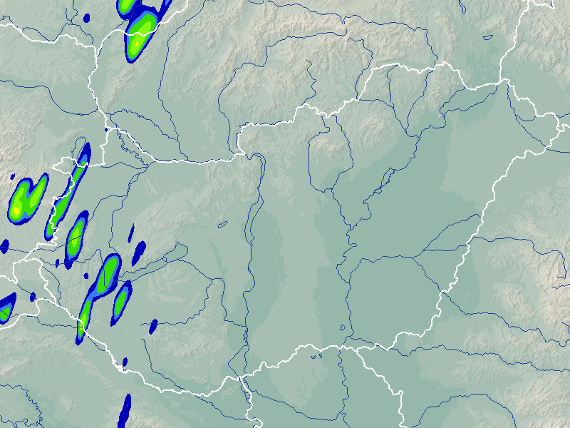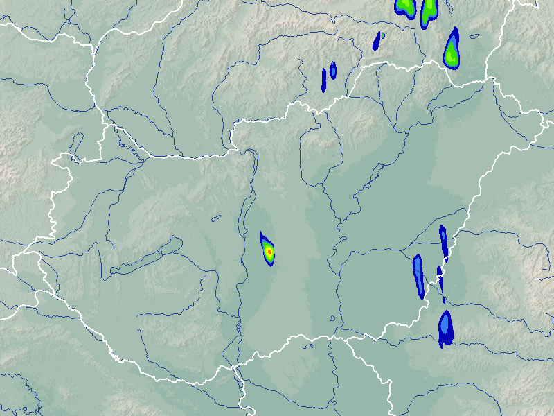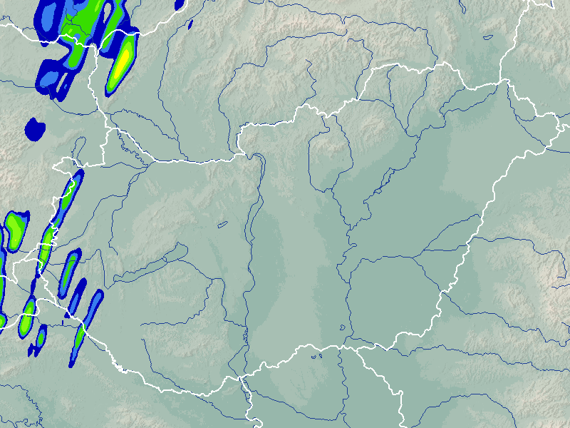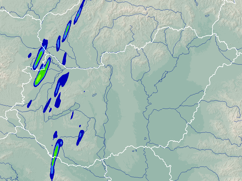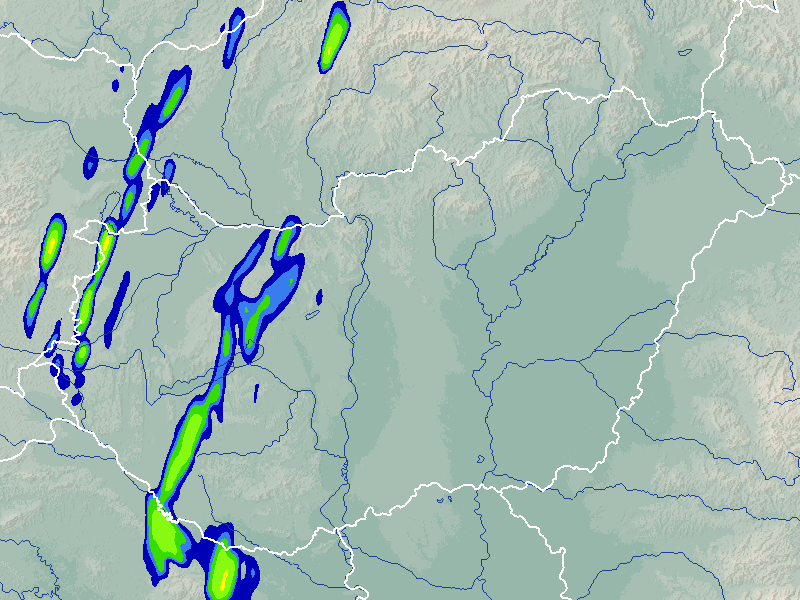 A térképek a csapadék intenzitását jelölik. A kékes árnyalatok gyenge, a zöldes közepes, míg a sárga és piros színek erős csapadékintenzitást jeleznek. Záporos csapadék miatt a gócok elhelyezkedése változhat, de a tendencia így is jól megfigyelhető.