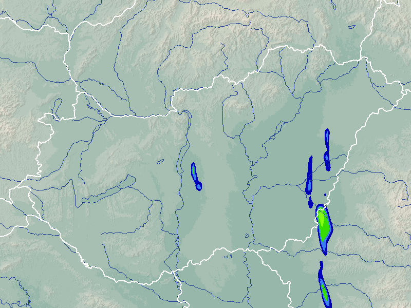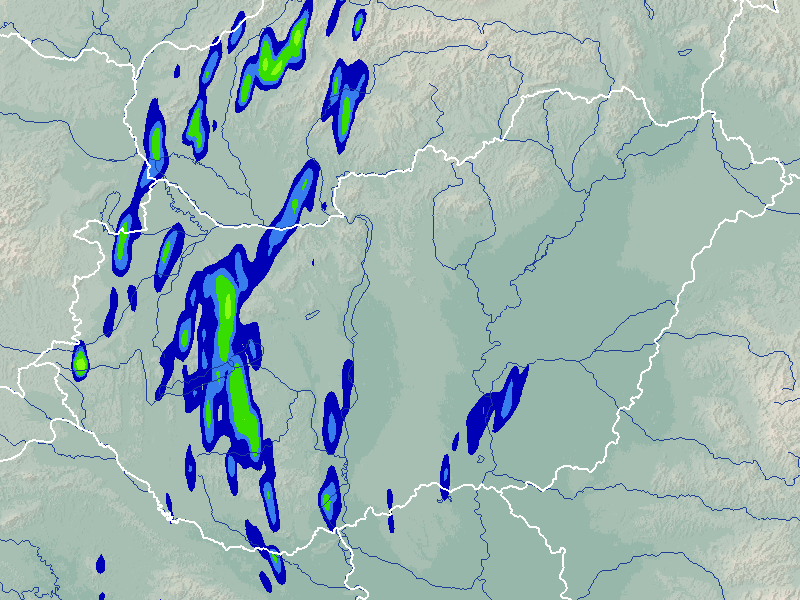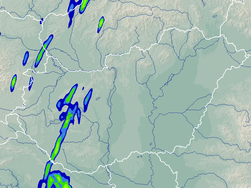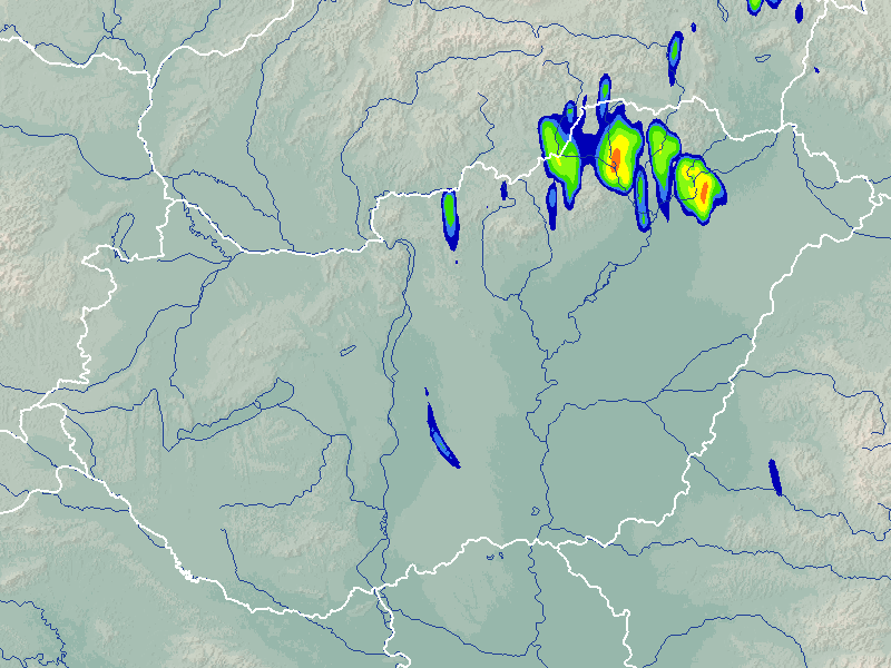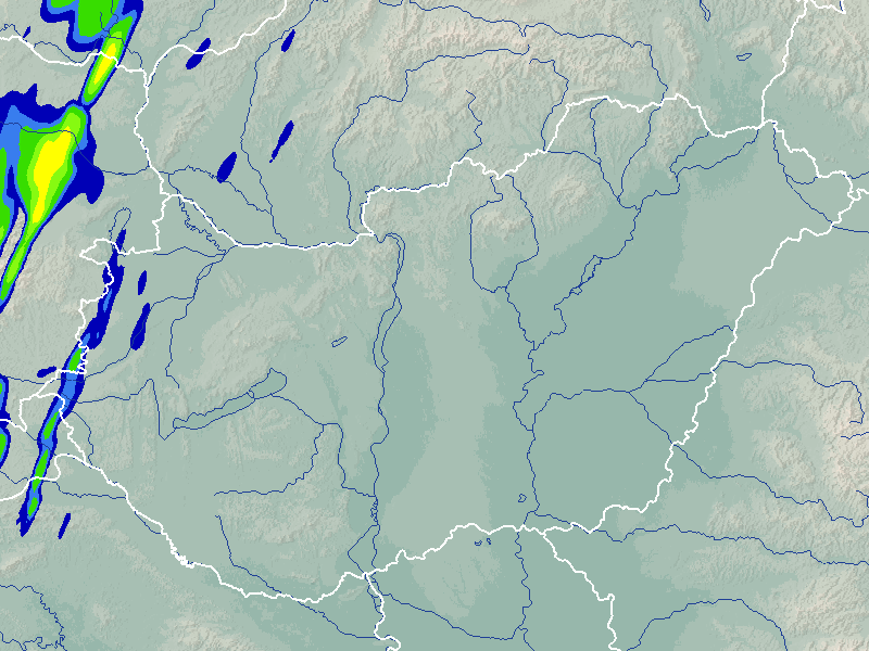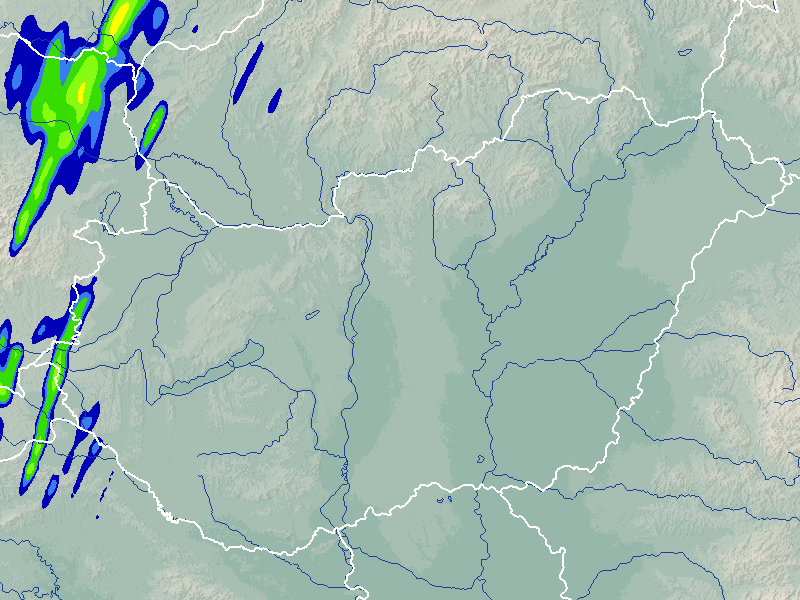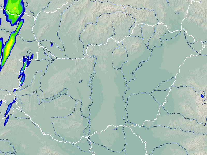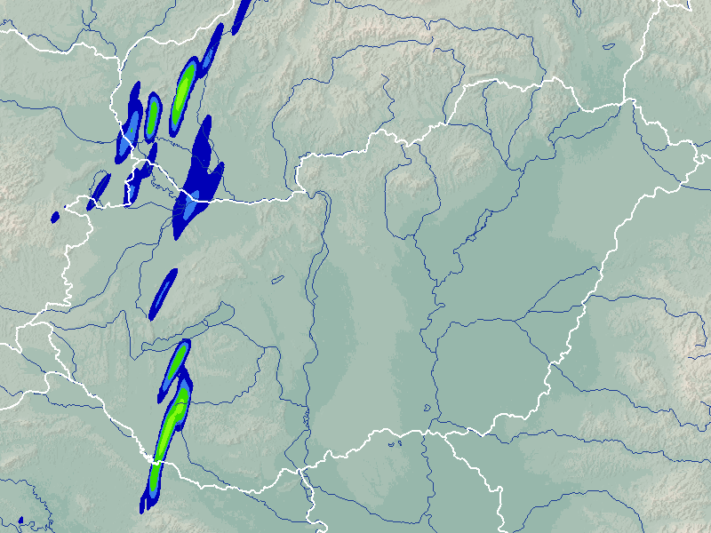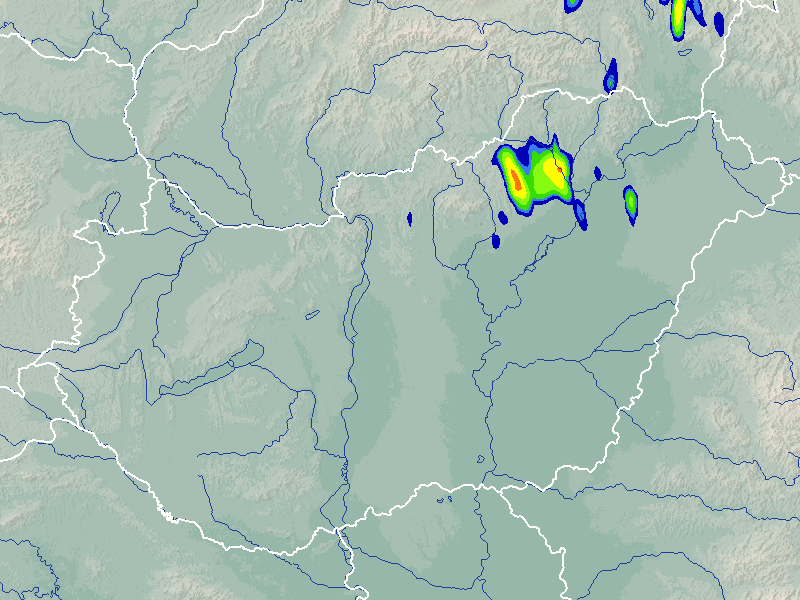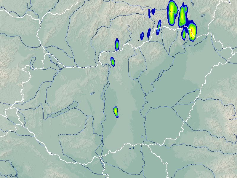 A térképek a csapadék intenzitását jelölik. A kékes árnyalatok gyenge, a zöldes közepes, míg a sárga és piros színek erős csapadékintenzitást jeleznek. Záporos csapadék miatt a gócok elhelyezkedése változhat, de a tendencia így is jól megfigyelhető.