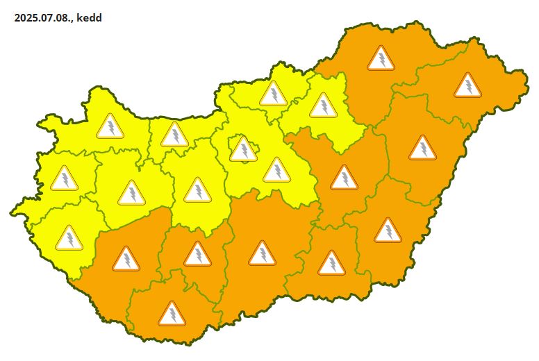 Az éjszakai órákban érkezett zivatarrendszer a délelőtti órákban tovább helyeződik északkeleti irányba, jellemzően intenzív csapadék, viharos széllökés és kisebb méretű jég kíséretében. A késő délelőtti óráktól dél, délnyugat felől akár több hullámban is intenzív zivatarok képződhetnek , illetve érhetik el az országot viharos széllökések (60-90 km/h), jégeső (~1-2 cm) és lokálisan felhőszakadás kíséretében (~30 mm). Kiemelten a déli óráktól főként az ország déli részein és a Tiszántúlon a heves zivatarok valószínűsége is megnő (>90-100 km/h széllökések, jégeső >2 cm és felhőszakadás >30 mm). A cellák összeszerveződéséhez is kedvezőek a feltételek, kiemelten az Alföldön, így ott egy zivatarrendszer kialakulását sem lehet kizárni nagyobb területet érintő károkozó széllökések kíséretében. Az esetleges zivatarrendszer pontos tér és időbeli lefolyása jelentős bizonytalansággal terhelt. A zivatarok veszélyes kísérőjelenségei miatt a Hungaromet másodfokú figyelmeztetés adott ki Somogy, Baranya, Tolna, Bács-Kiskun, Jász-Nagykun-Szolnok, Csongrád-Csanád, Békés, Hajdú-Bihar, Borsod-Abaúj-Zemplén és Szabolcs-Szatmár-Bereg vármegyére. Győr-Moson-Sopron, Vas, Zala, Veszprém, Komárom-Esztergom, Fejér, Pest, Nógrád és Heves vármegyében pedig elsőfokú figyelmeztetés érvényes zivatarok veszélye miatt. Felhőszakadás miatt Zala, Somogy, Baranya, Tolna, Bács-Kiskun, Jász-Nagykun-Szolnok, Csongrád-Csanád, Békés, Hajdú-Bihar, Borsod-Abaúj-Zemplén és Szabolcs-Szatmár-Bereg vármegyében érvényes elsőfokú figyelmeztetés.